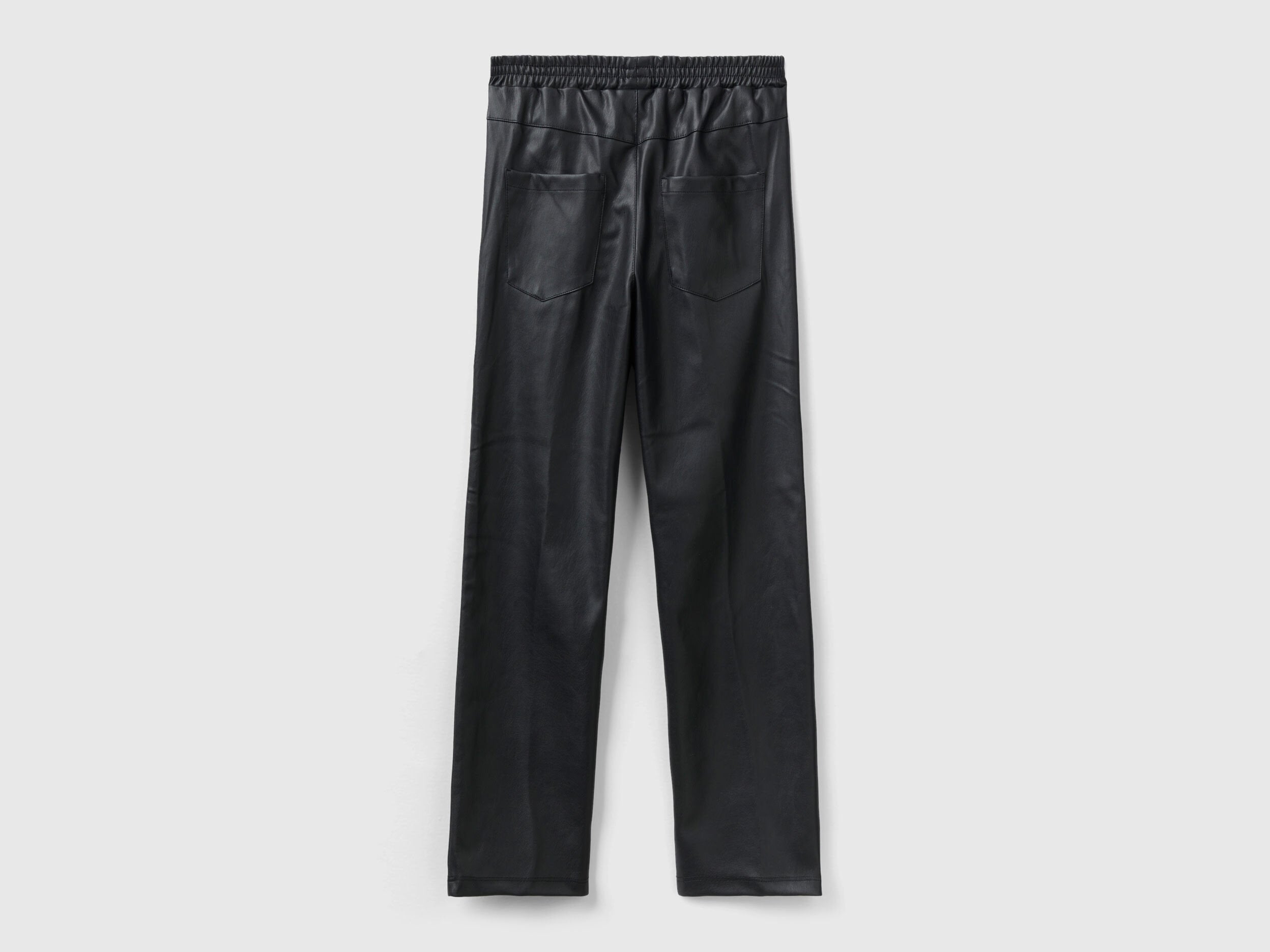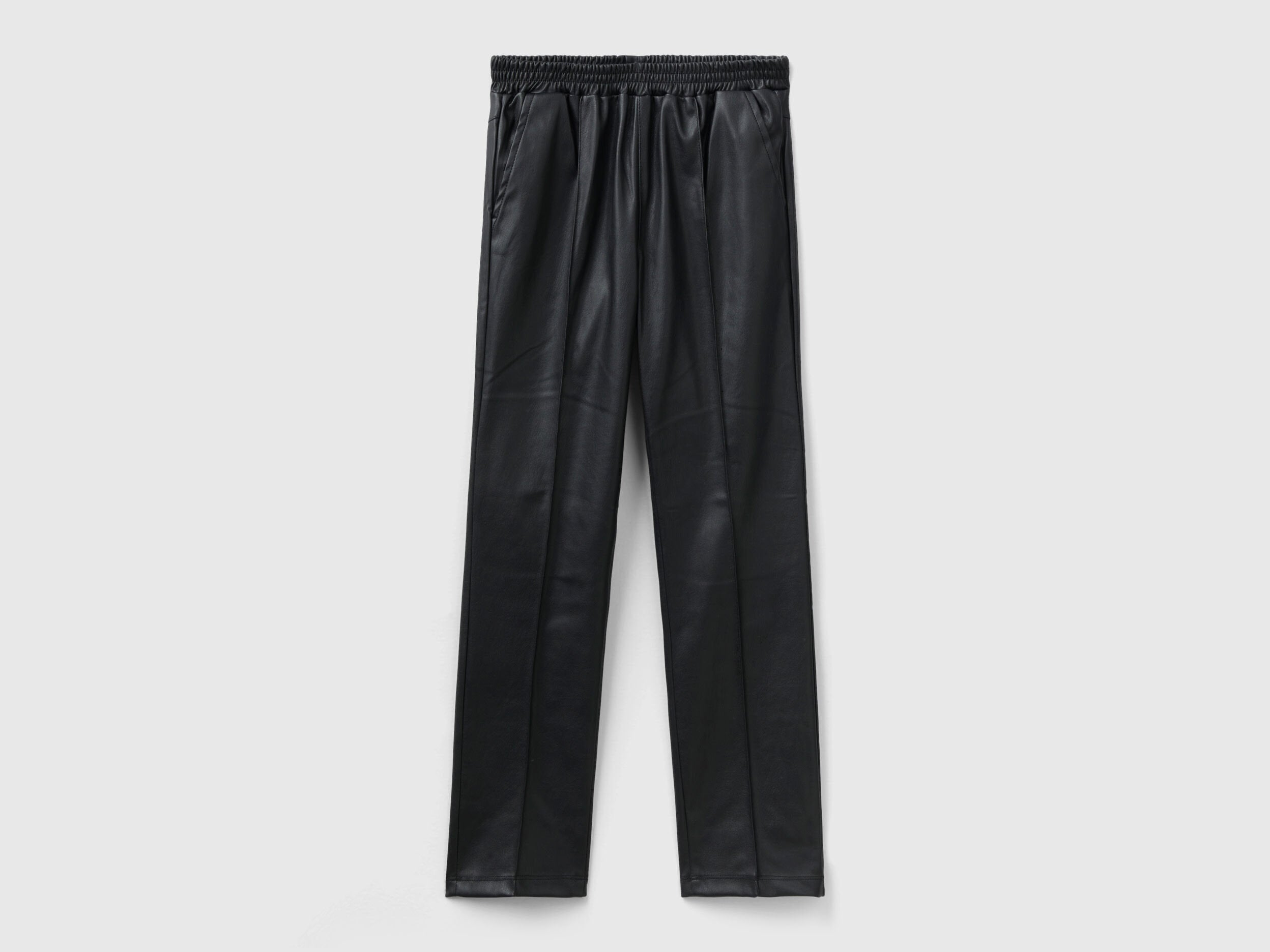 Long trousers in imitation leather fabric with a skinny fit. Stretch waist, front pockets and small pockets on the back. For trendy and feminine combos.
