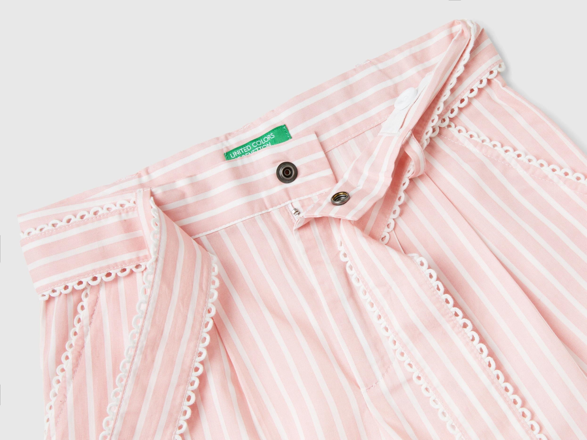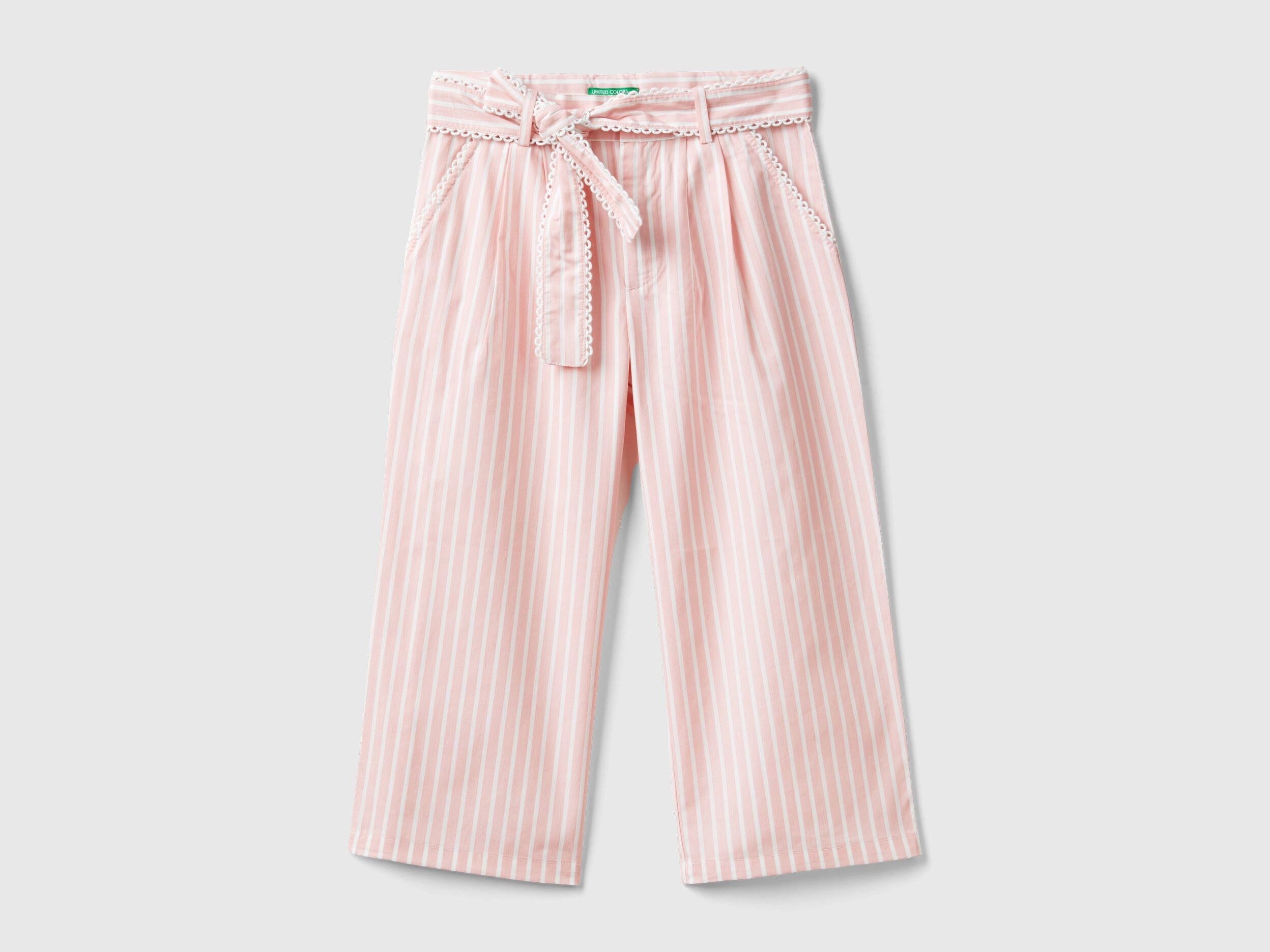 Long trousers in soft pure cotton fabric with yarn-dyed vertical stripes. Palazzo cut with wide leg. Zip and button opening, internal adjustable elastic waist. Front pockets and coordinated sash at the waist with macram_ edge. Romantic and feminine style, also ideal for ceremonies and special occasions.