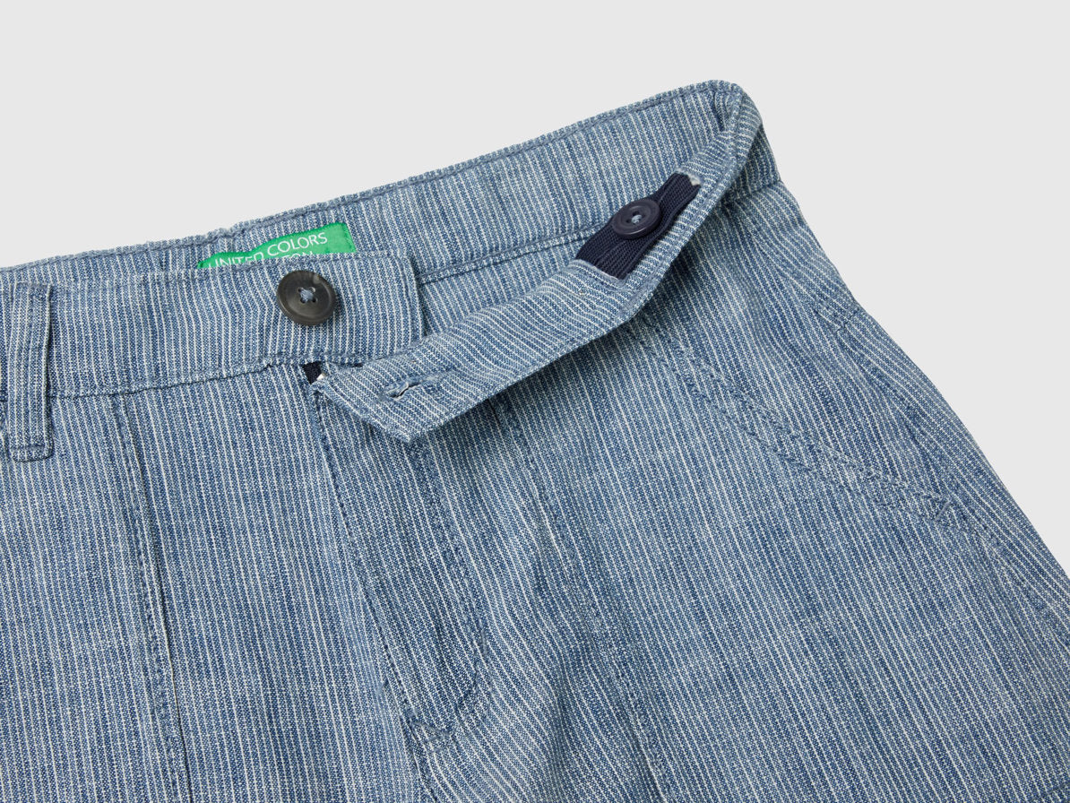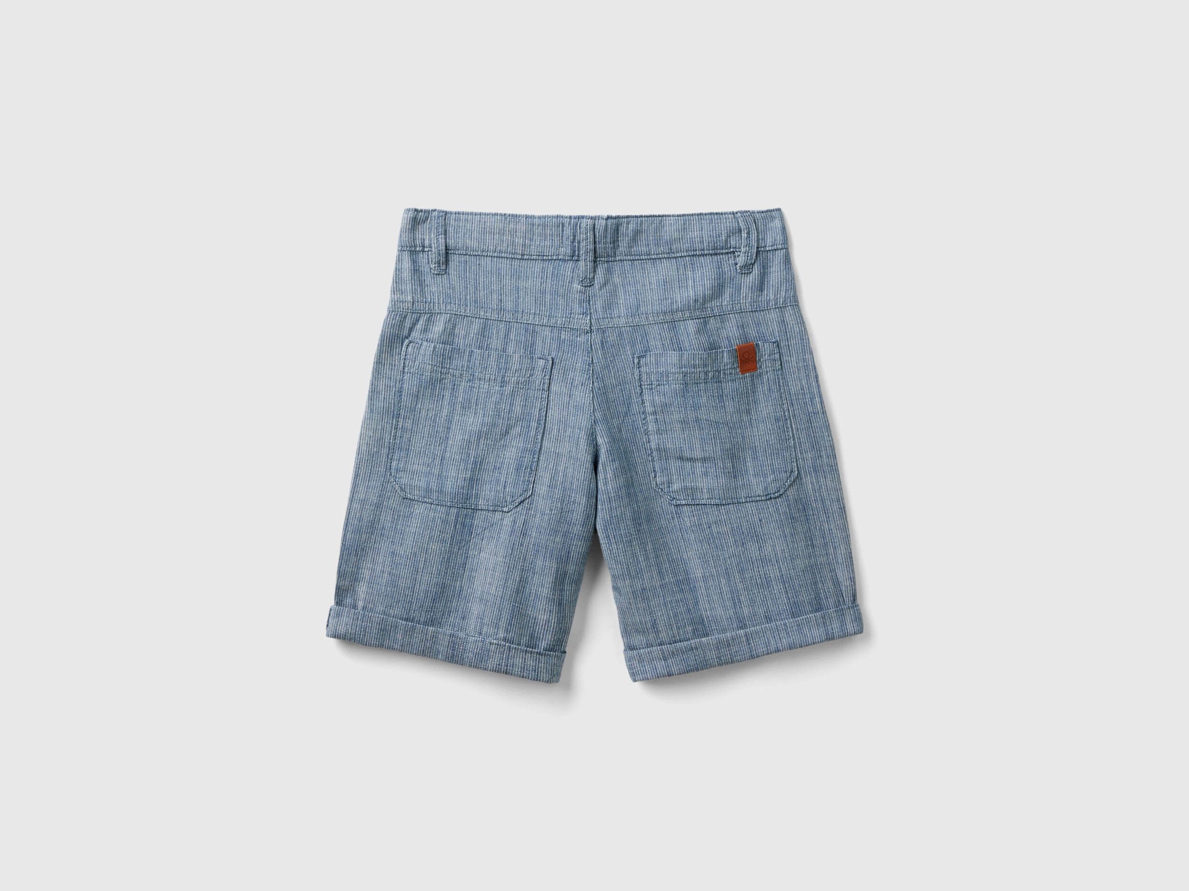 Pure cotton chambray Bermuda shorts with thin stripes. Zip and button opening, large patch pockets on the front and patch pockets on the back. Turn-ups at the hem for an updated casual look.