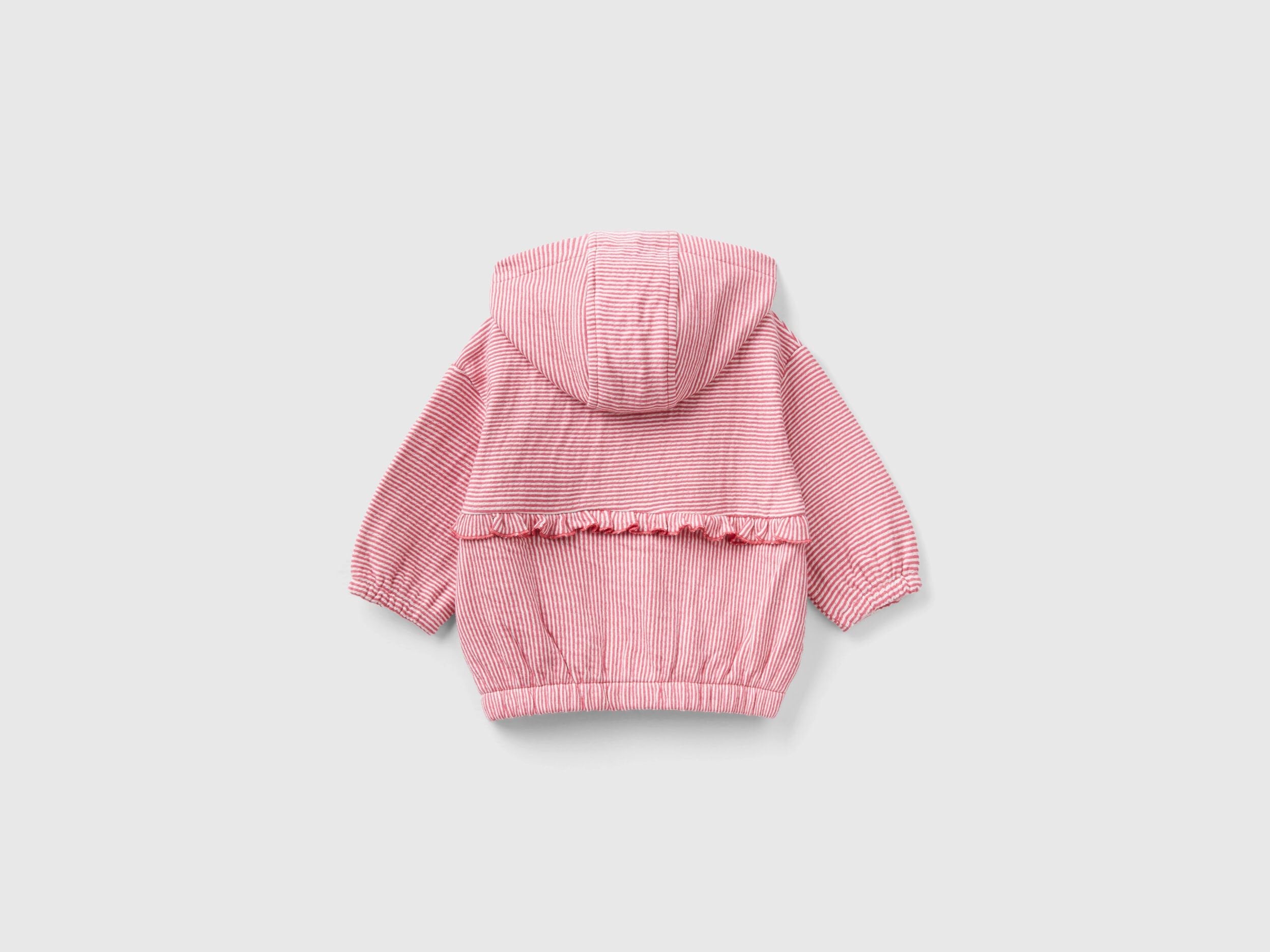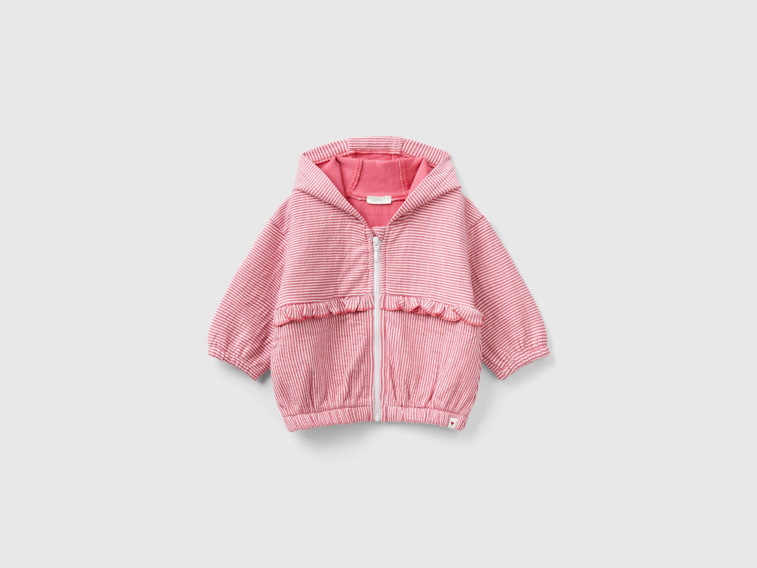 Sweatshirt in pure ribbed cotton with thin yarn dyed stripes, matching interior. Equipped with a hood, long sleeves and ruffles at front and back yoke. Convenient opening with zipper and safety zip guard. Cute and witty.