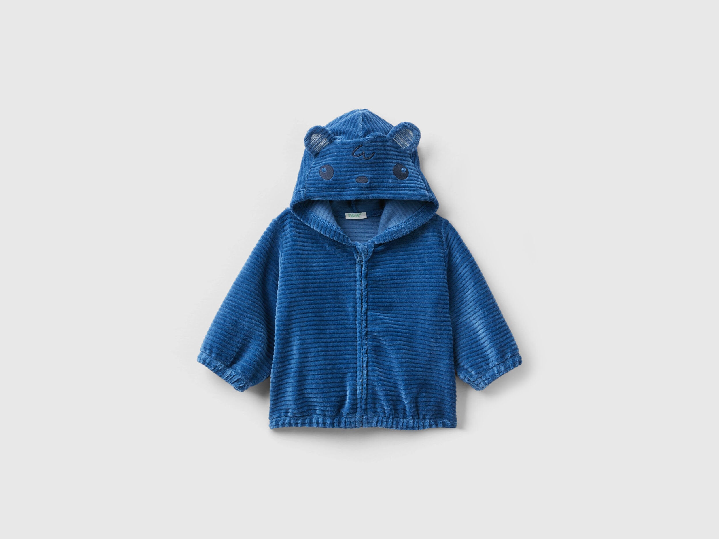 Long sleeve sweatshirt in soft stretch cotton blend chenille. Equipped with a hood with embroidered animal face and small ears applied. Convenient opening with zipper and safety zip guard. Comfortable, versatile and witty.