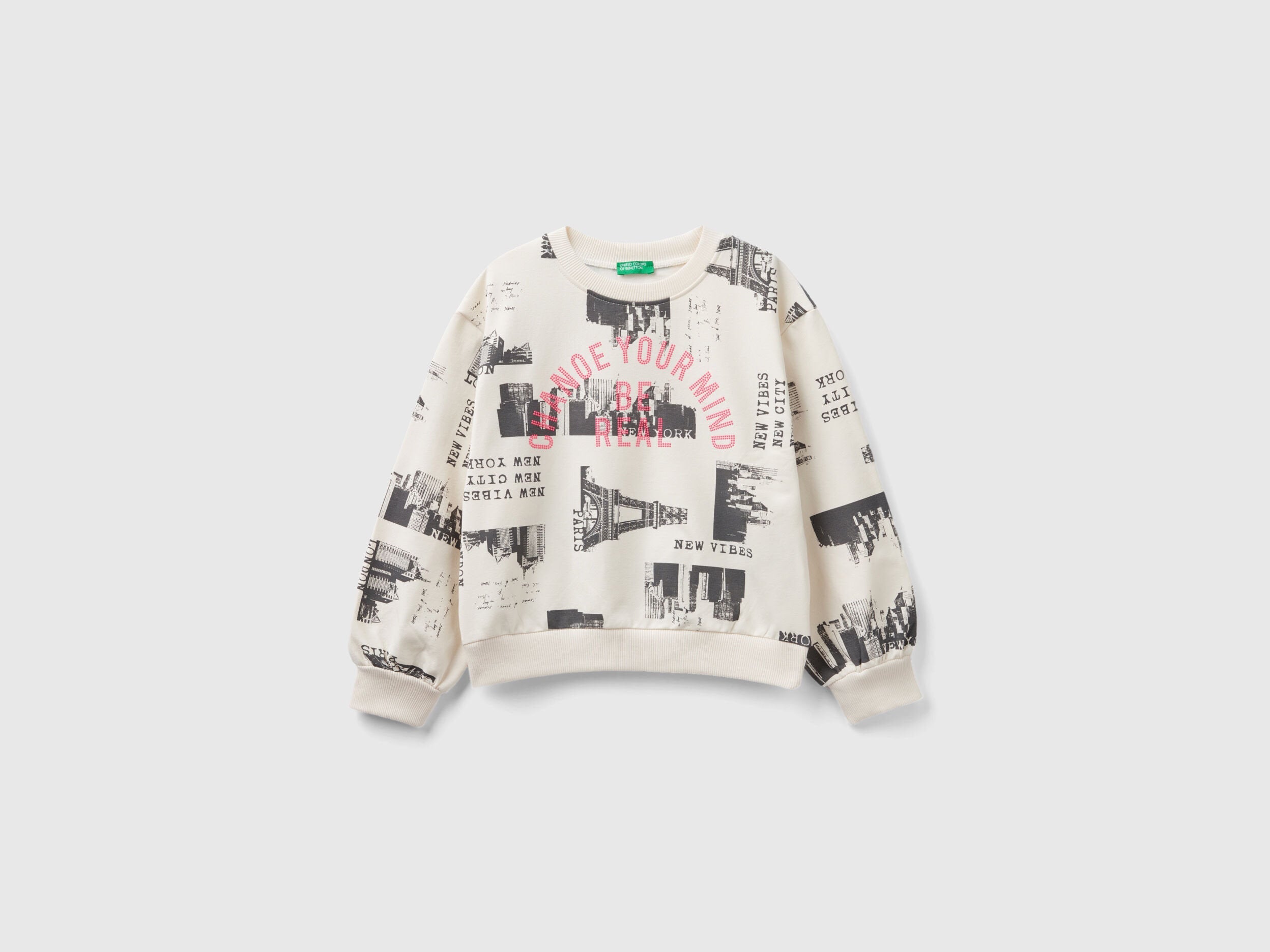 Crew neck sweatshirt in soft stretch cotton blend. Slightly loose long sleeves, relaxed fit and regular length. Photographic print with city images all over the garment, slogan on the front made up of small studs. For bold looks with underground vibes.