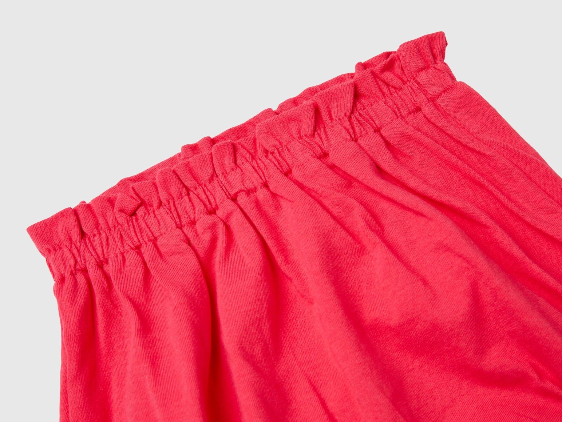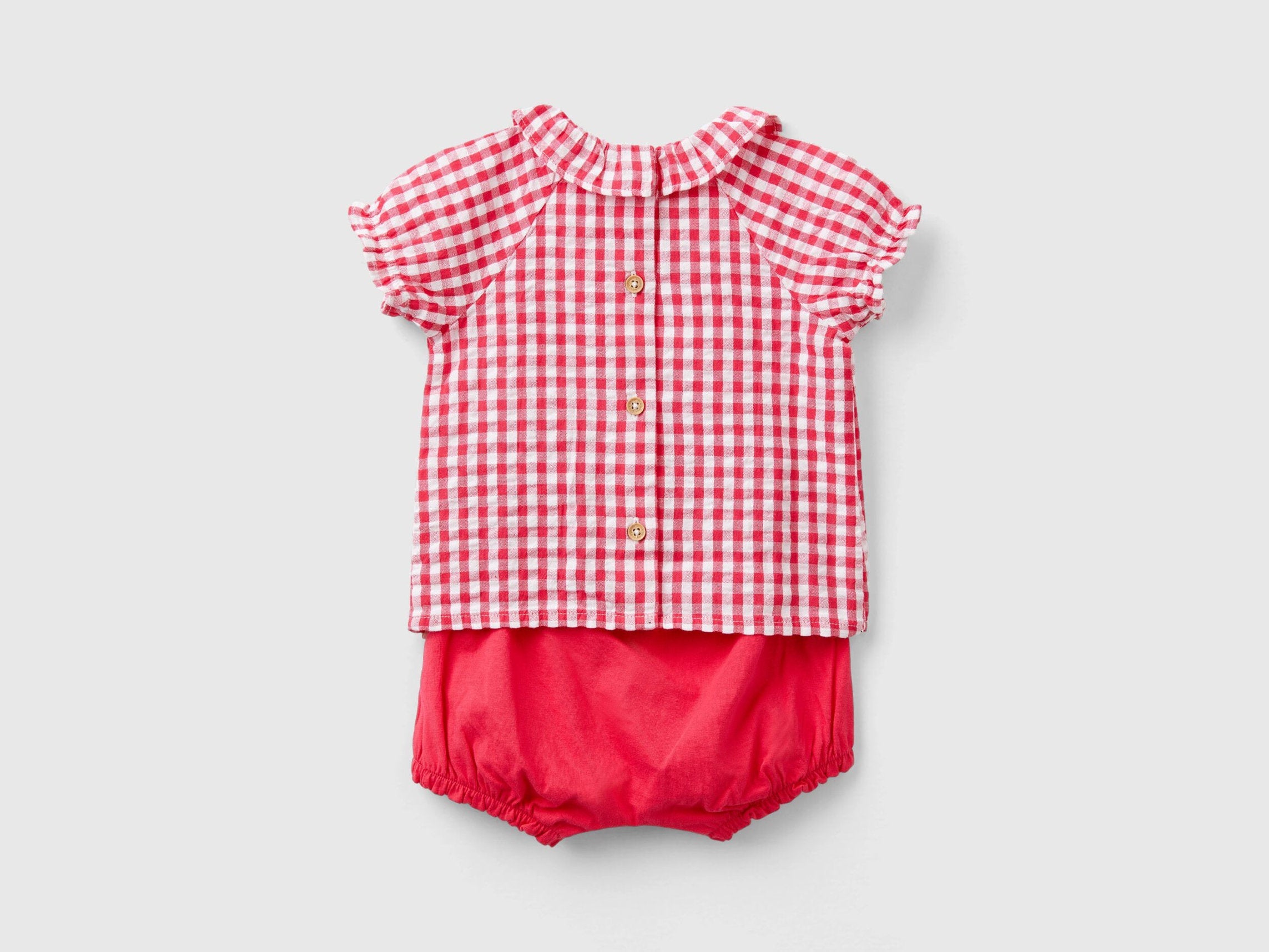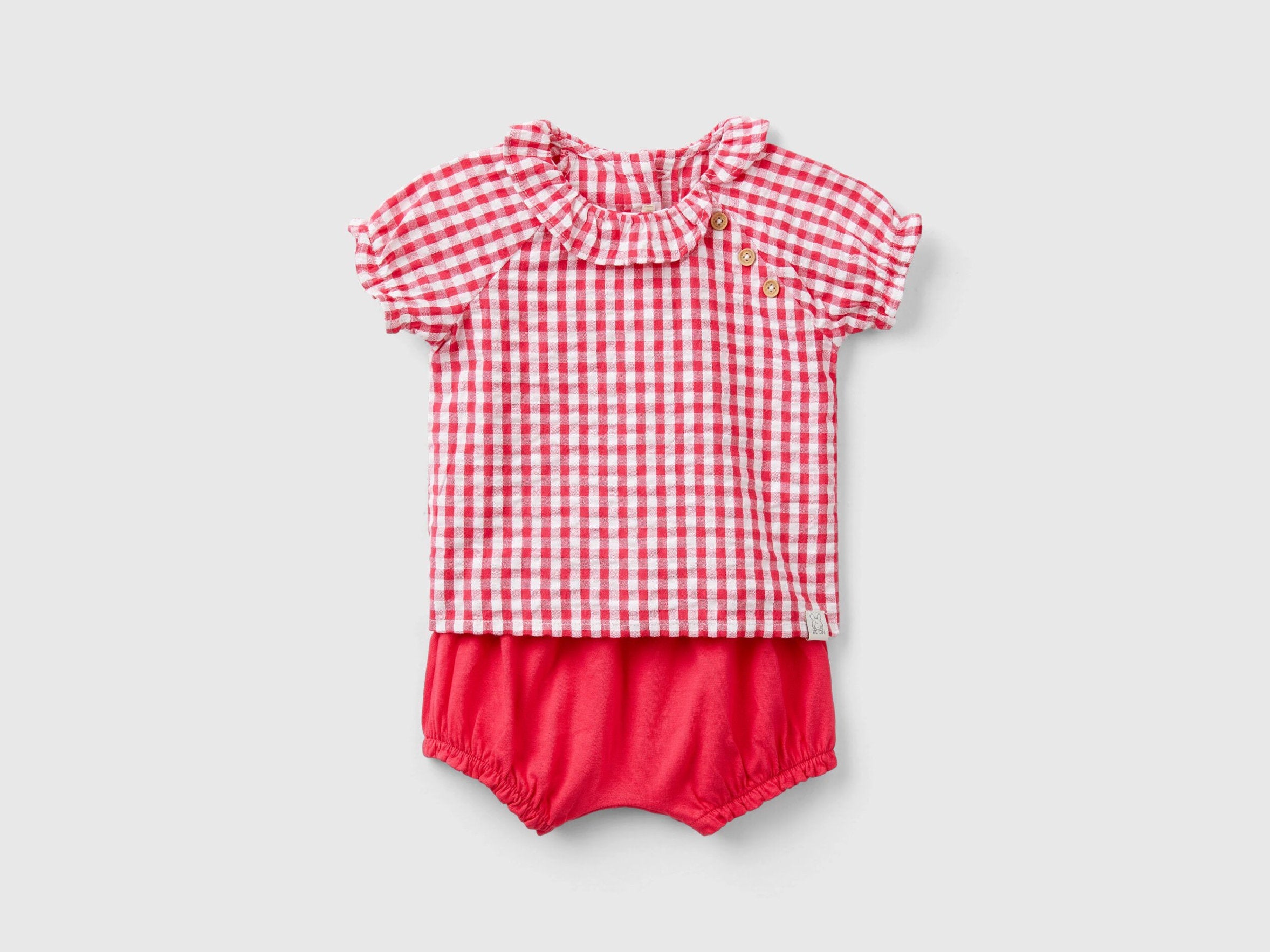 Set made of t-shirt and shorts in pure cotton. Cute Vichy check top with short raglan sleeves and round neck with ruffles. Practical opening with wooden-effect buttons along the armhole and on the back. Solid colored shorts with elastic at waistband and at leg openings. Cheerful, comfortable and feminine.