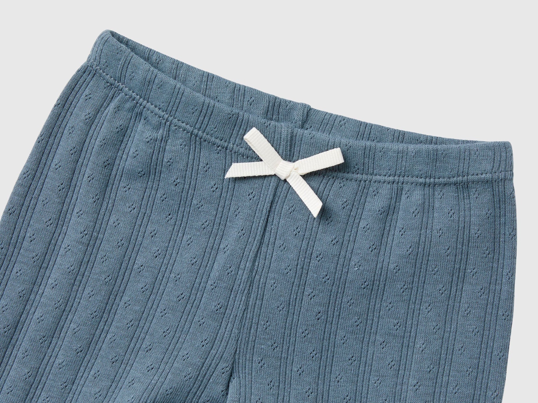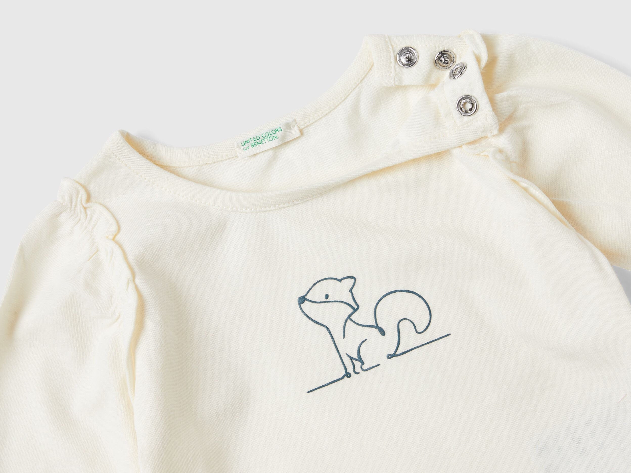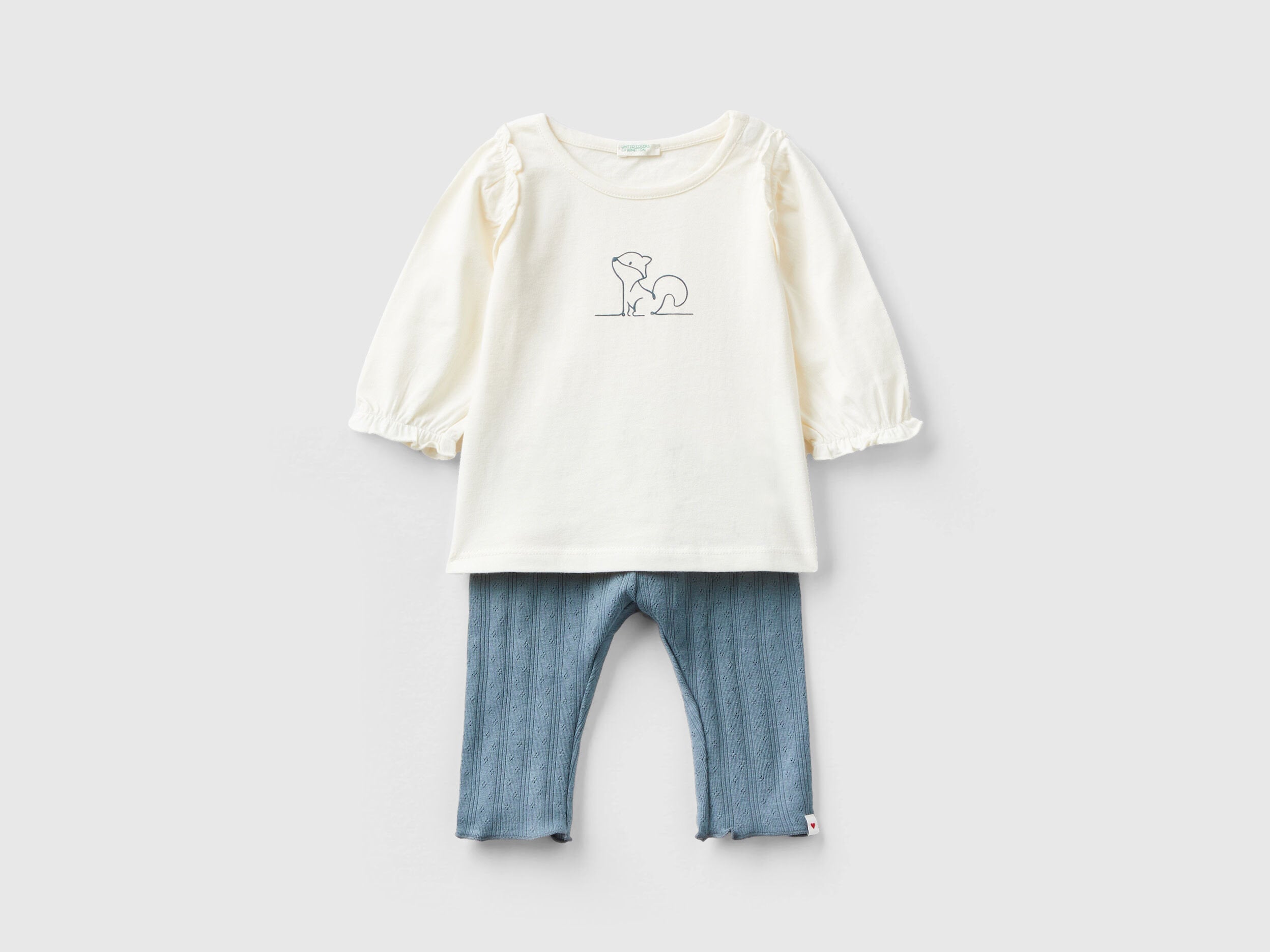 Matching outfit in pure ribbed cotton. Long sleeve crew neck t-shirt with gathered shoulder and animal print on the front. Long snug trousers with inner elastic at the waist and front bow applique. To get ready in a jiffy.