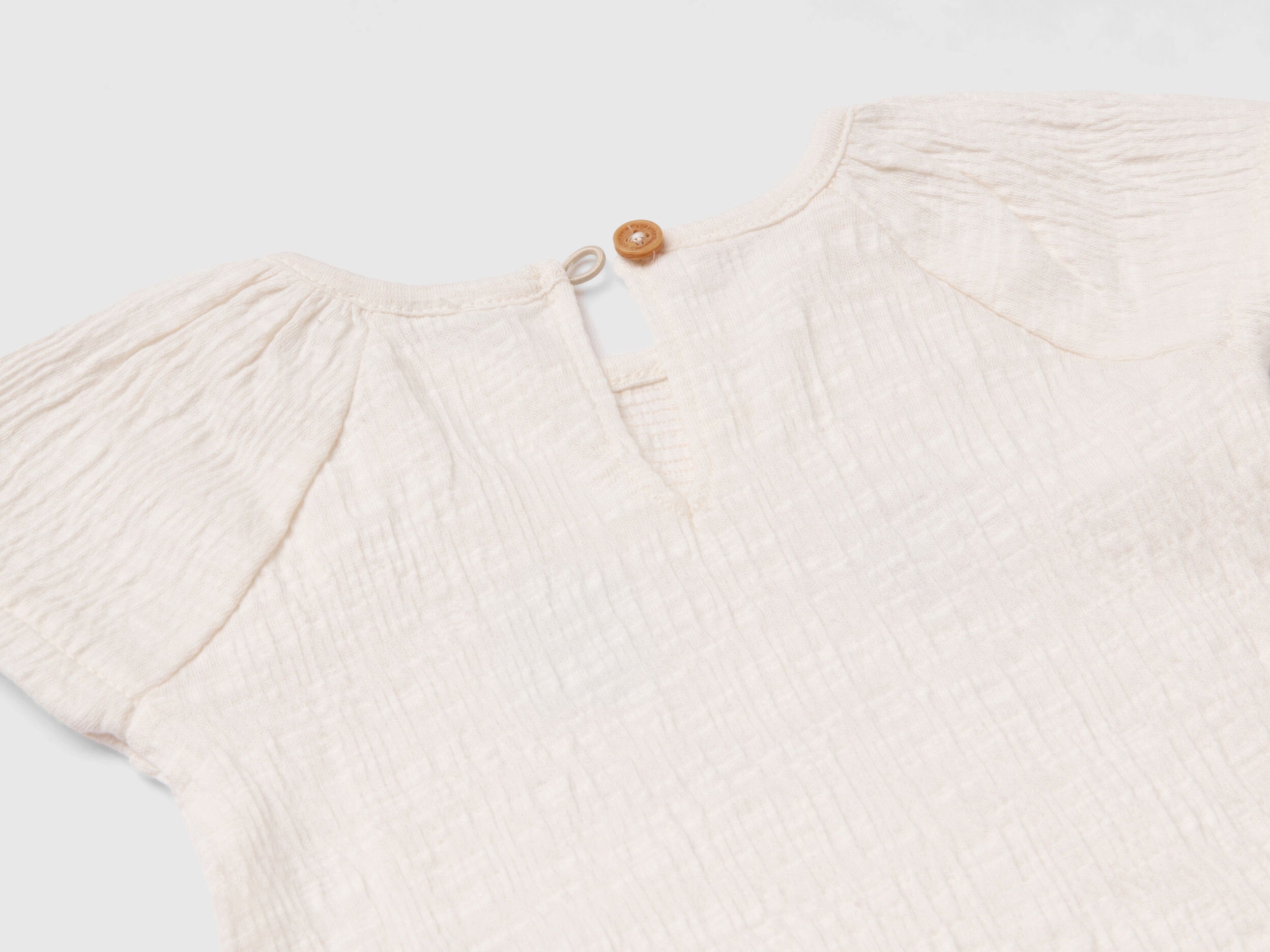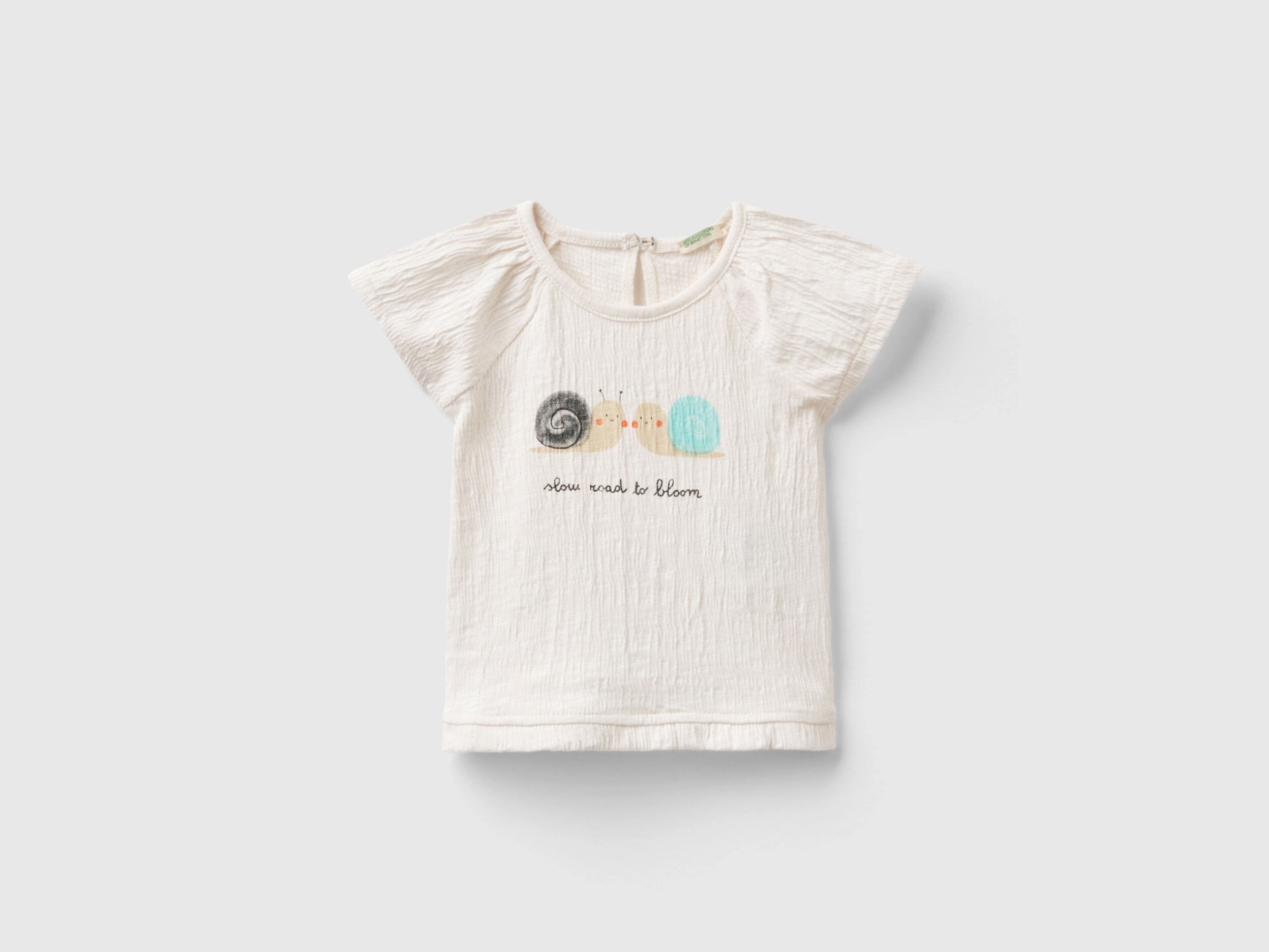 Crew neck t-shirt in embossed stretch cotton blend. Short raglan sleeves and cute rouches at the bottom. Practical keyhole opening with wood-effect button on the back. Print with animals and slogan on the front. Romantic and feminine.