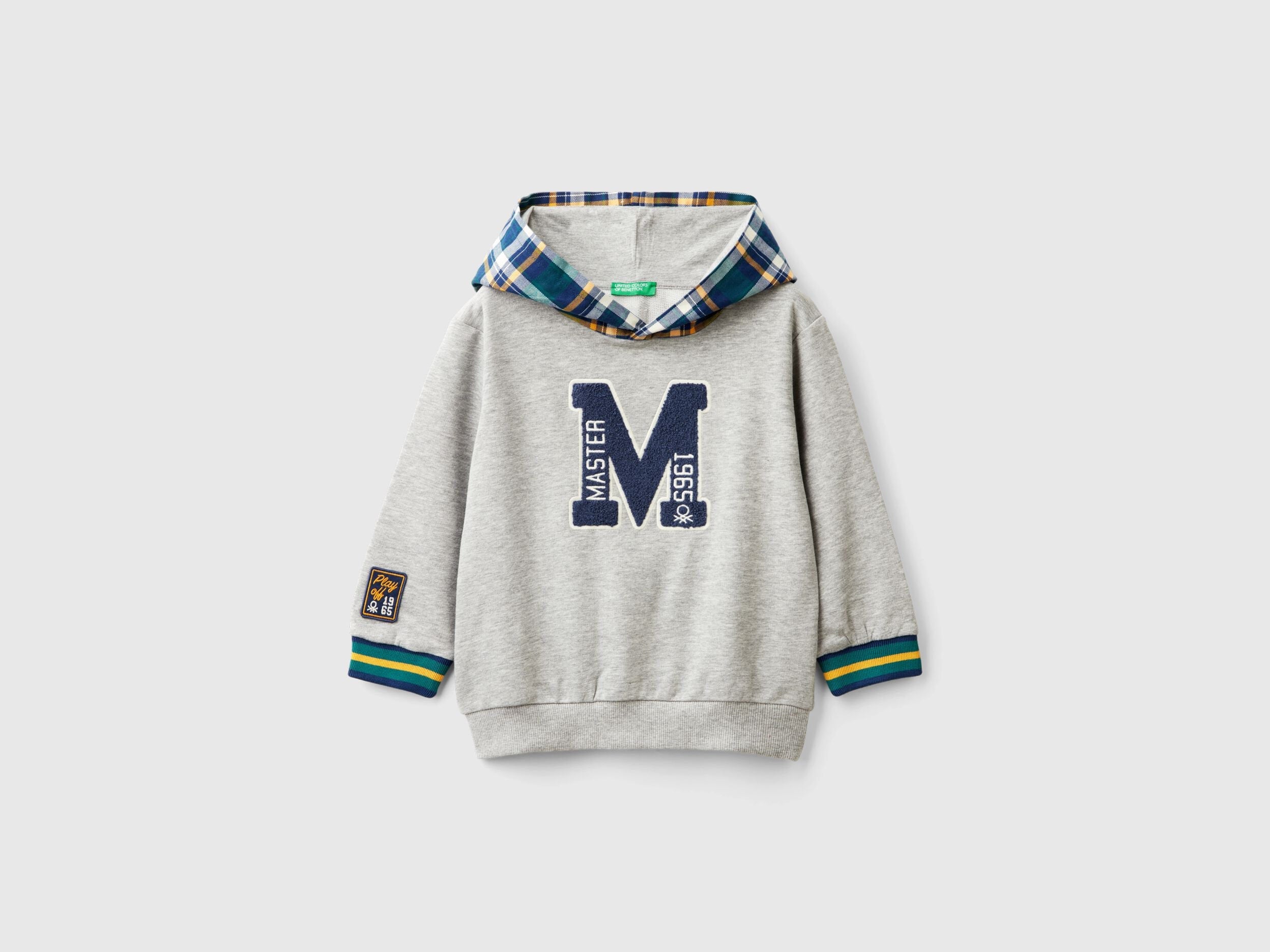 Soft sweatshirt in cotton and viscose blend, featuring a tartan flannel hood. Long sleeve, lettering embroidery on the front and patch applied on the sleeve. Sporty style and college inspiration.