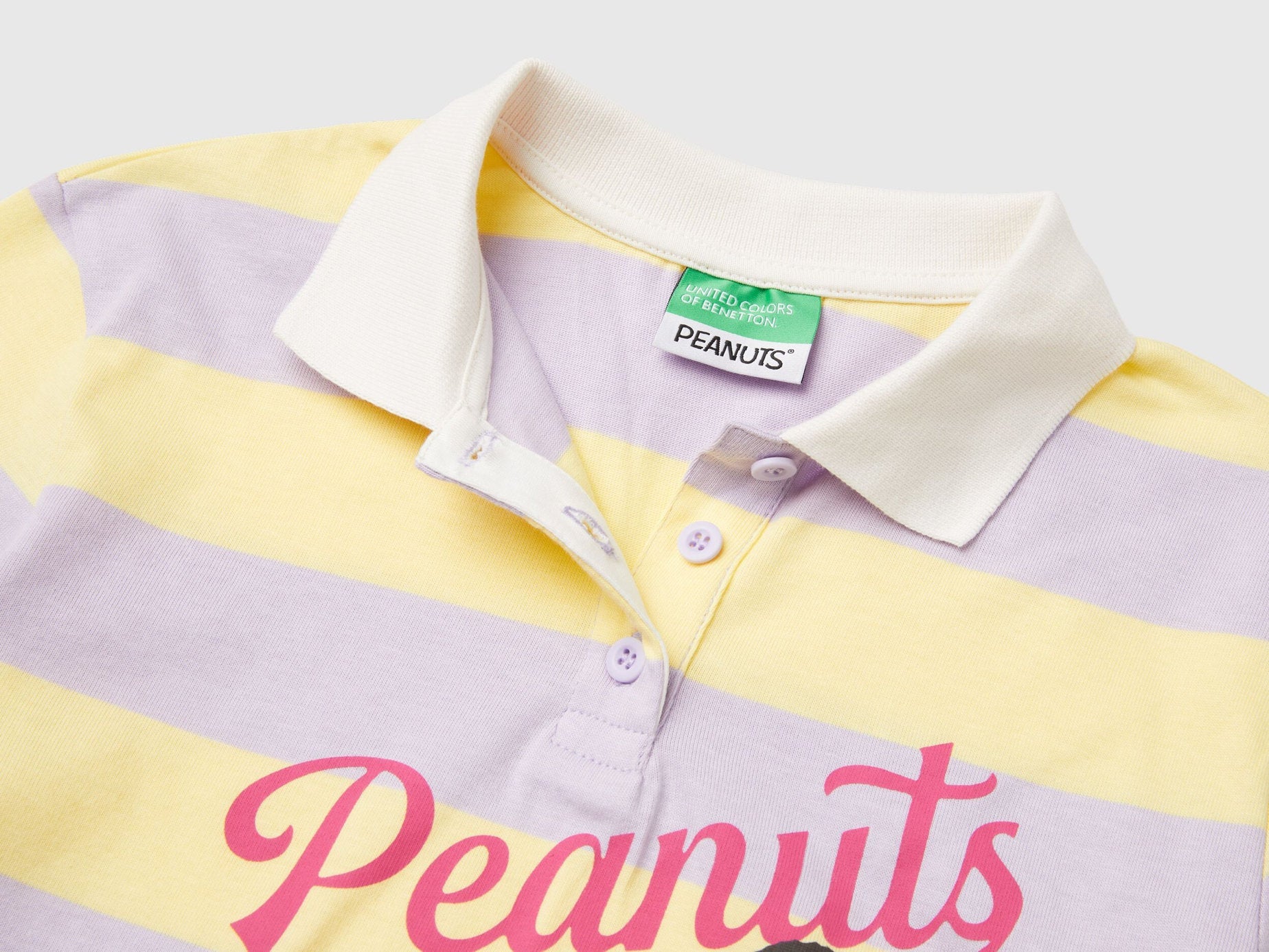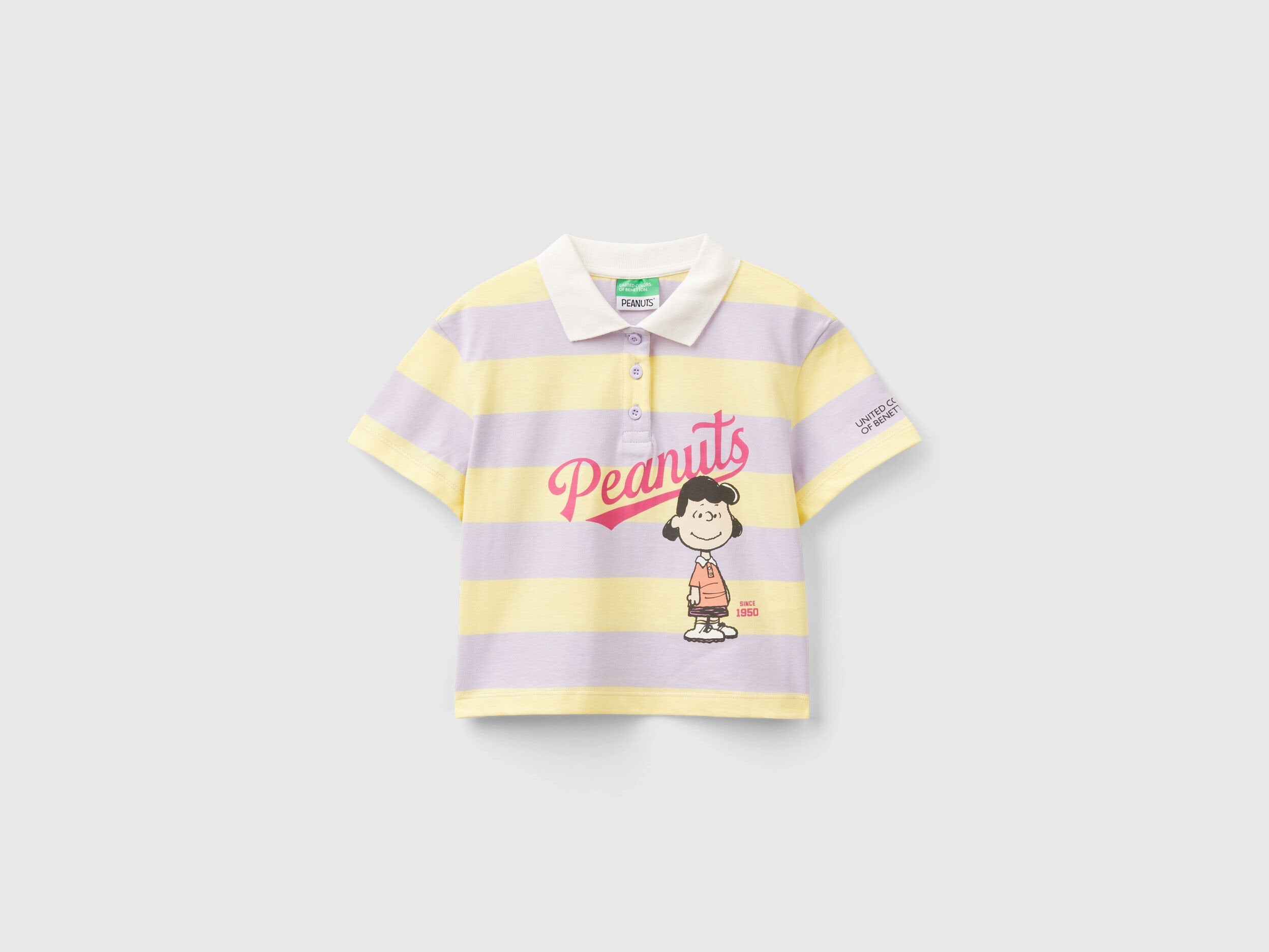 Short sleeve polo in pure cotton with yarn dyed stripes. Shirt collar, partial button opening, ©Peanuts character print on the front. Relaxed fit, for a fun and comfortable garment.