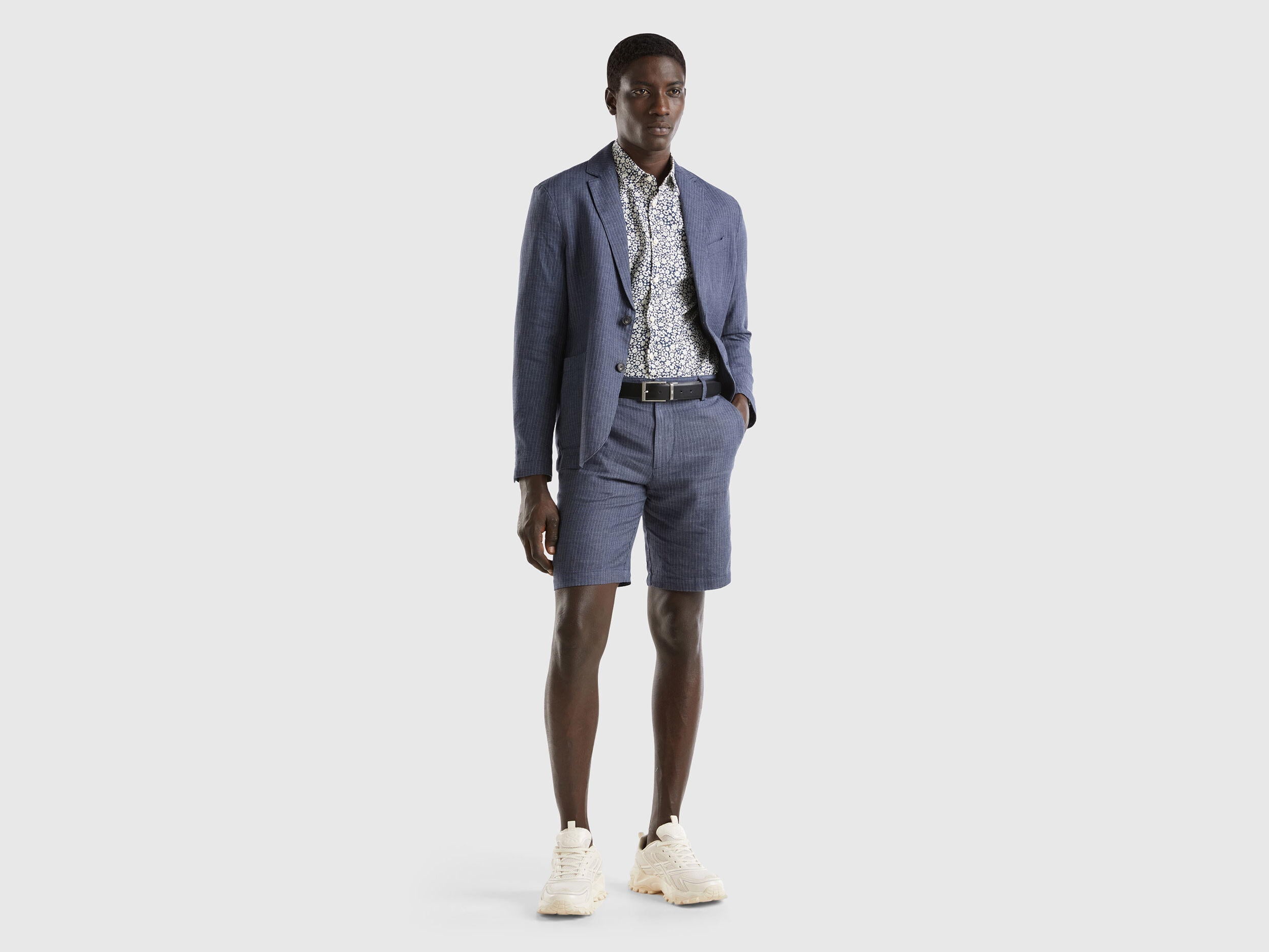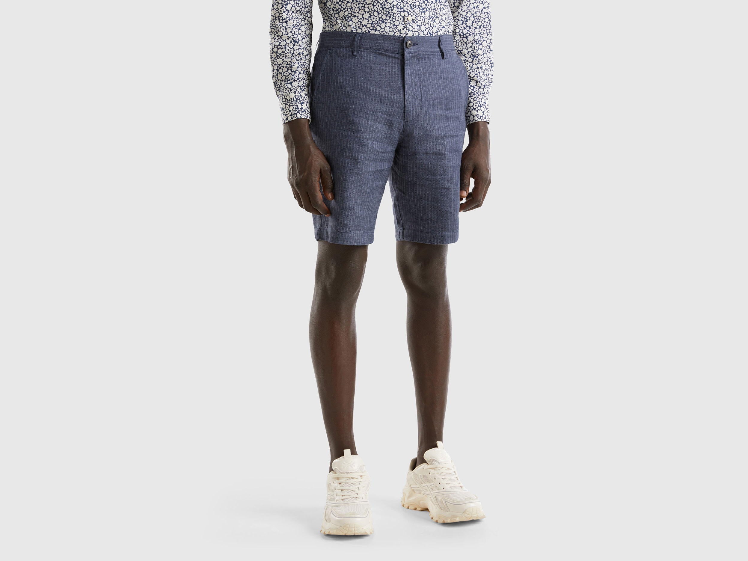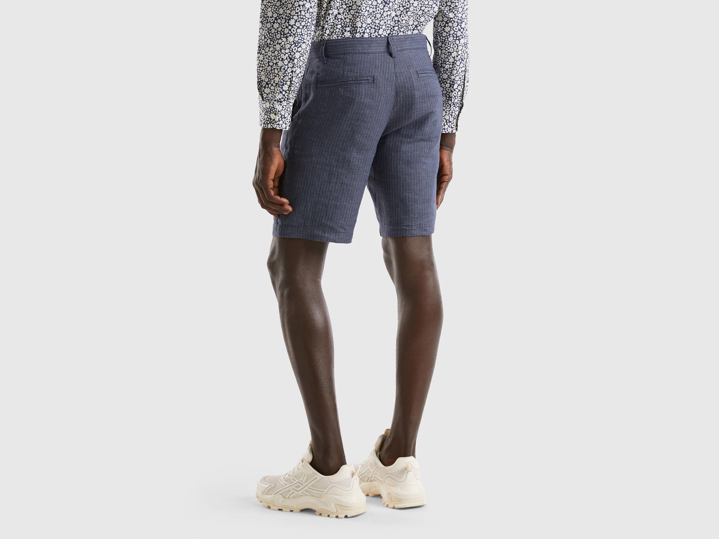 Lightweight chino model bermudas with yarn dyed vertical stripes, with zip and button opening. This piece is made of cotton and linen blend: a resistant, recyclable vegetable fiber that consumes minimal natural resources.