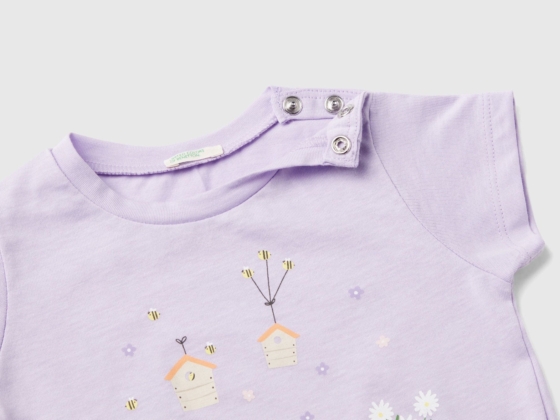 Crew neck short sleeve t-shirt in pure organic cotton. Hidden opening with snap buttons on the left shoulder and front animal print. Colorful and sustainable.