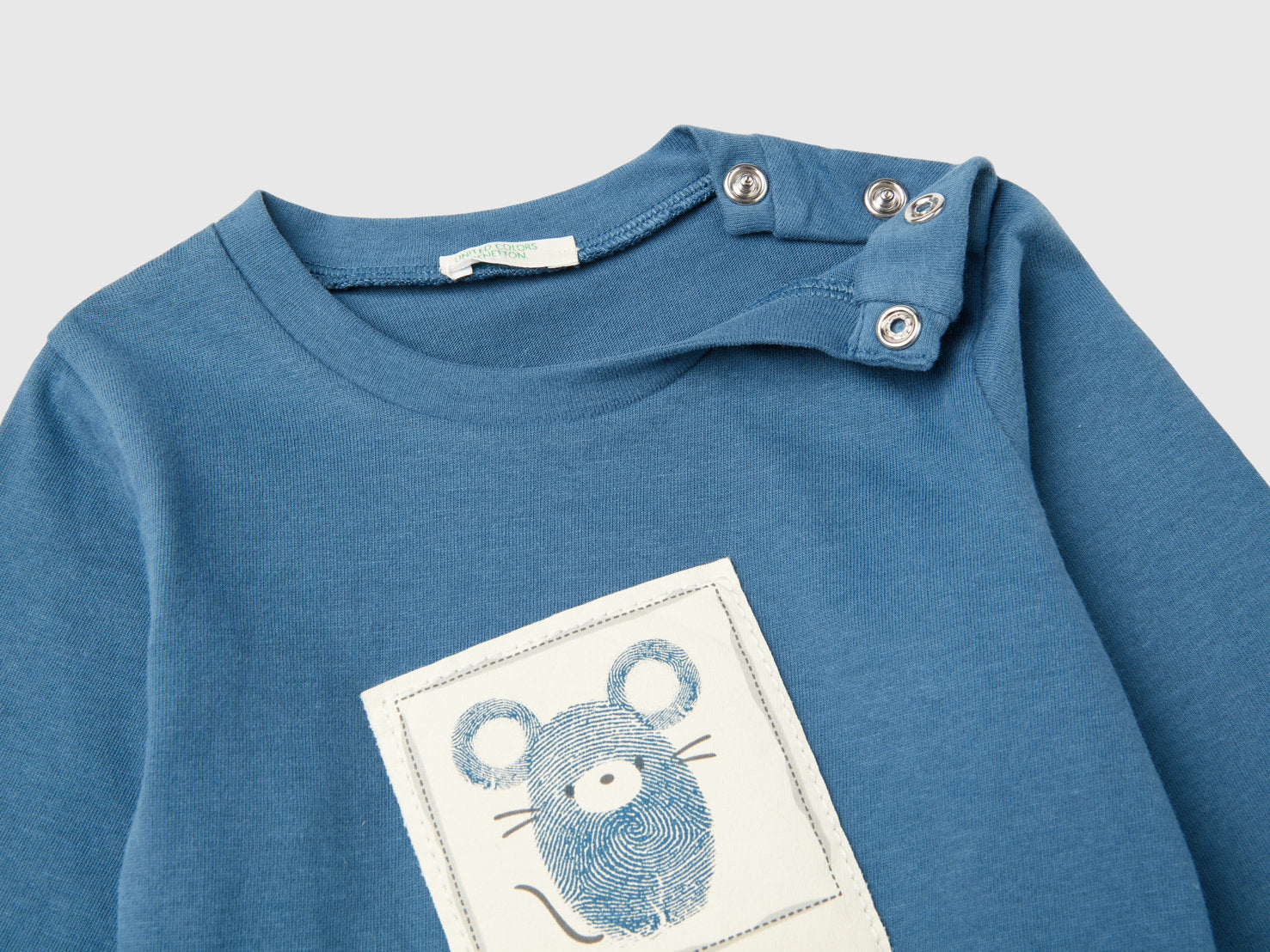 Long sleeve t-shirt in pure warm organic cotton. Round neck, opening with hidden snap buttons on the left shoulder. Print and animal patch on the front. Fun and easy to wear.