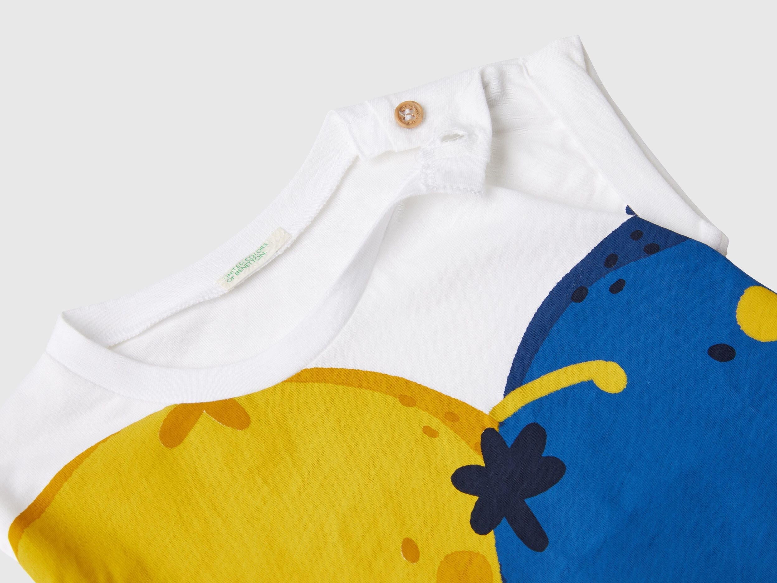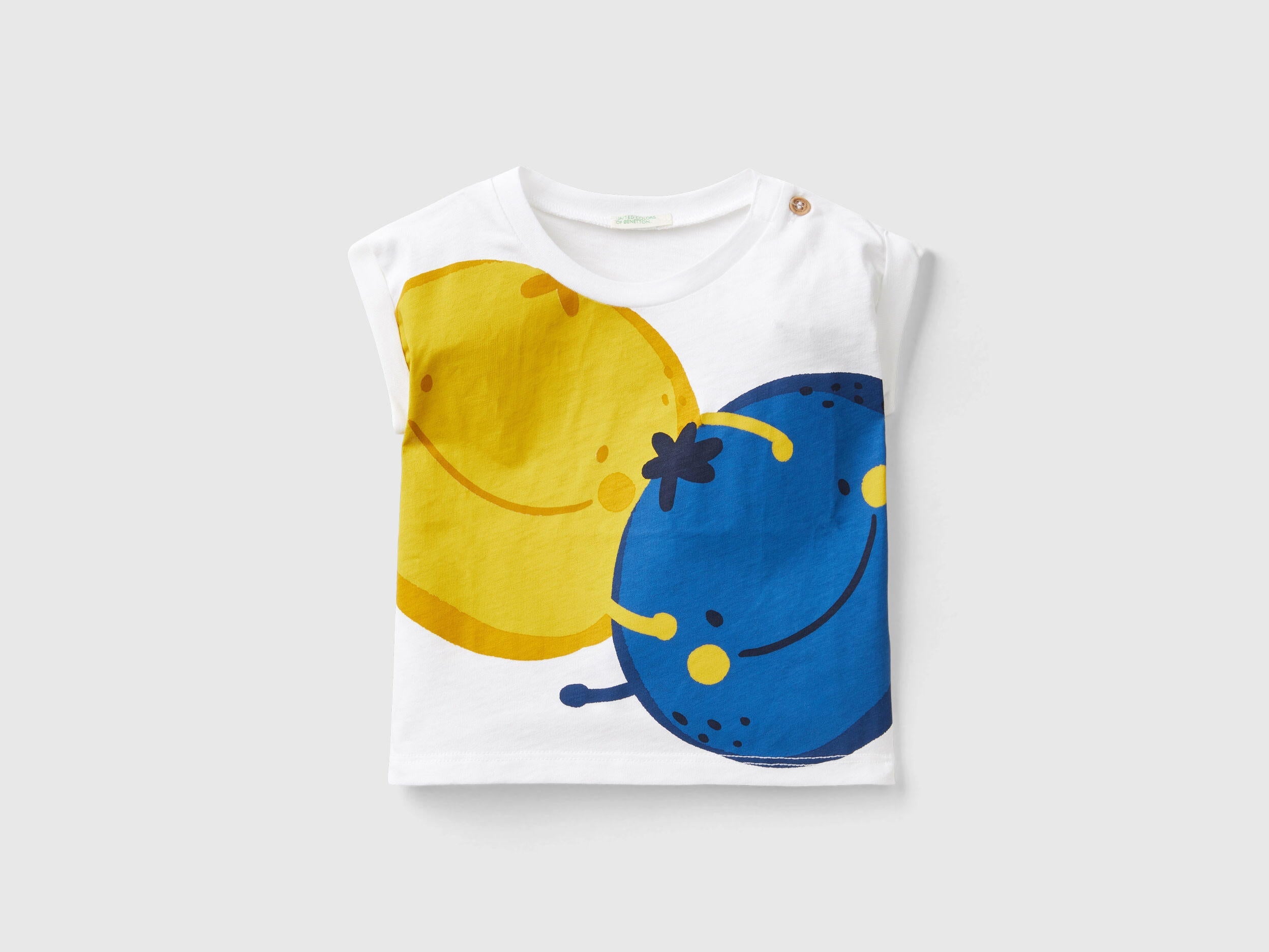 Crew neck short sleeve t-shirt in pure organic cotton. Maxi fruit-themed print on the front. Opening with hidden snap buttons and one visible wooden-look button at left shoulder. Fun and colorful.