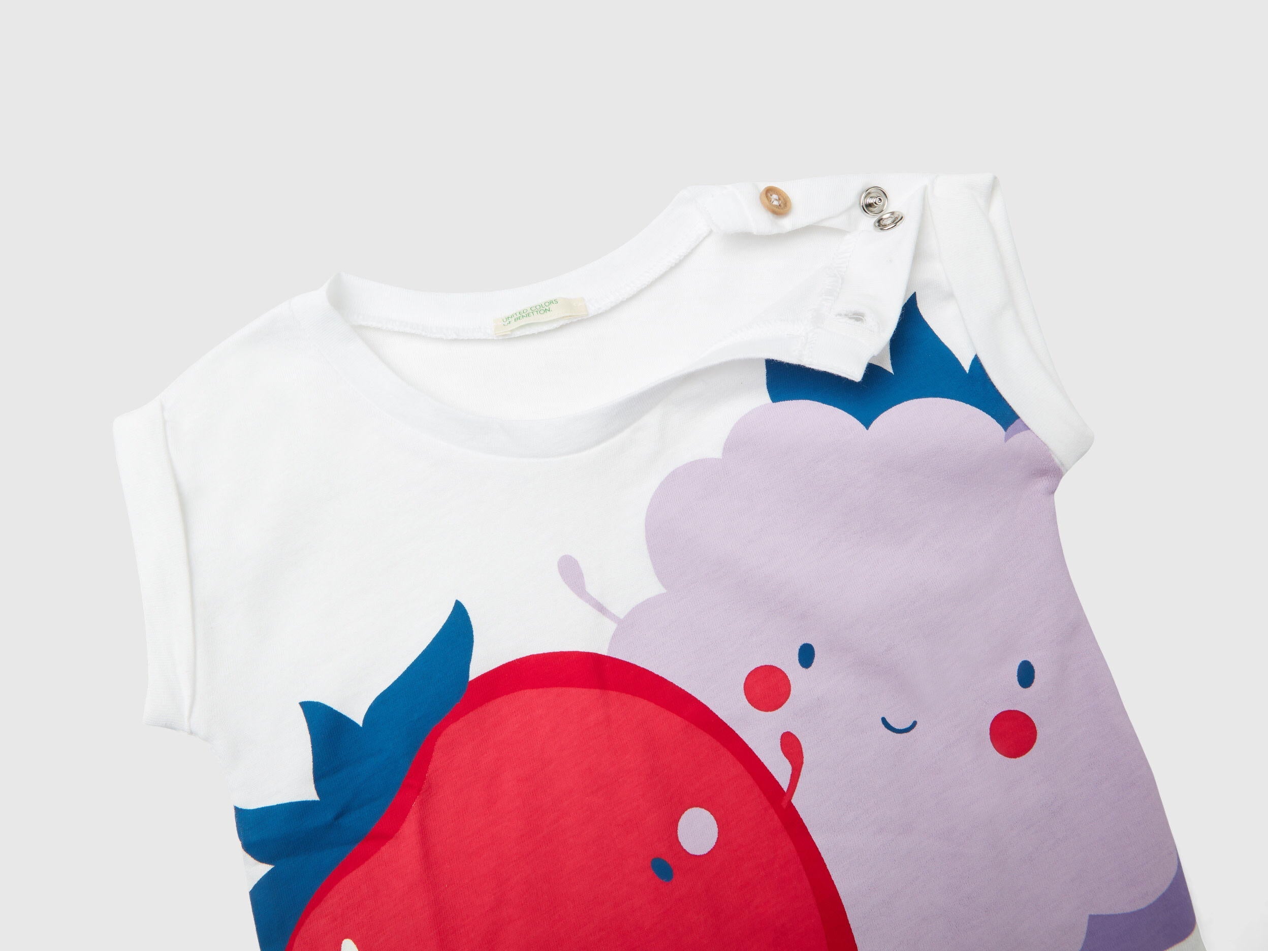 Crew neck short sleeve t-shirt in pure organic cotton. Maxi fruit-themed print on the front. Opening with hidden snap buttons and one visible wooden-look button at left shoulder. Fun and colorful.