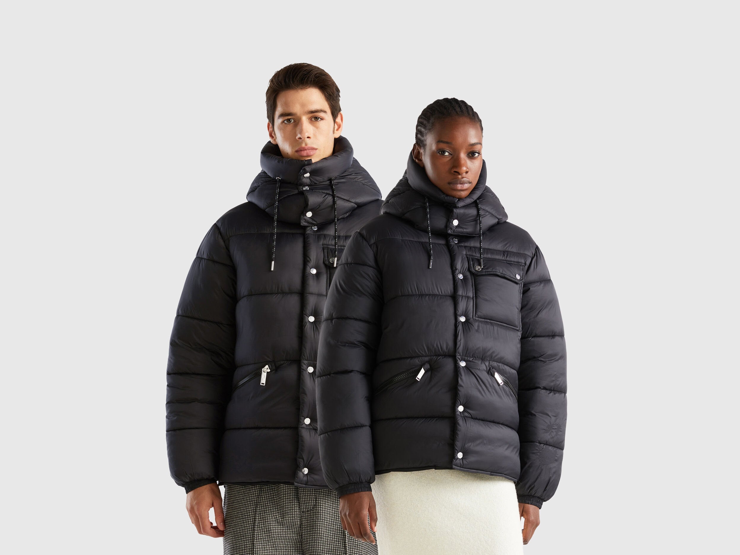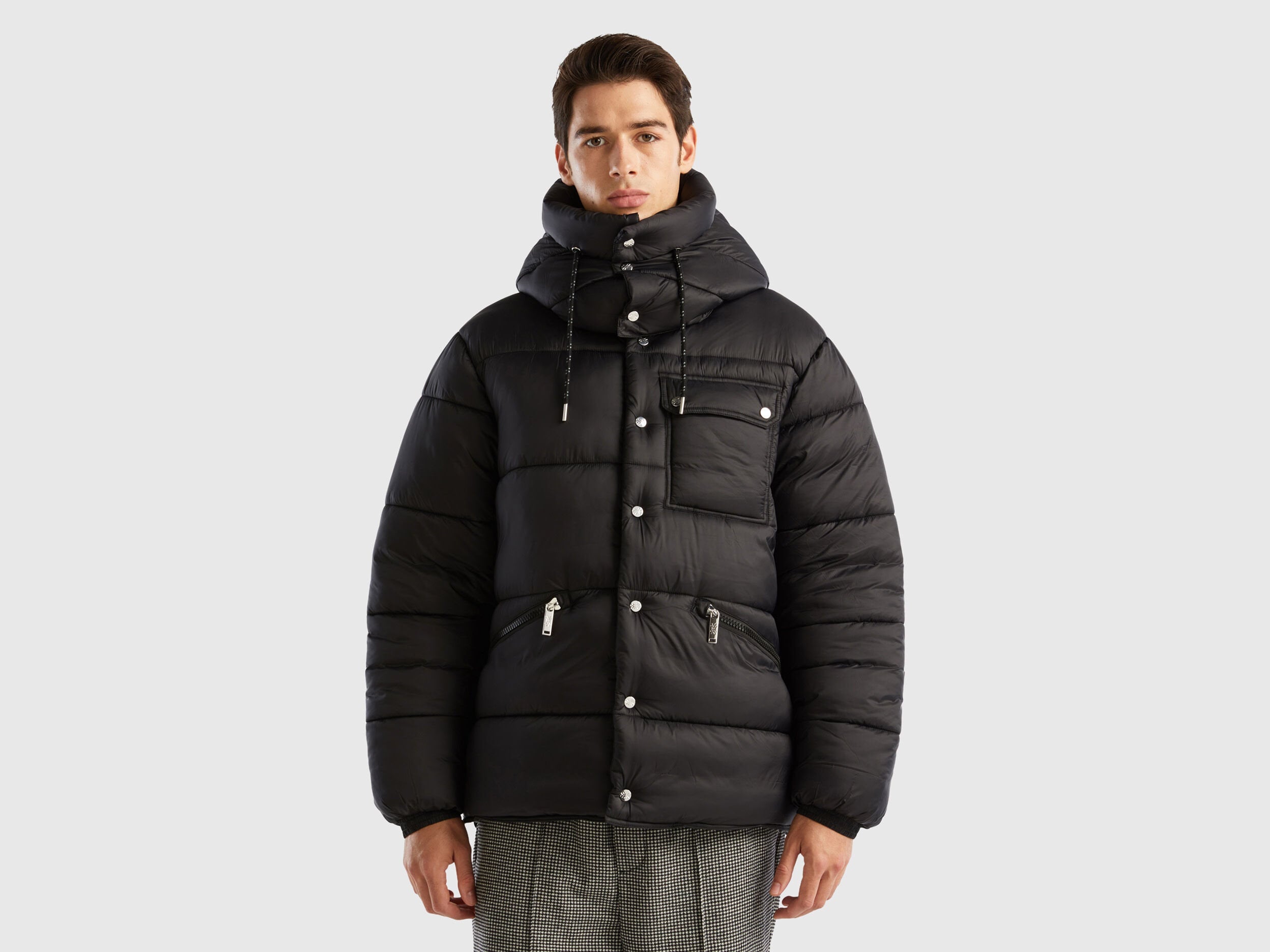 Heavy "Rain Defender" nylon jacket, suitable for the coldest days. Warm but ultra light, with "Duck Free" padding in recycled wadding, produced from PET plastic bottles. Featuring a detachable hood with drawstring, opening up to the chin with zip and snap buttons. Inseam front pockets with zip and patch pocket on the chest side with flap and snap buttons. Equipped with an internal shoulder strap to carry it over the shoulder. An "Easy Care" garment that can be machine washed and tumble dried, following the instructions on the label.