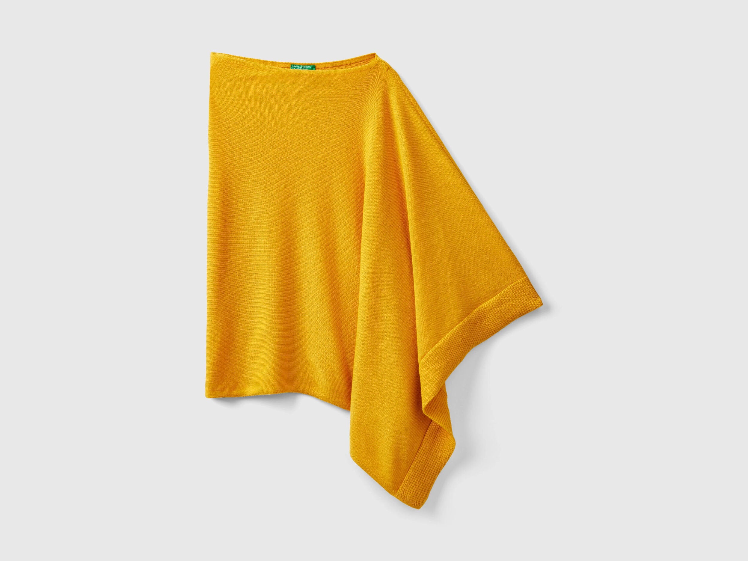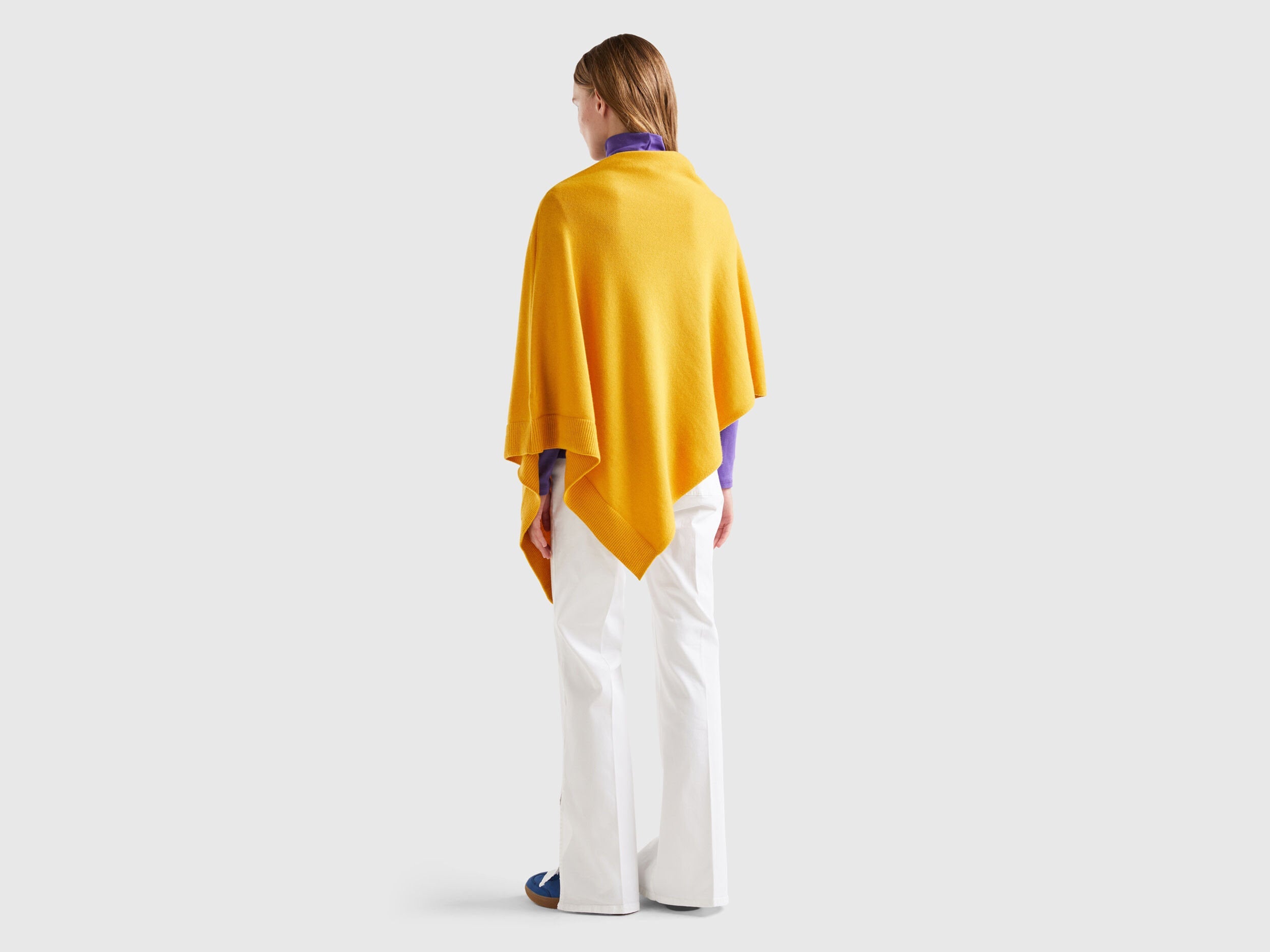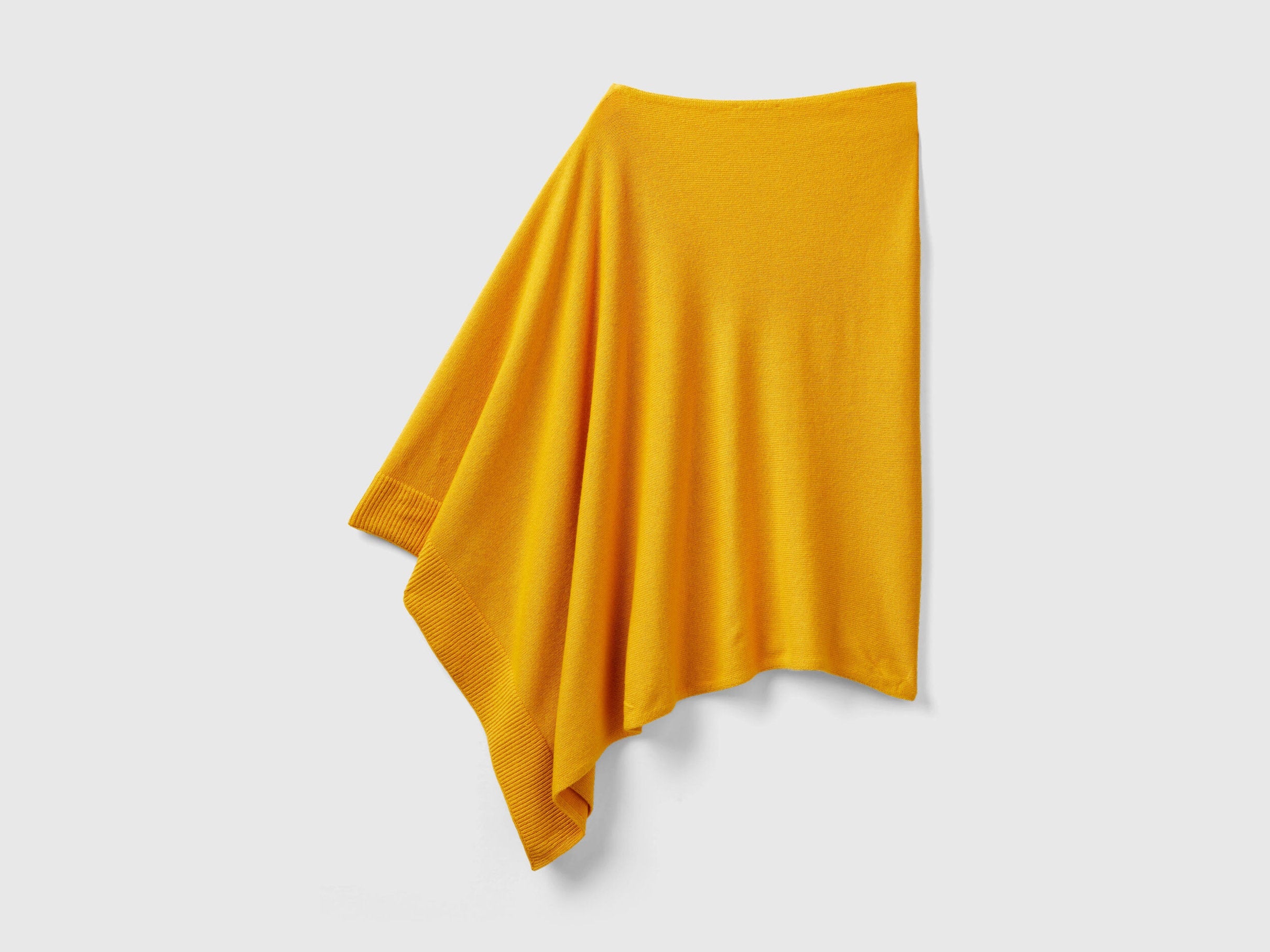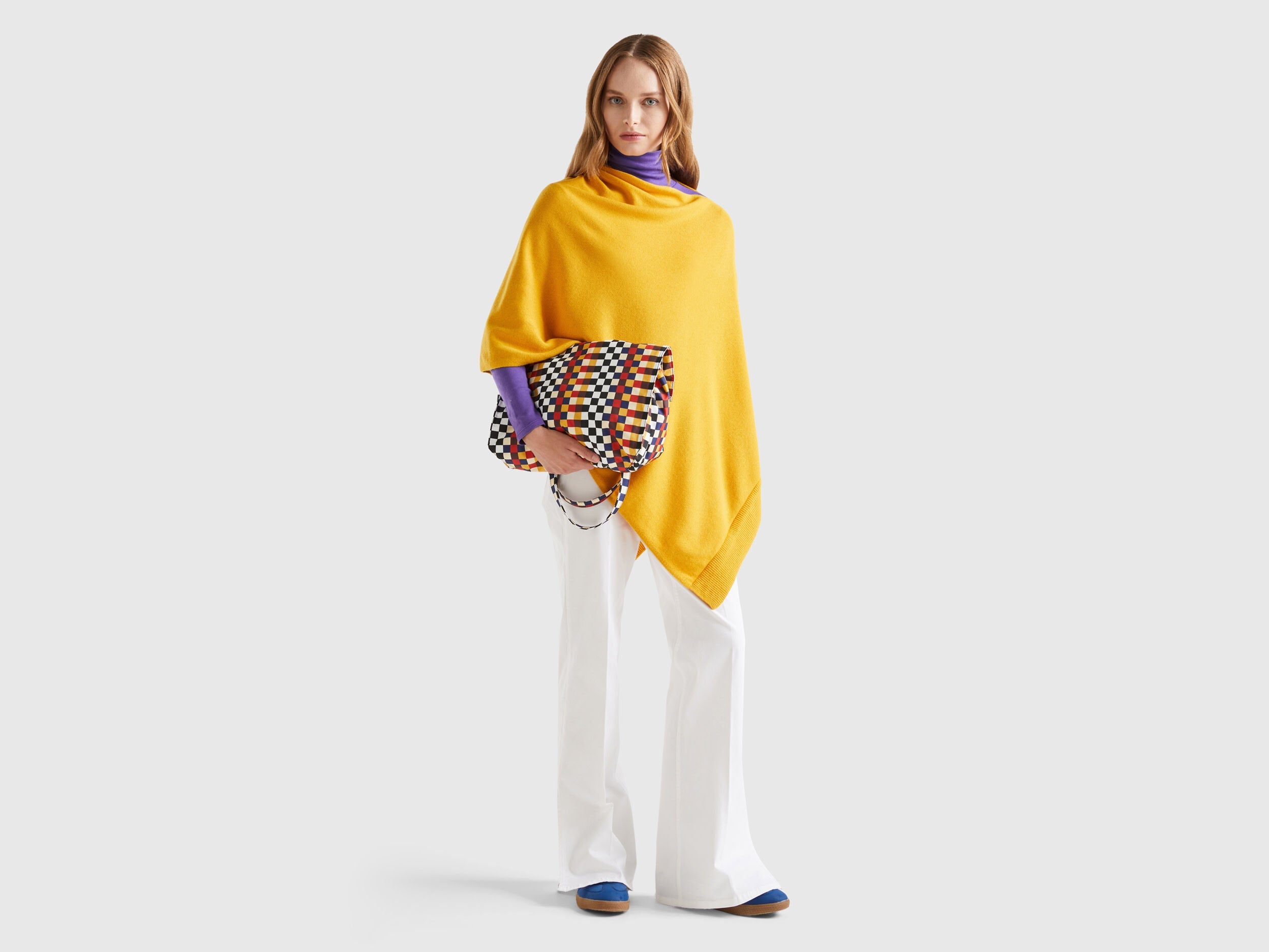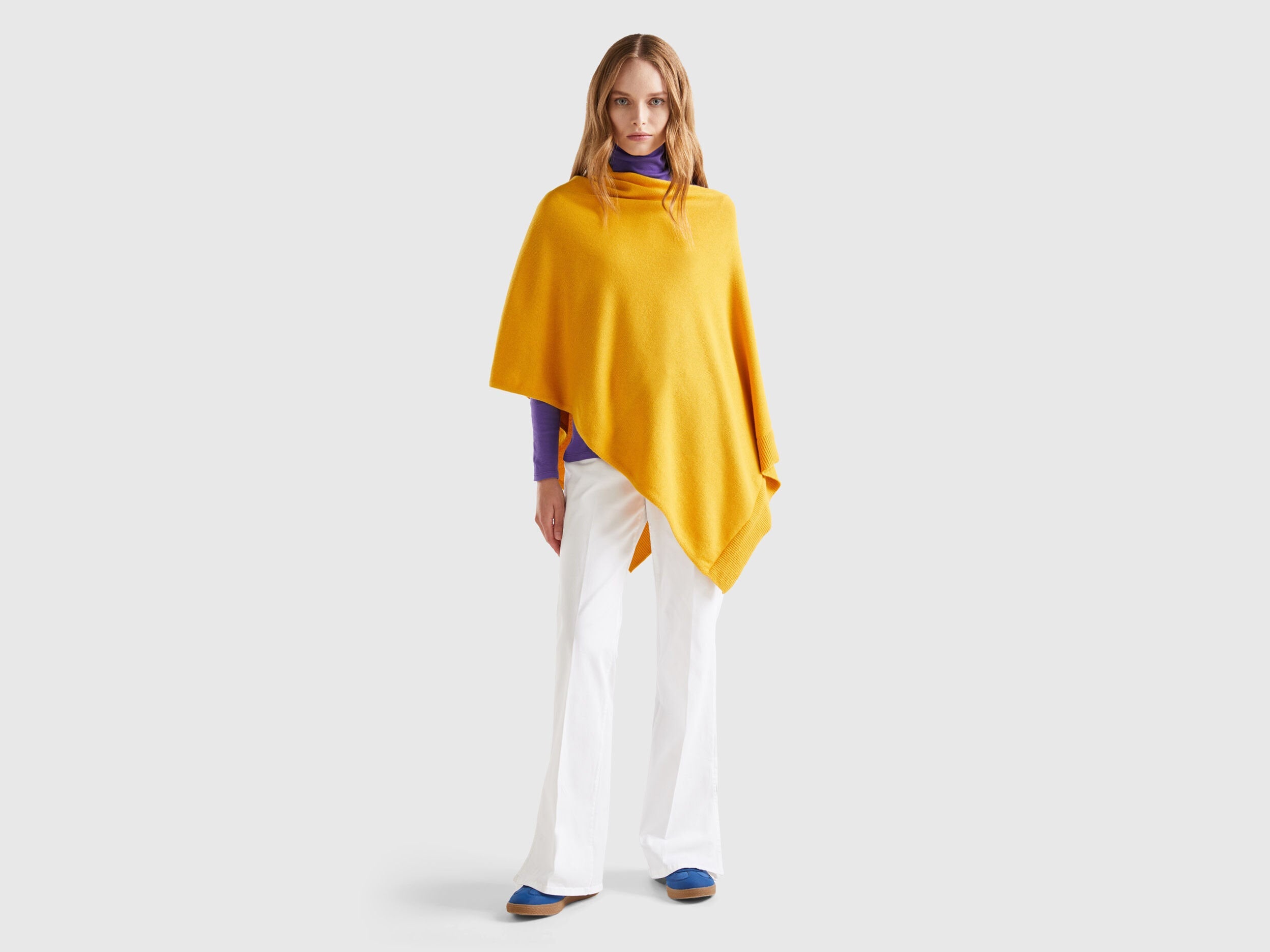 Warm poncho in soft wool, viscose and cashmere blend yarn. V-neck on the front and ribbed bottom. For endless combos.