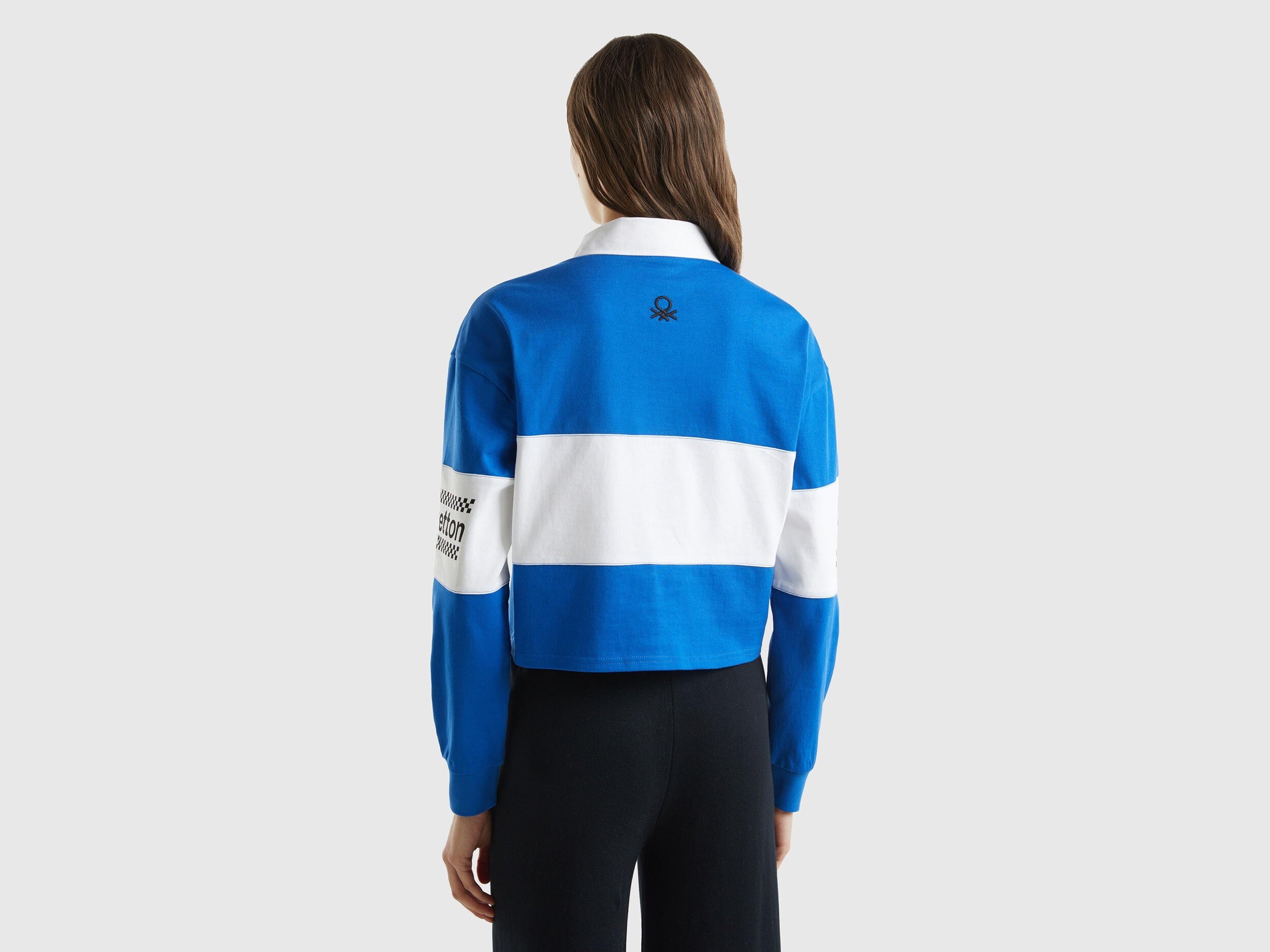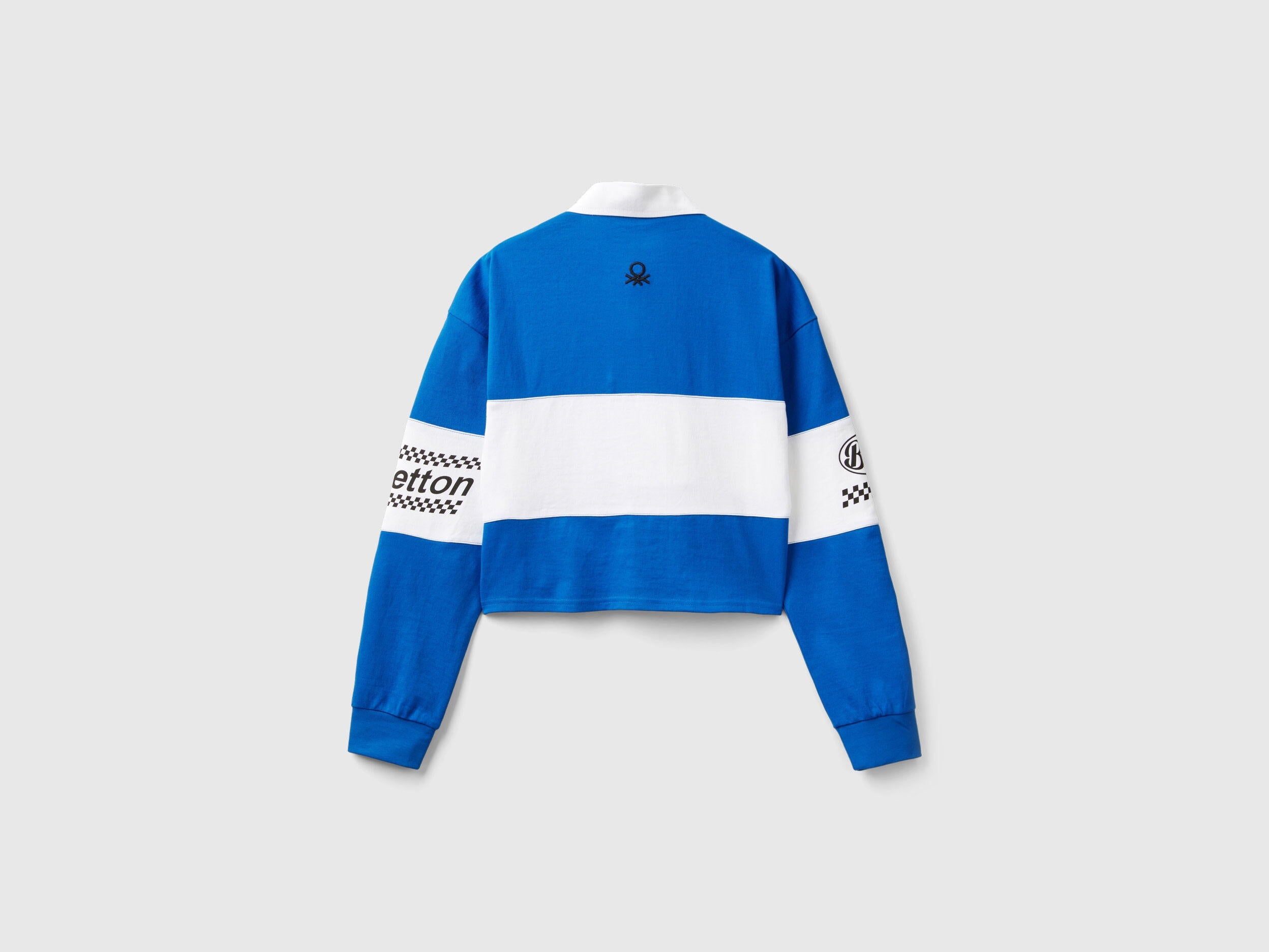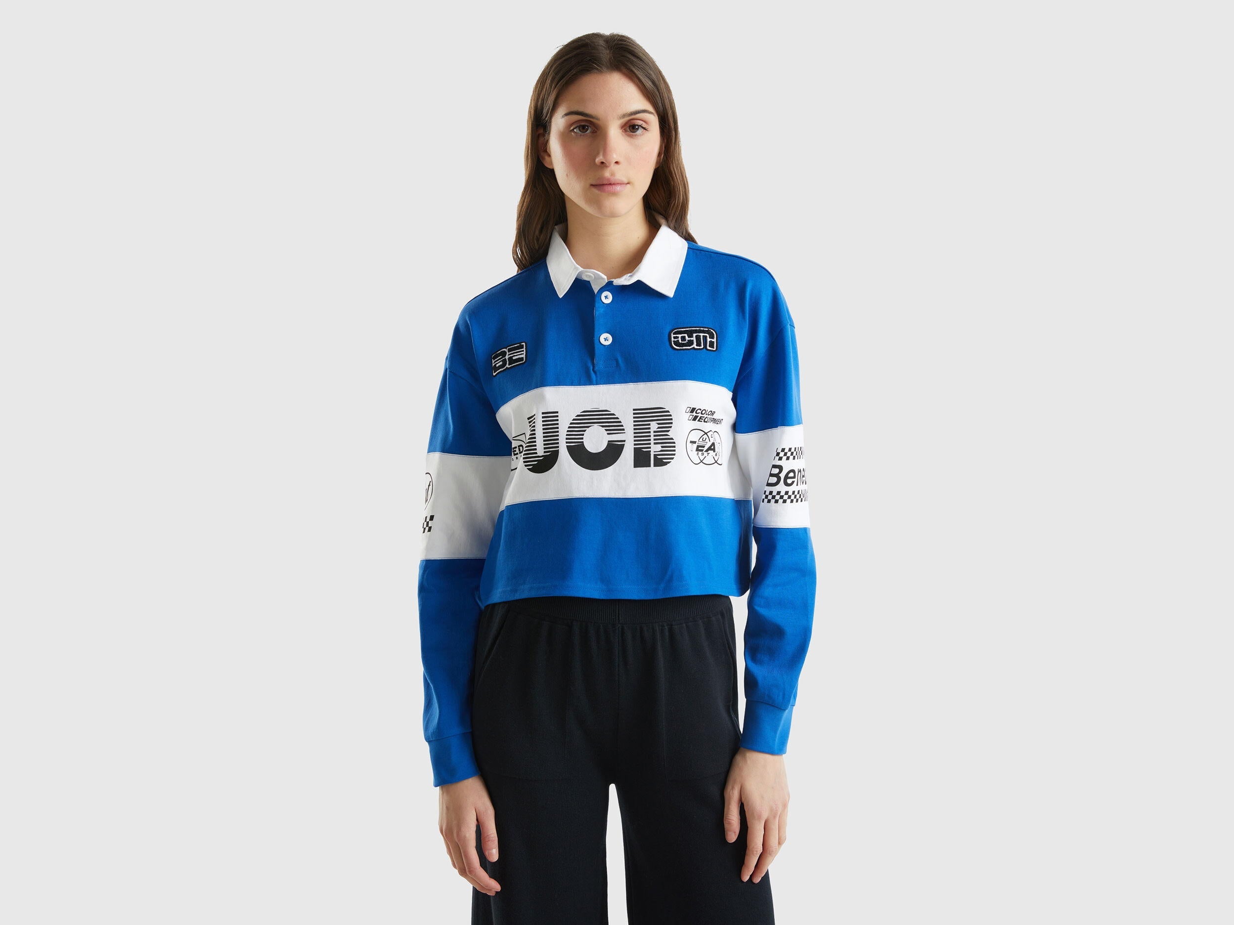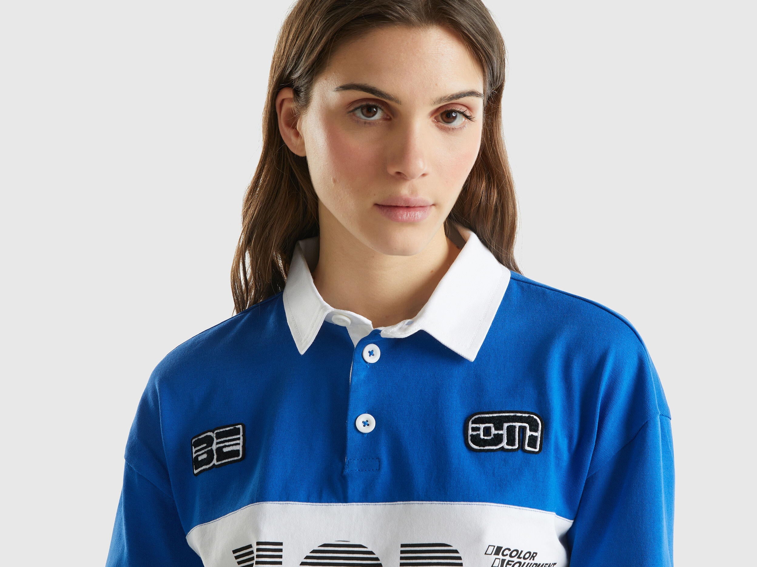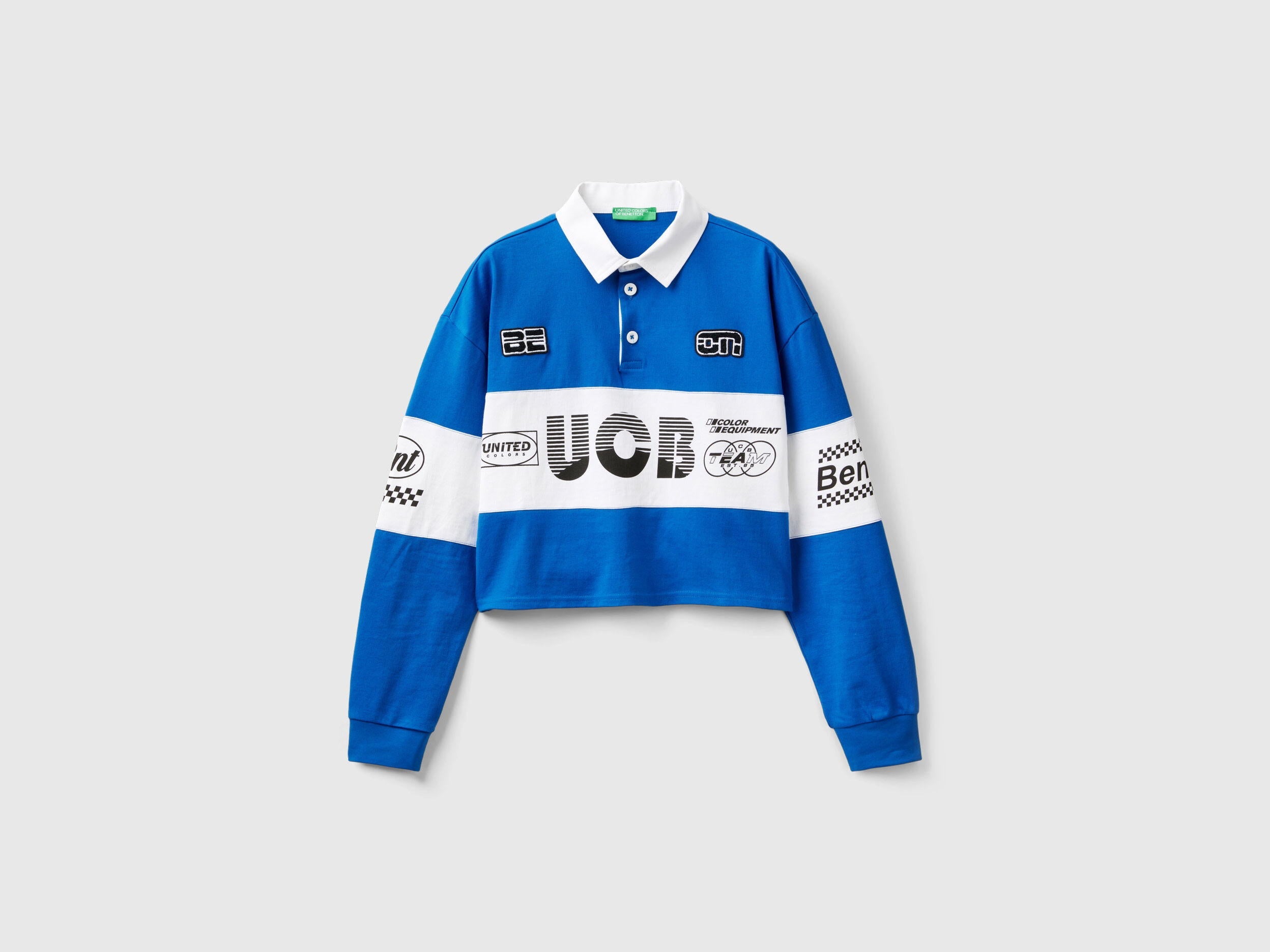 Long sleeve polo in pure cotton jersey with cropped fit, with clashing classic collar and partial front buttoning. Patch applique at breast, text print on clashing front band and on sleeves, embroidered logo at back. Rugby inspiration with a vintage touch for a new cult classic in the women's casual wardrobe, brimming in Benetton style.