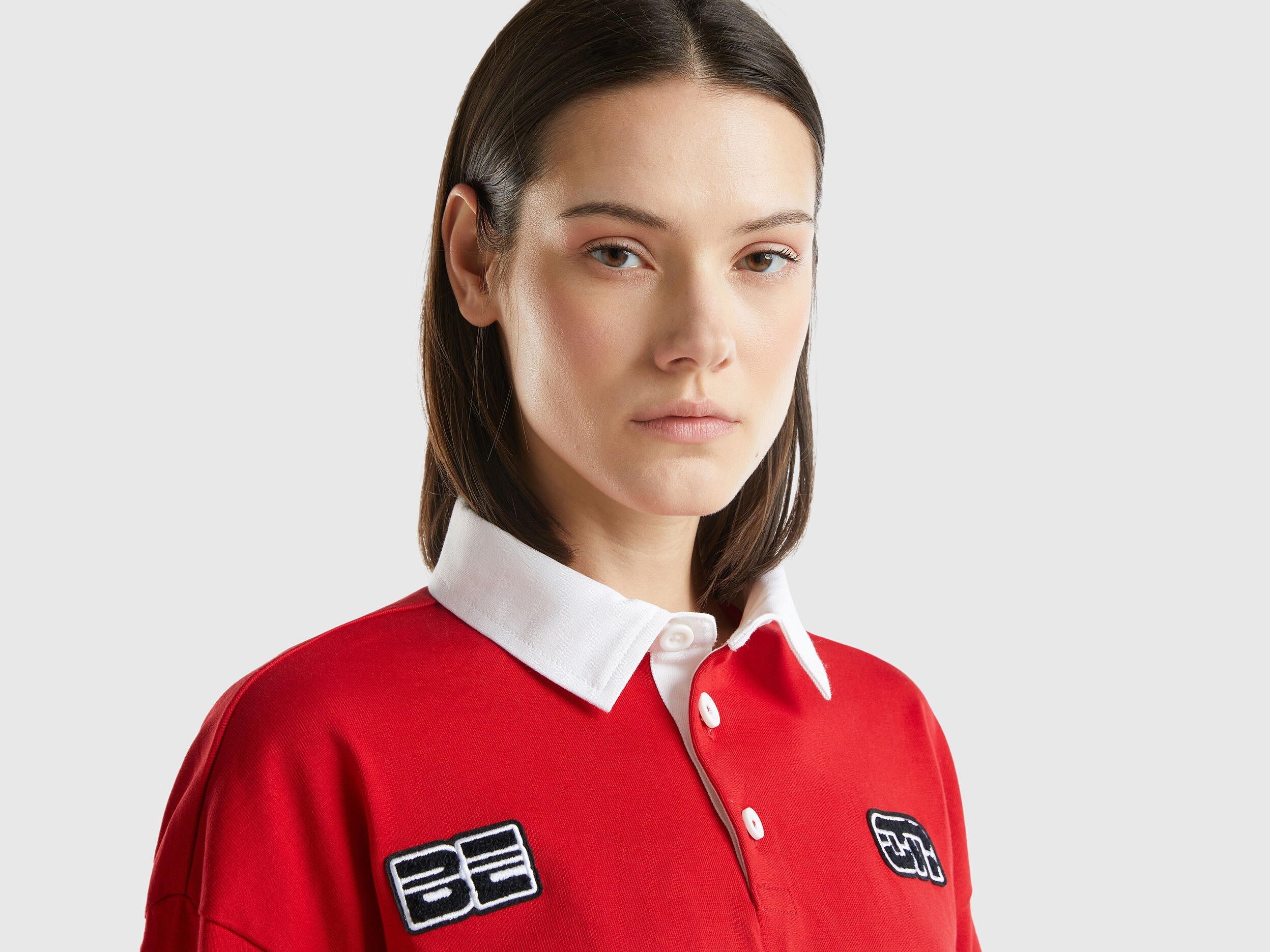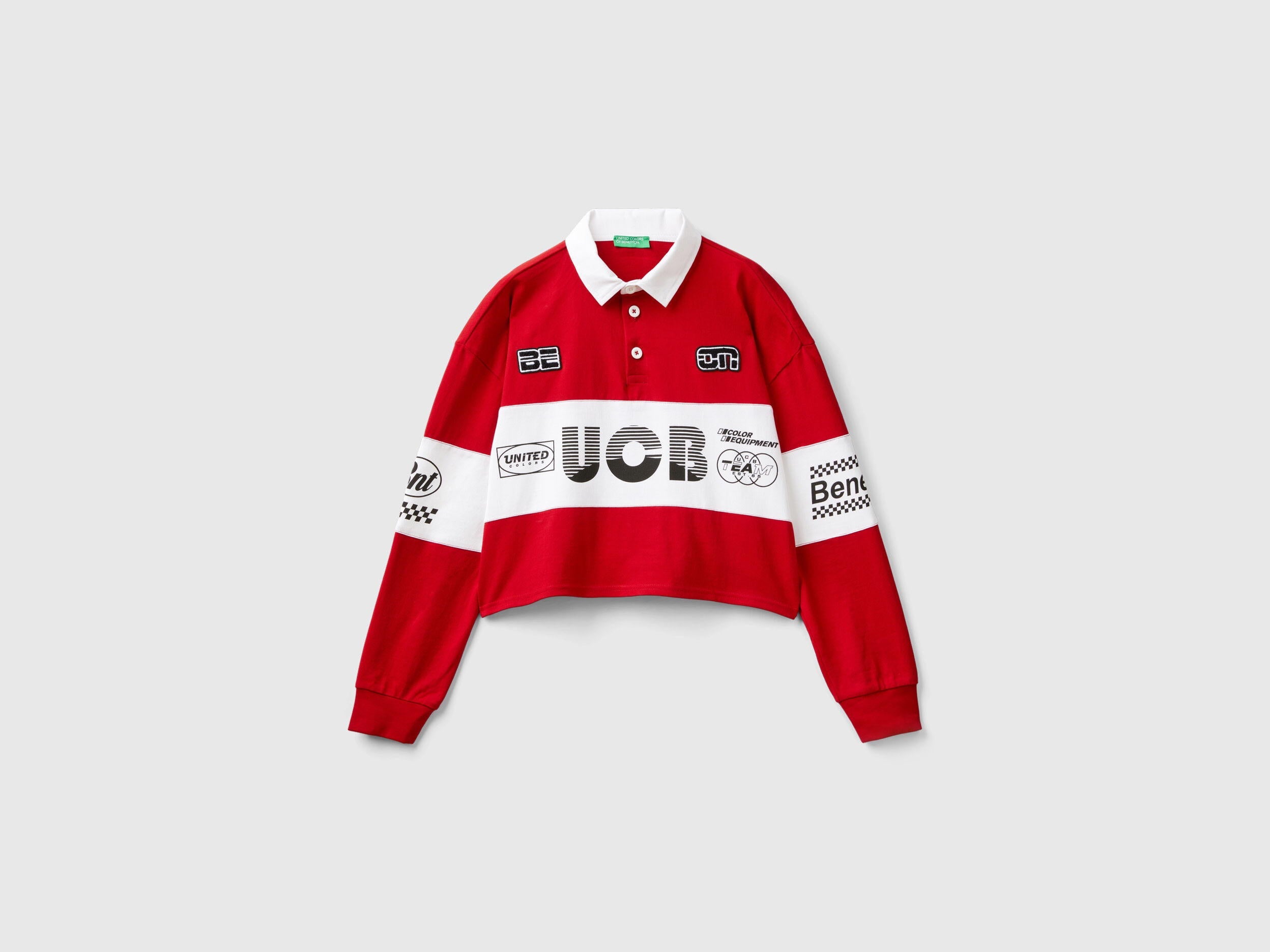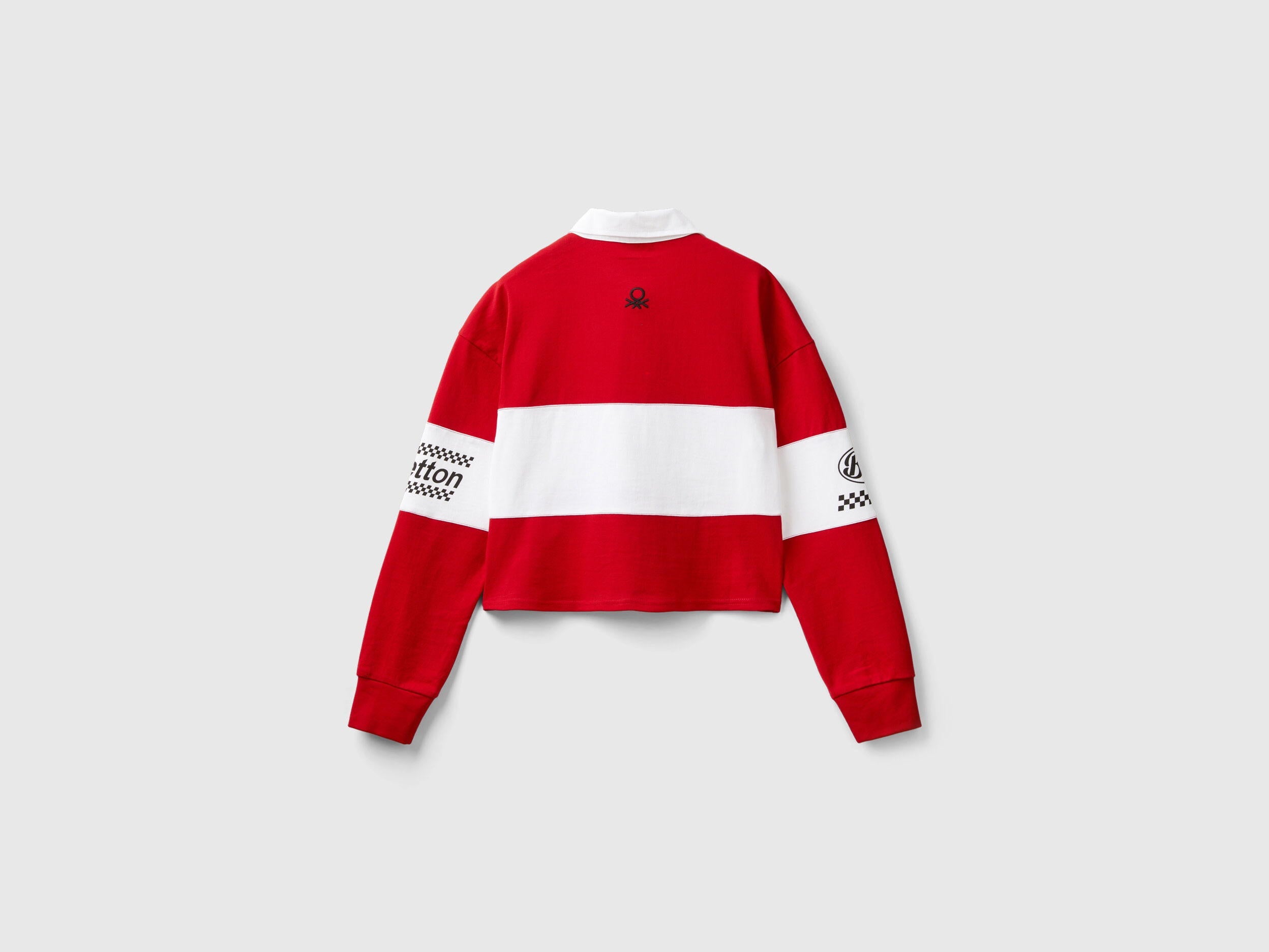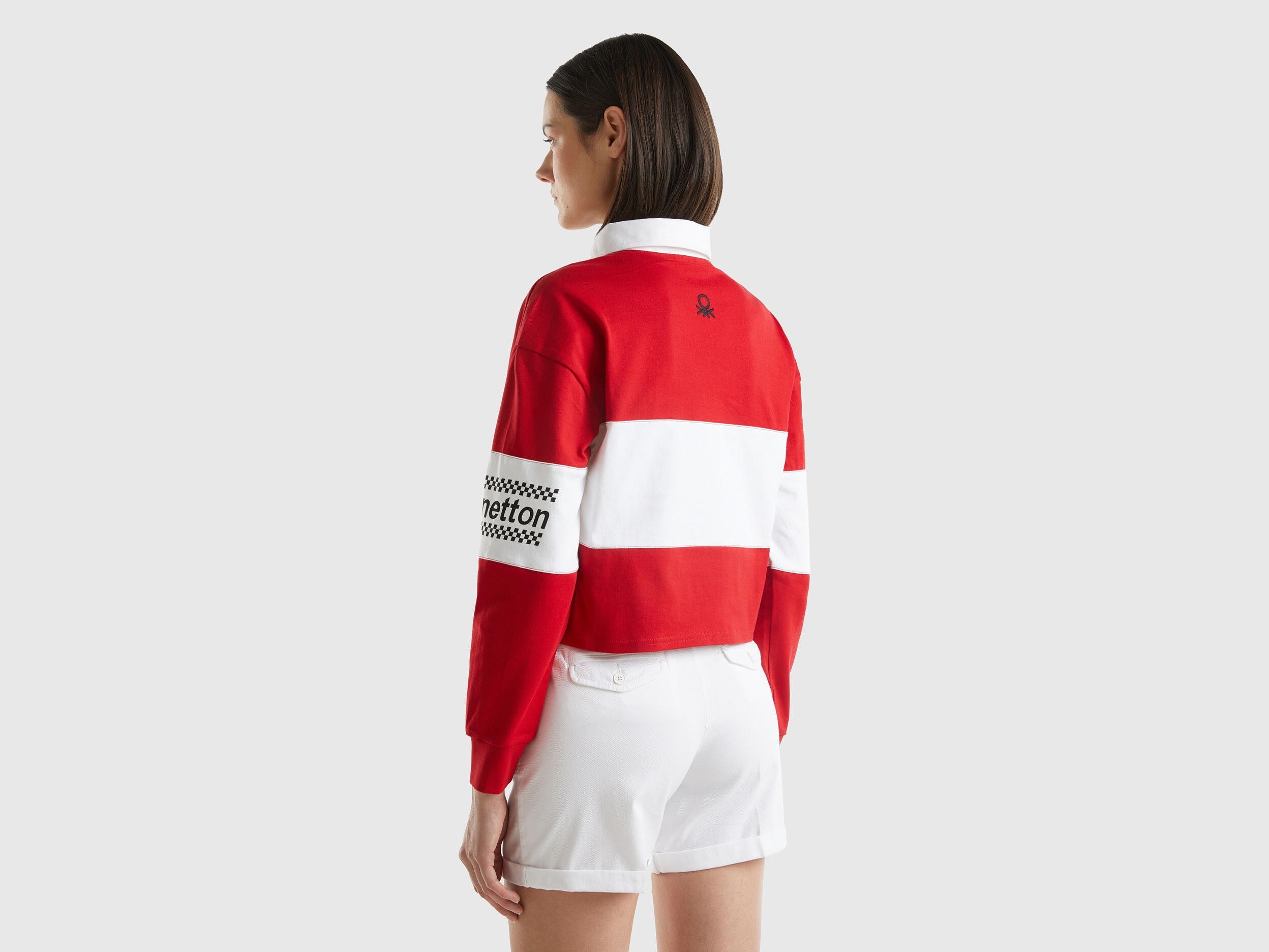 Long sleeve polo in pure cotton jersey with cropped fit, with clashing classic collar and partial front buttoning. Patch applique at breast, text print on clashing front band and on sleeves, embroidered logo at back. Rugby inspiration with a vintage touch for a new cult classic in the women's casual wardrobe, brimming in Benetton style.