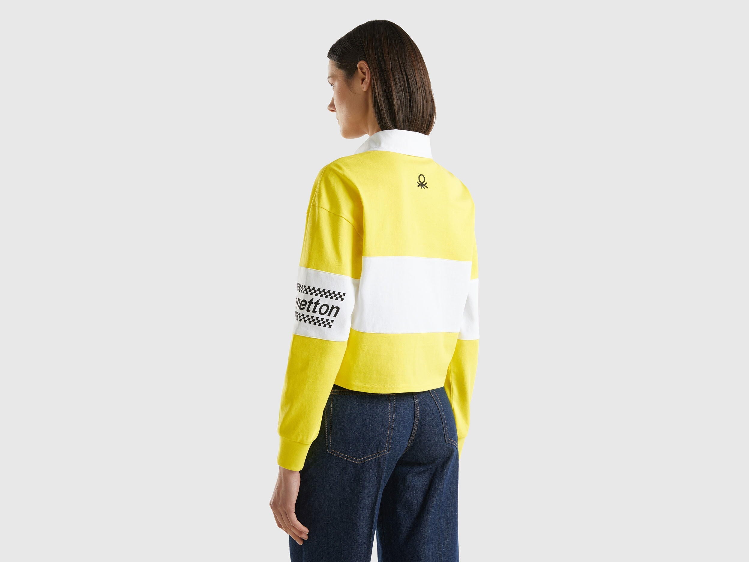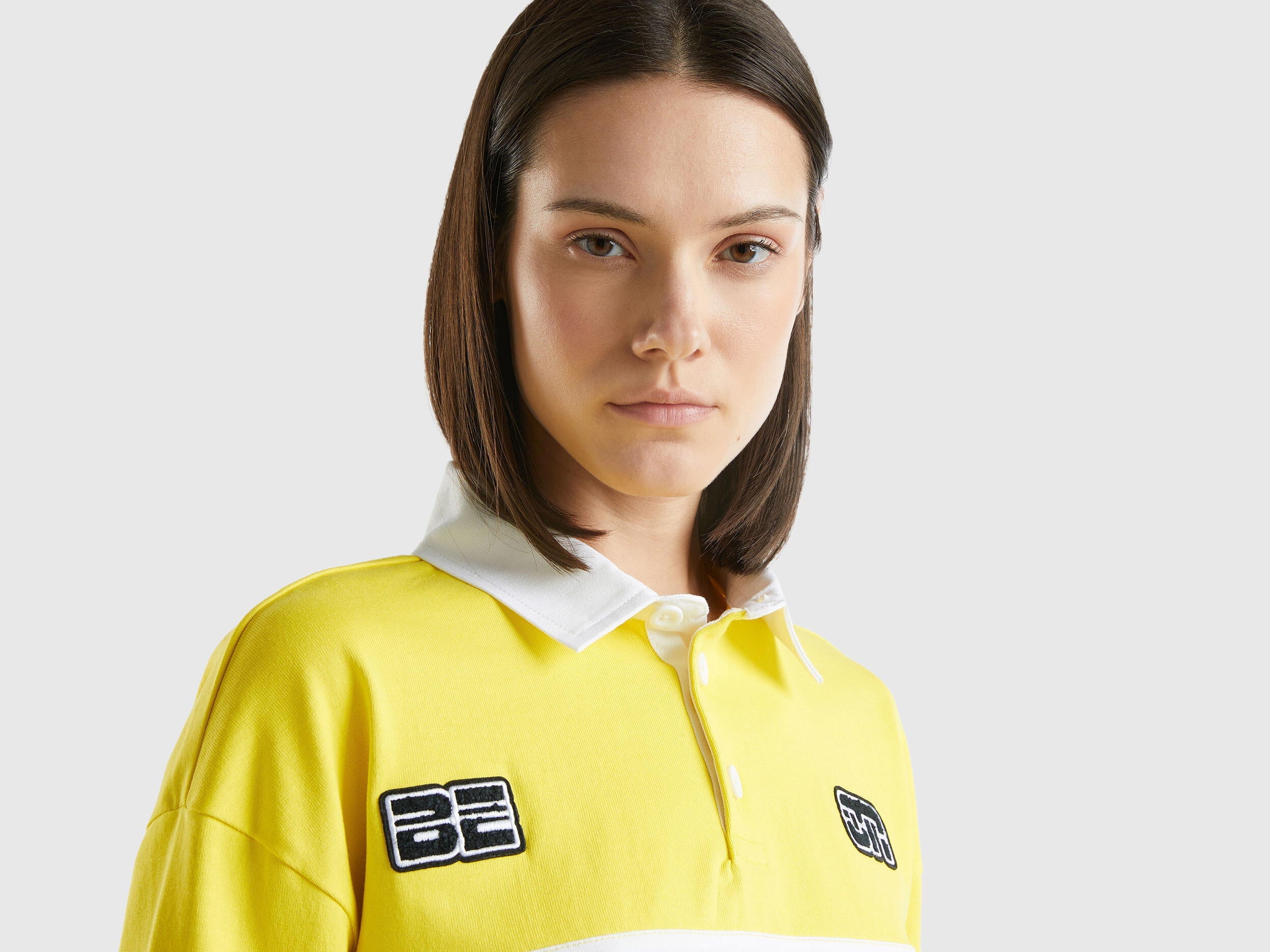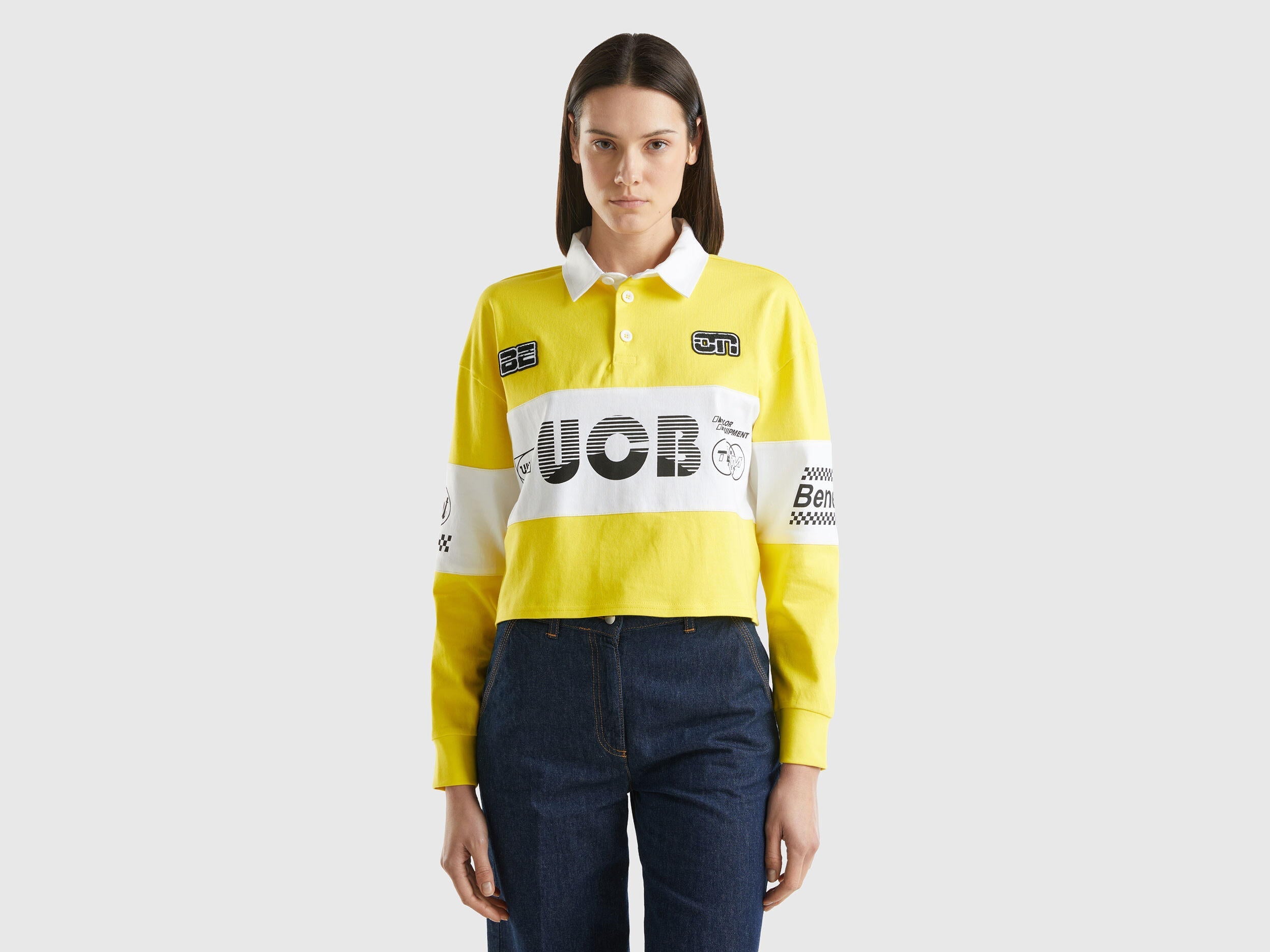 Long sleeve polo in pure cotton jersey with cropped fit, with clashing classic collar and partial front buttoning. Patch applique at breast, text print on clashing front band and on sleeves, embroidered logo at back. Rugby inspiration with a vintage touch for a new cult classic in the women's casual wardrobe, brimming in Benetton style.