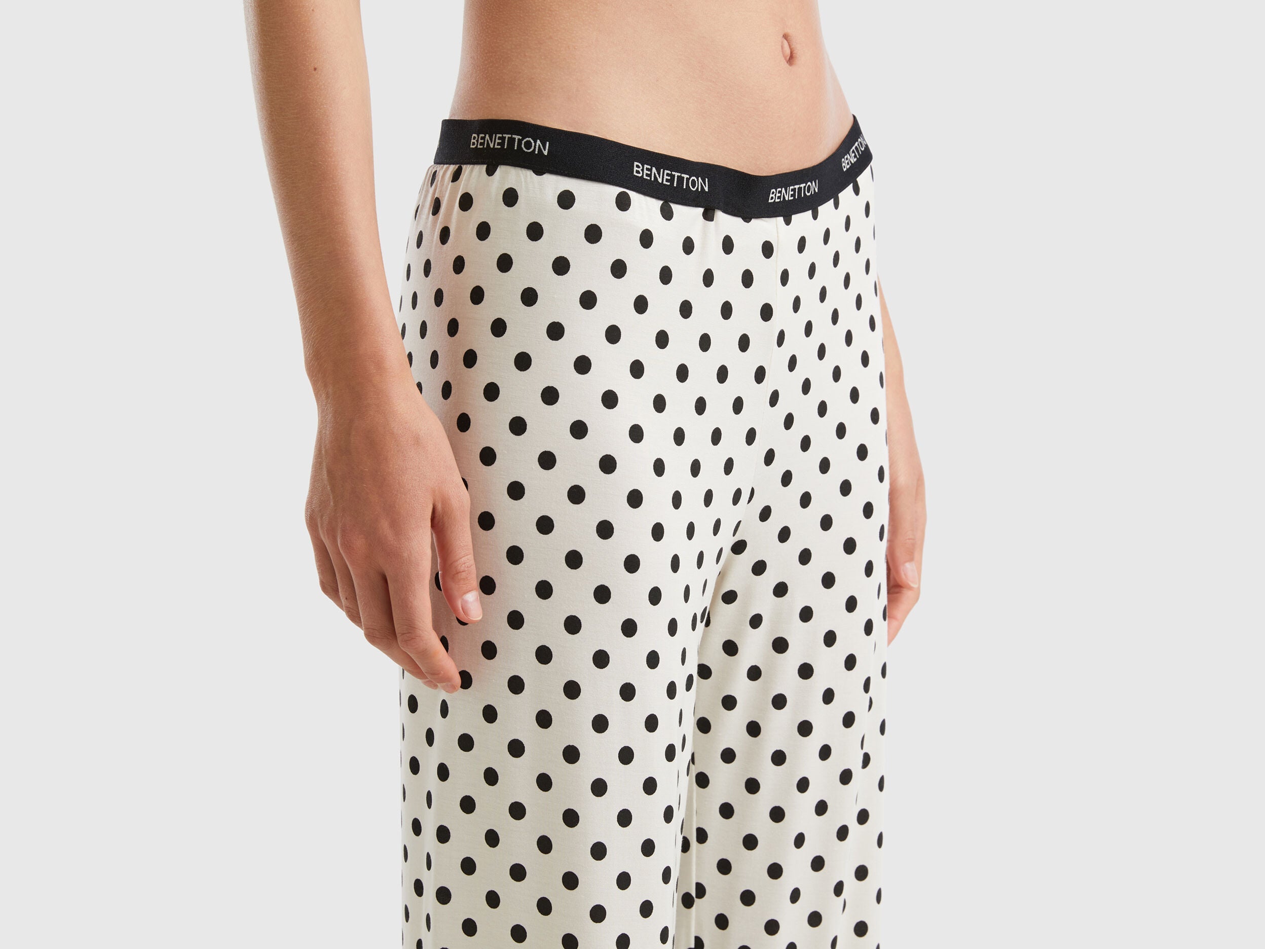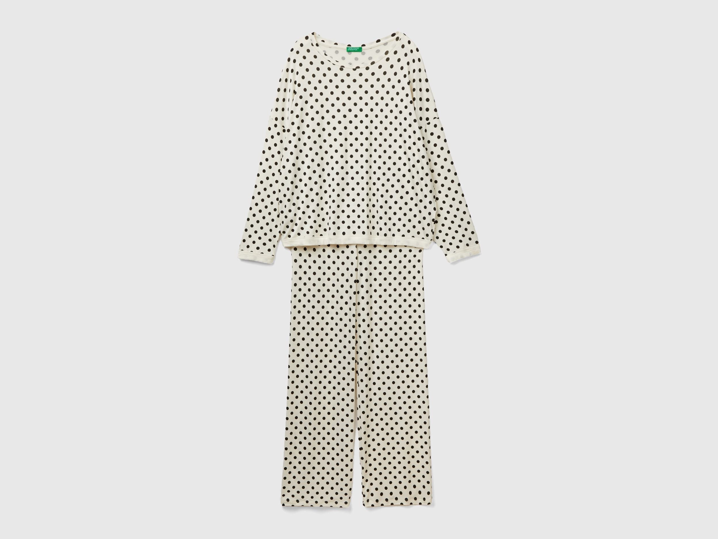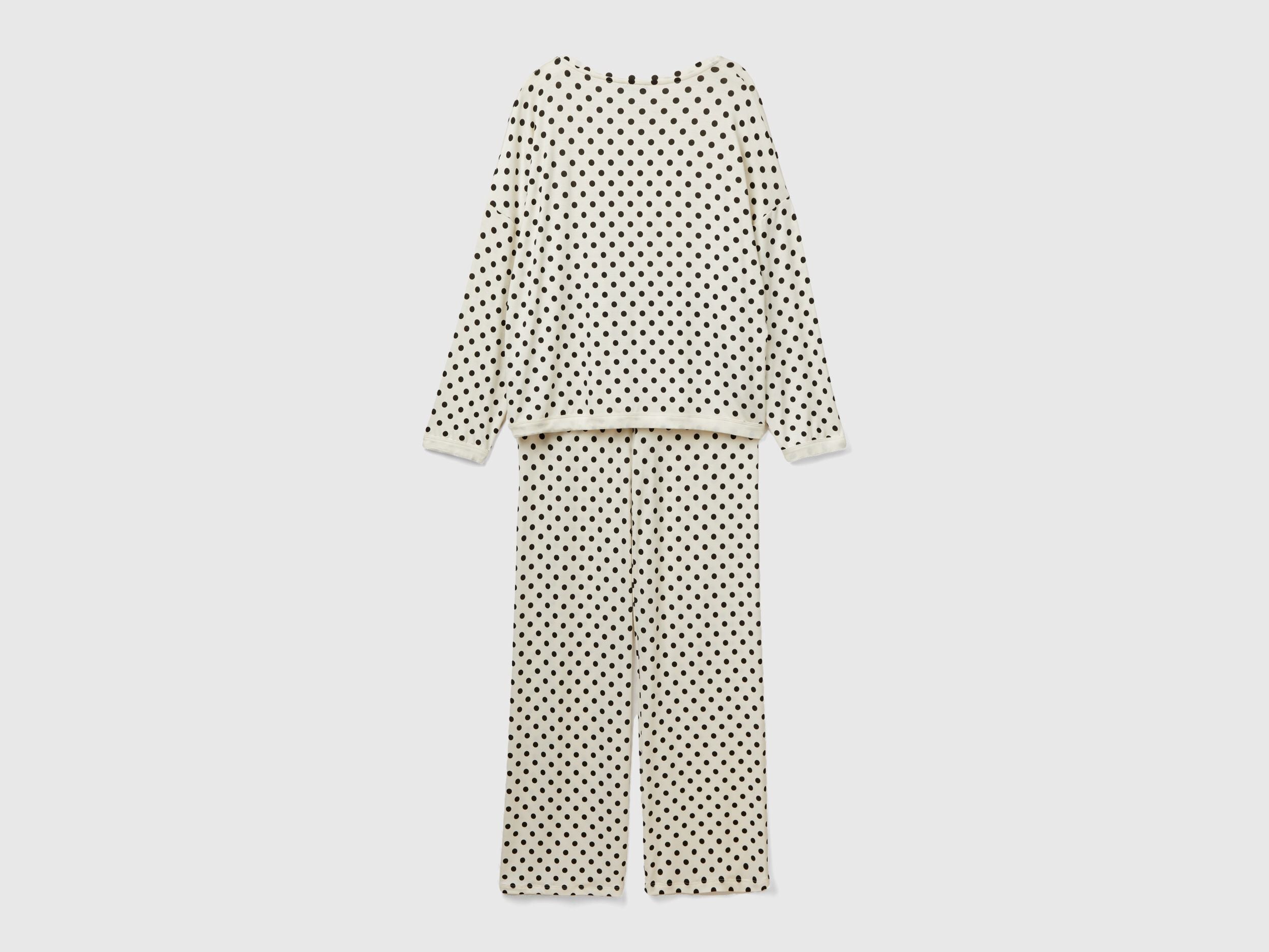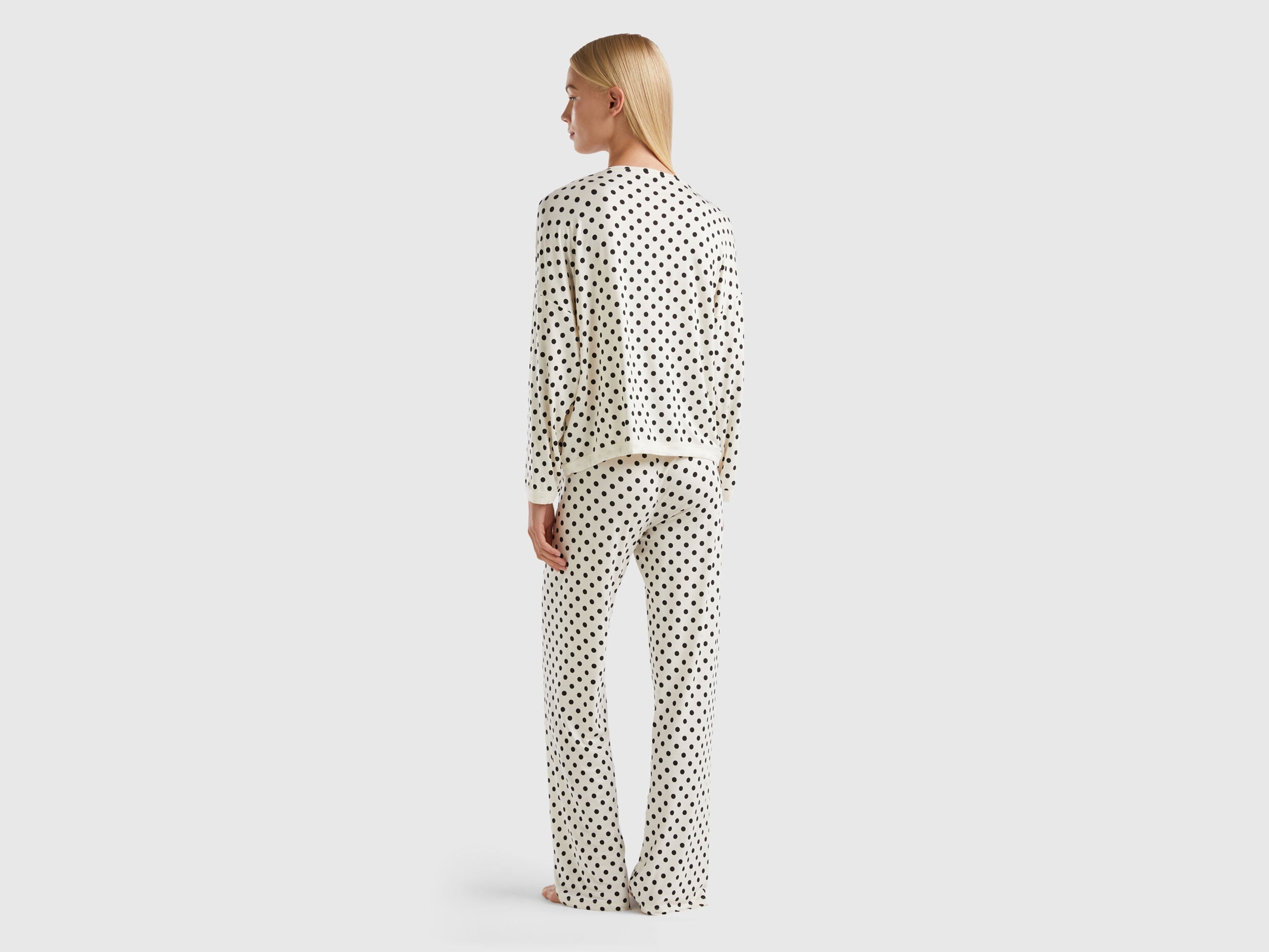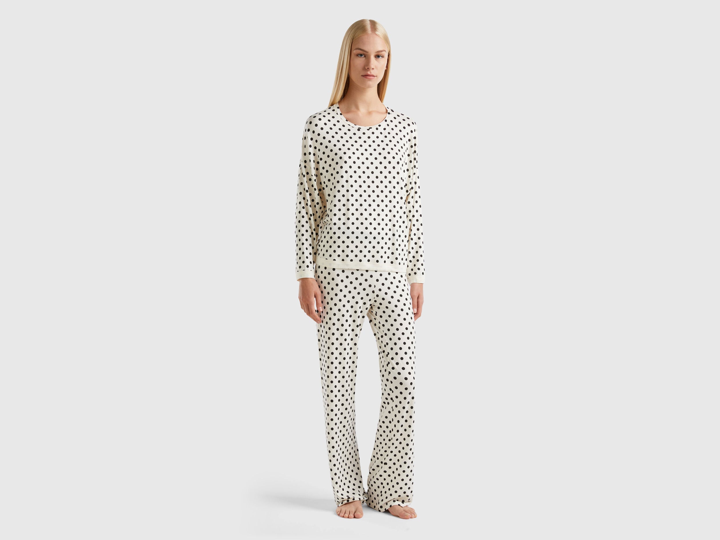 Flowy pyjamas with polka dot patterned print. Long-sleeved crew-neck top with dropped shoulders. Long bottoms with comfortable logoed elastic waistband. Made in sustainable viscose, produced using wood from certified forests and respecting the highest environmental standards.