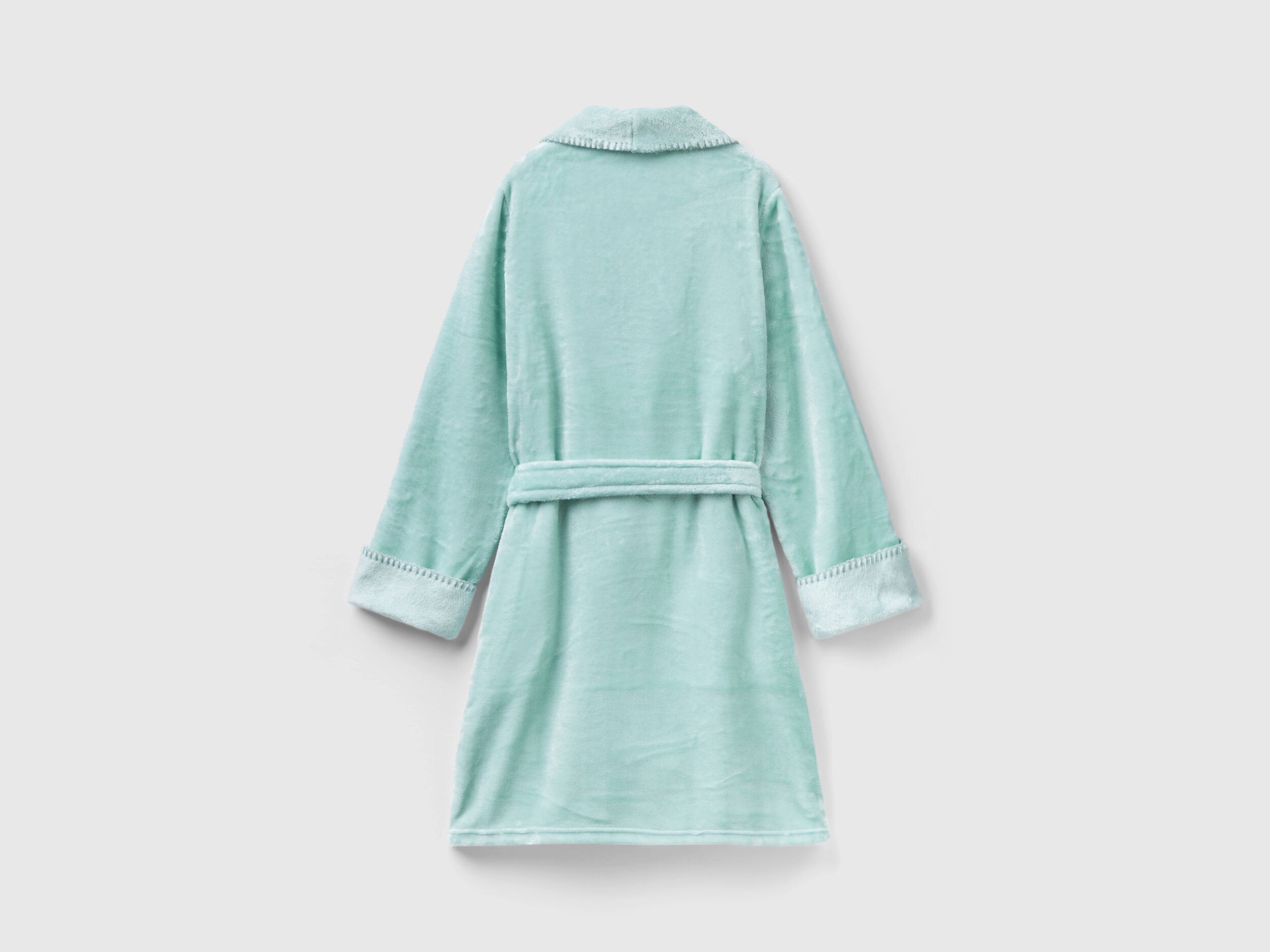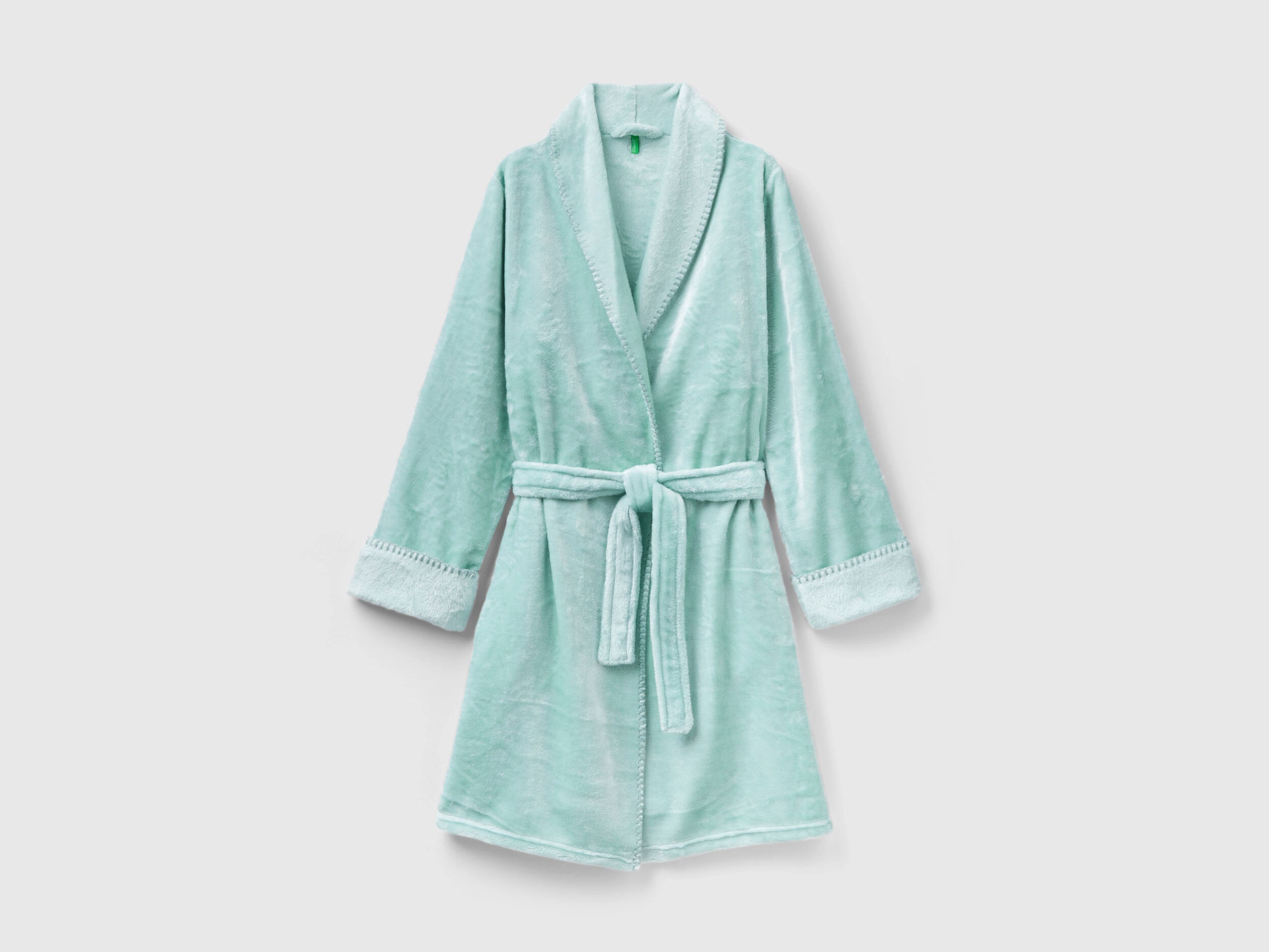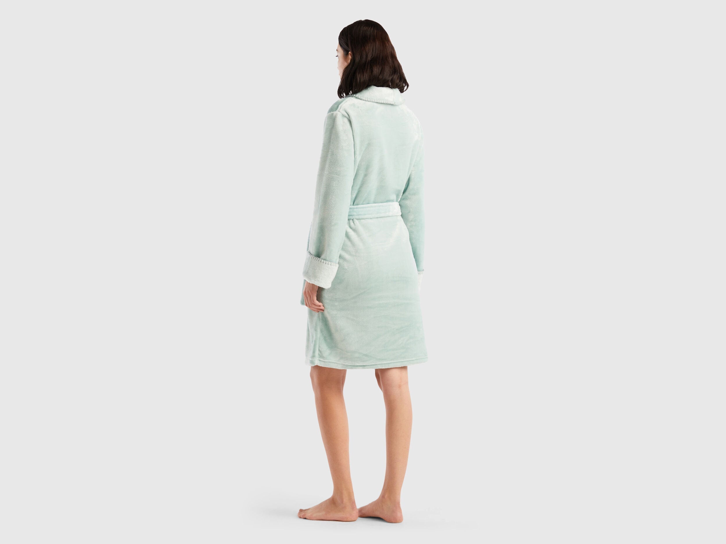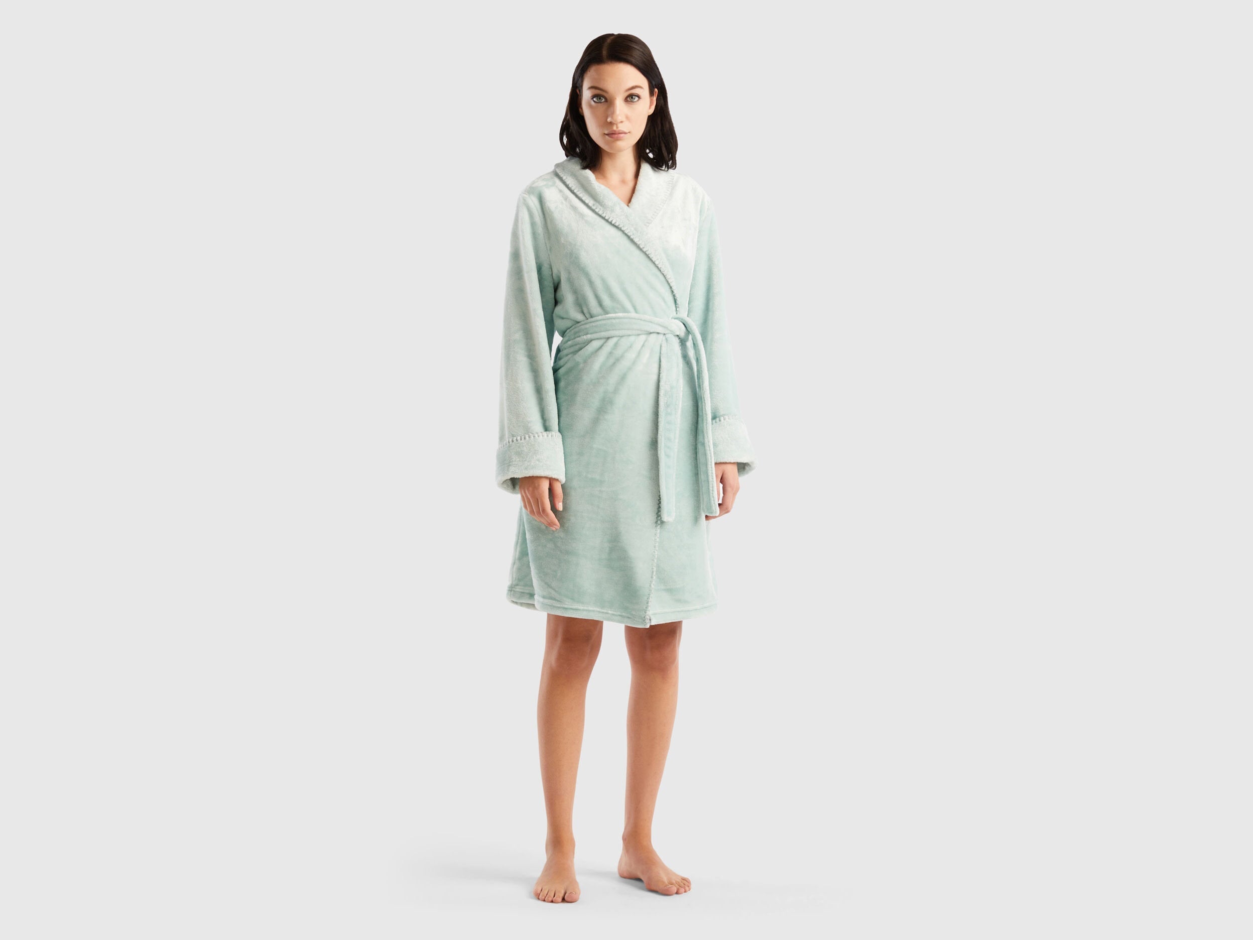 Long sleeve dressing gown in soft faux fur. Wide shawl neck, belt at the waist and pockets inserted at the sides. Perfect for warming up on relaxing days.