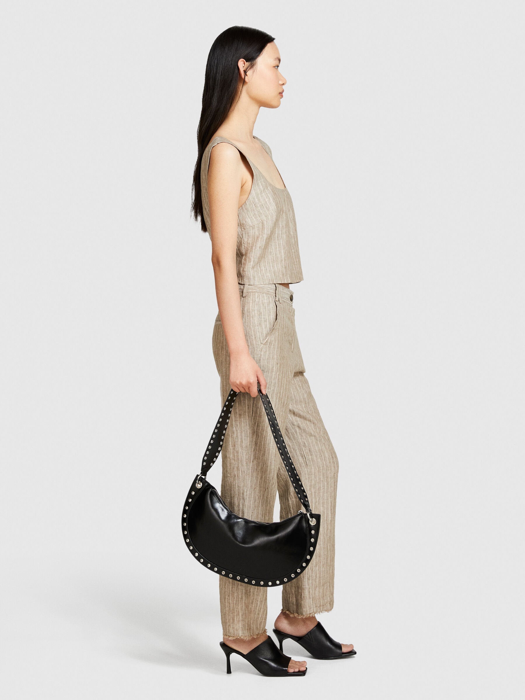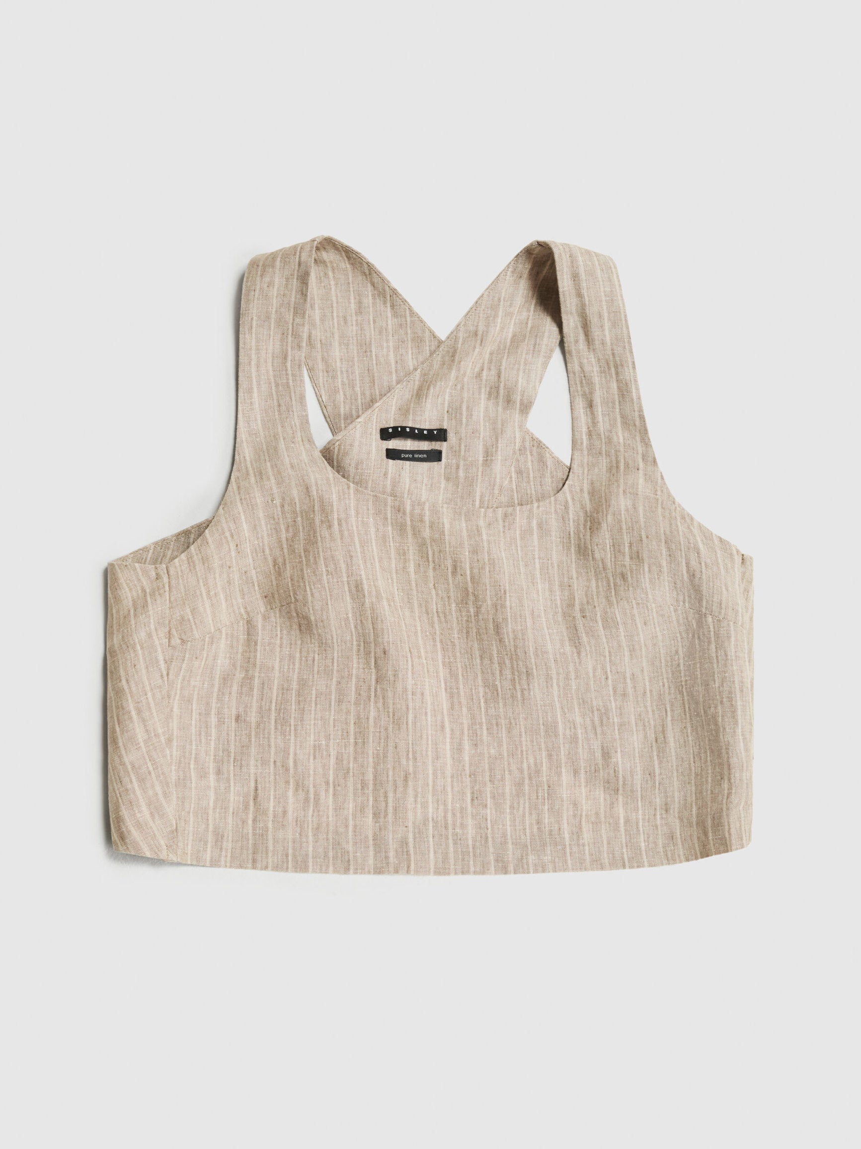 Boxy fit tank top in 100% yarn dyed pinstripe pattern linen. Square neck, wide shoulders, twisted bands on back and side closure with invisible zipper.