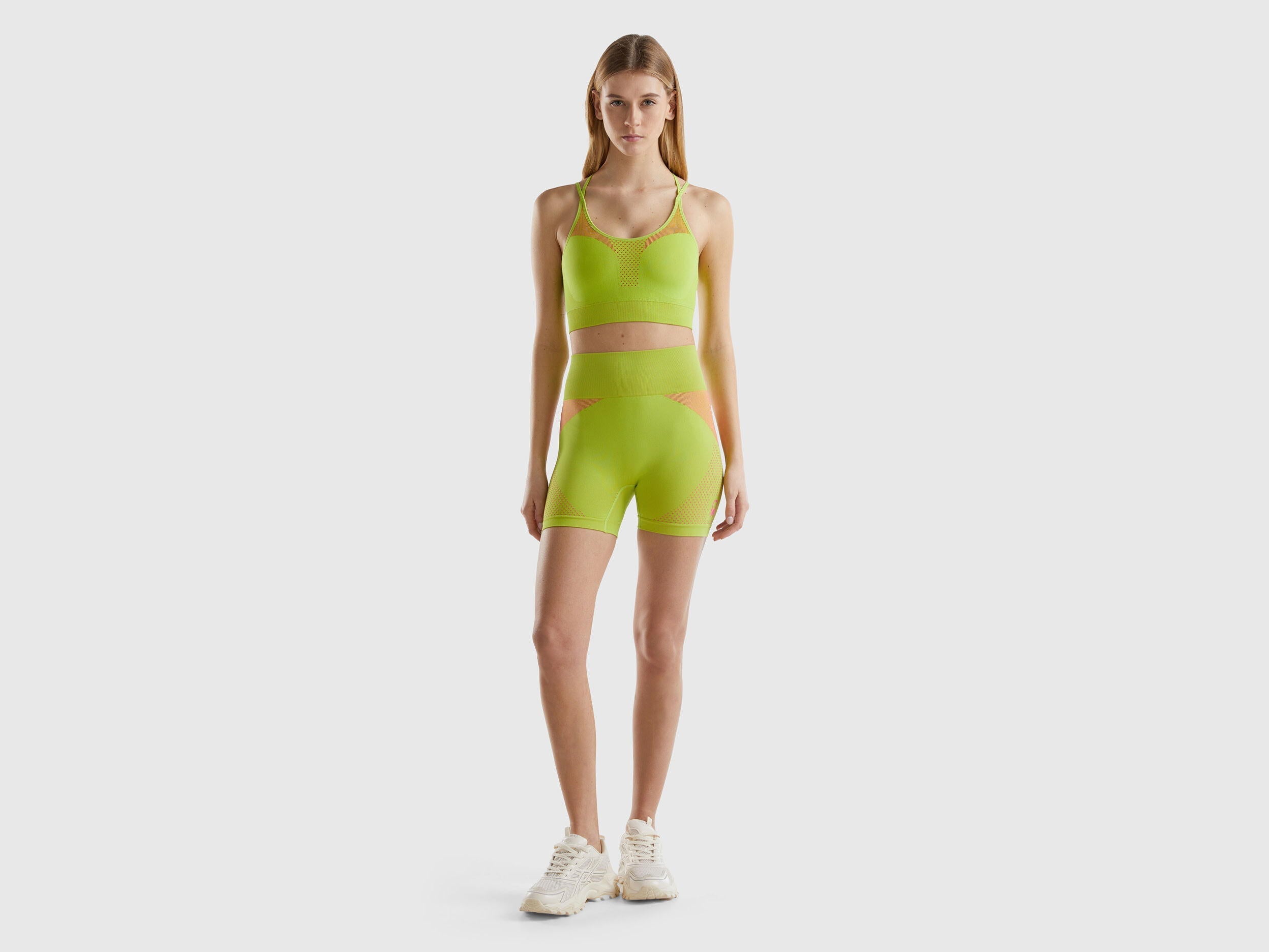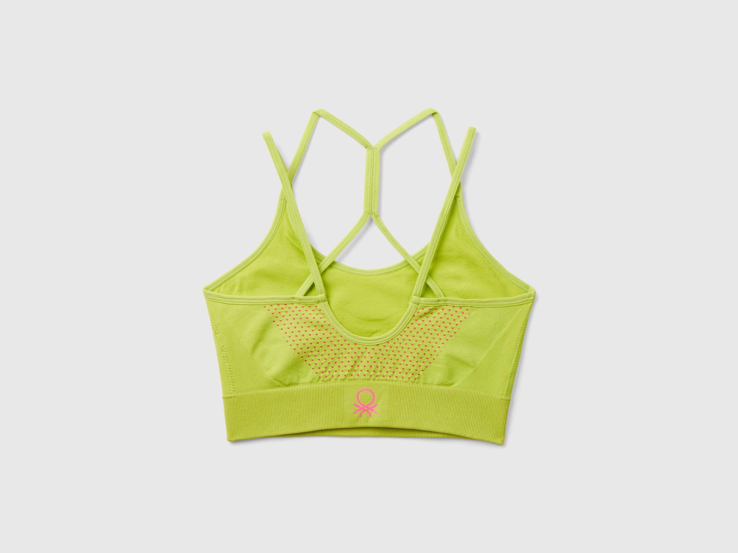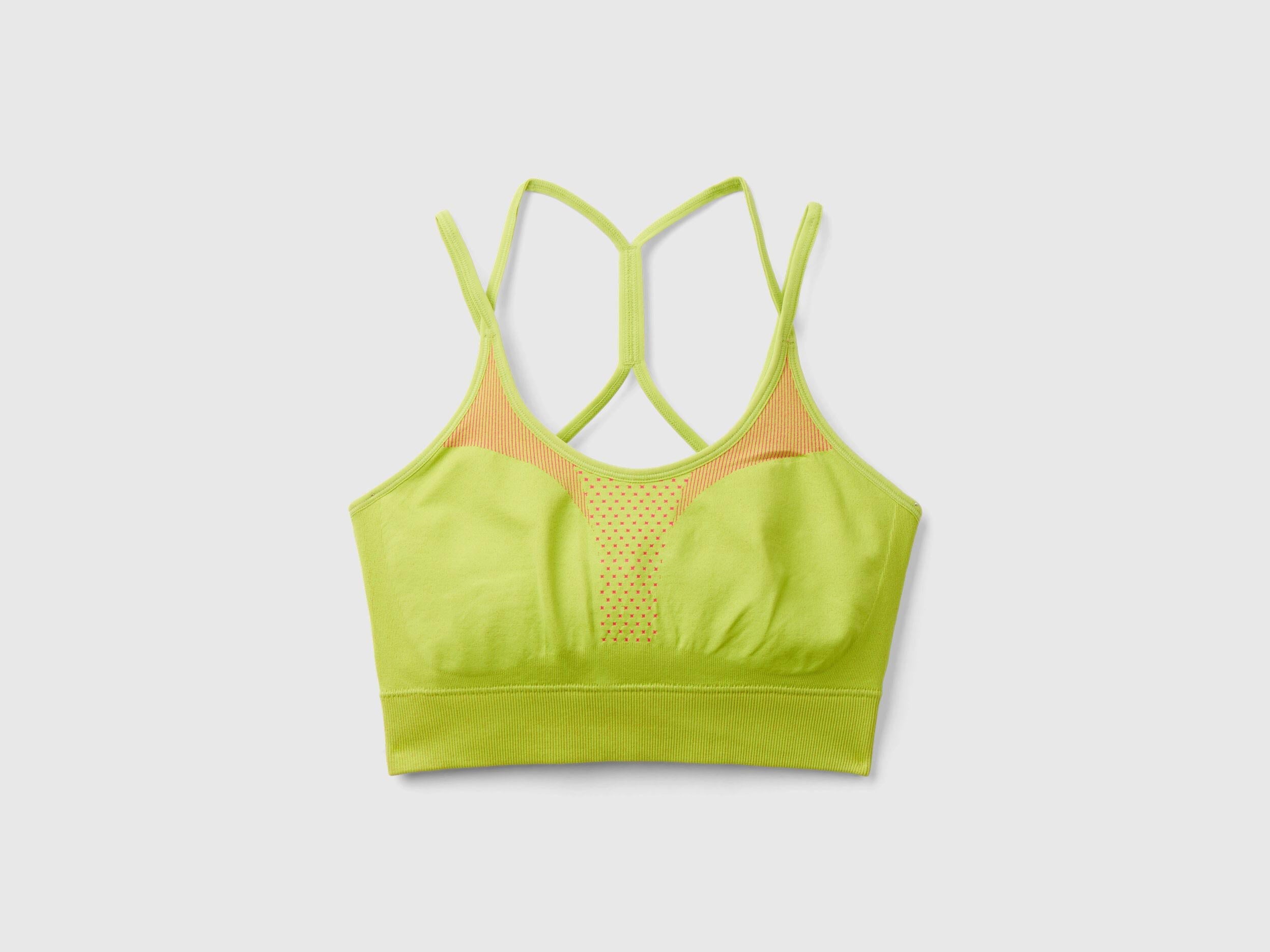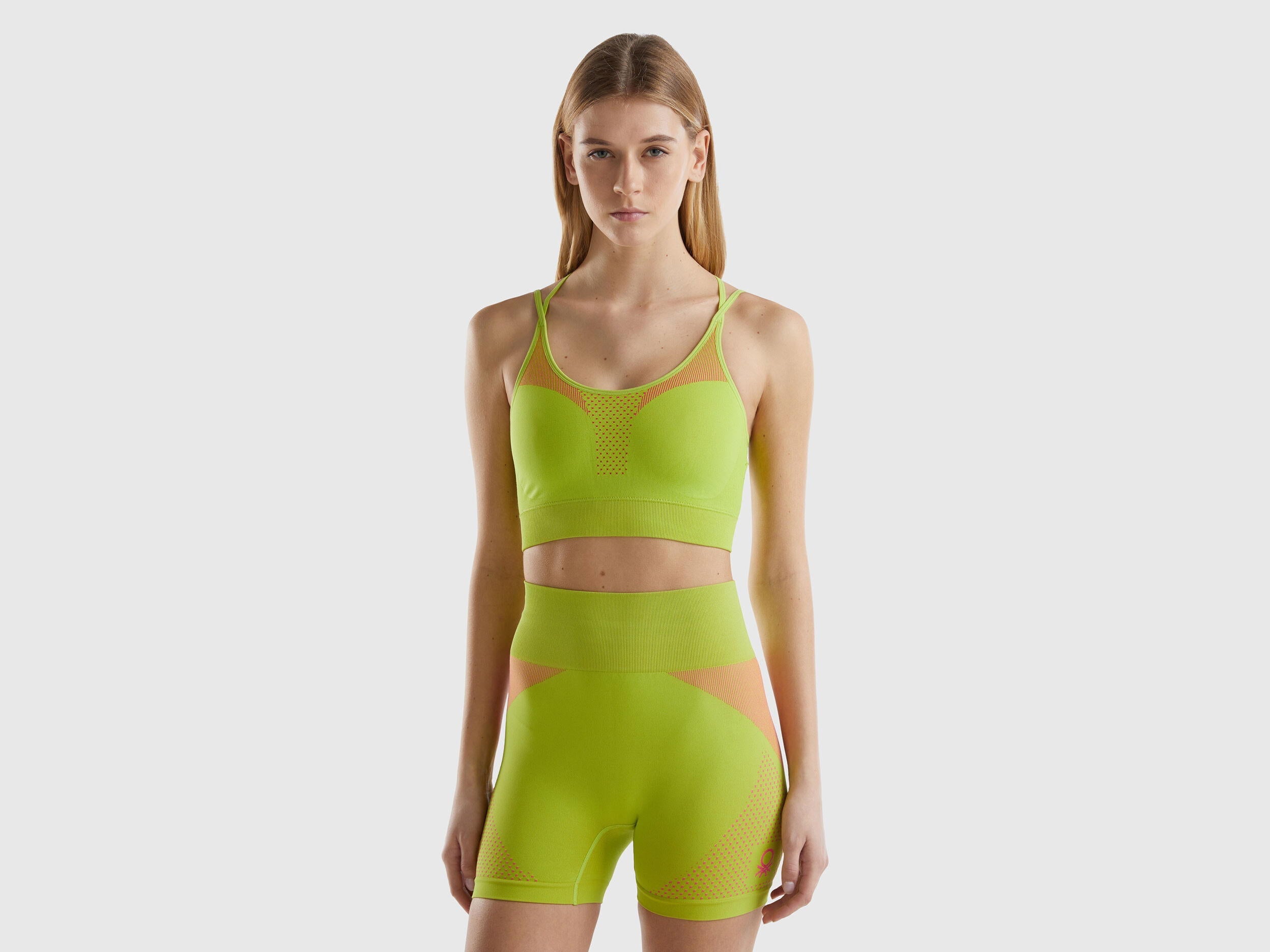 Seamless bra top in stretch recycled nylon blend. Fitted two-tone model, which adapts perfectly to the body. Round neckline and double thin straps with crisscross back to offer greater support. Our line of activewear is designed to combine comfort and functionality, ideal for fitness.