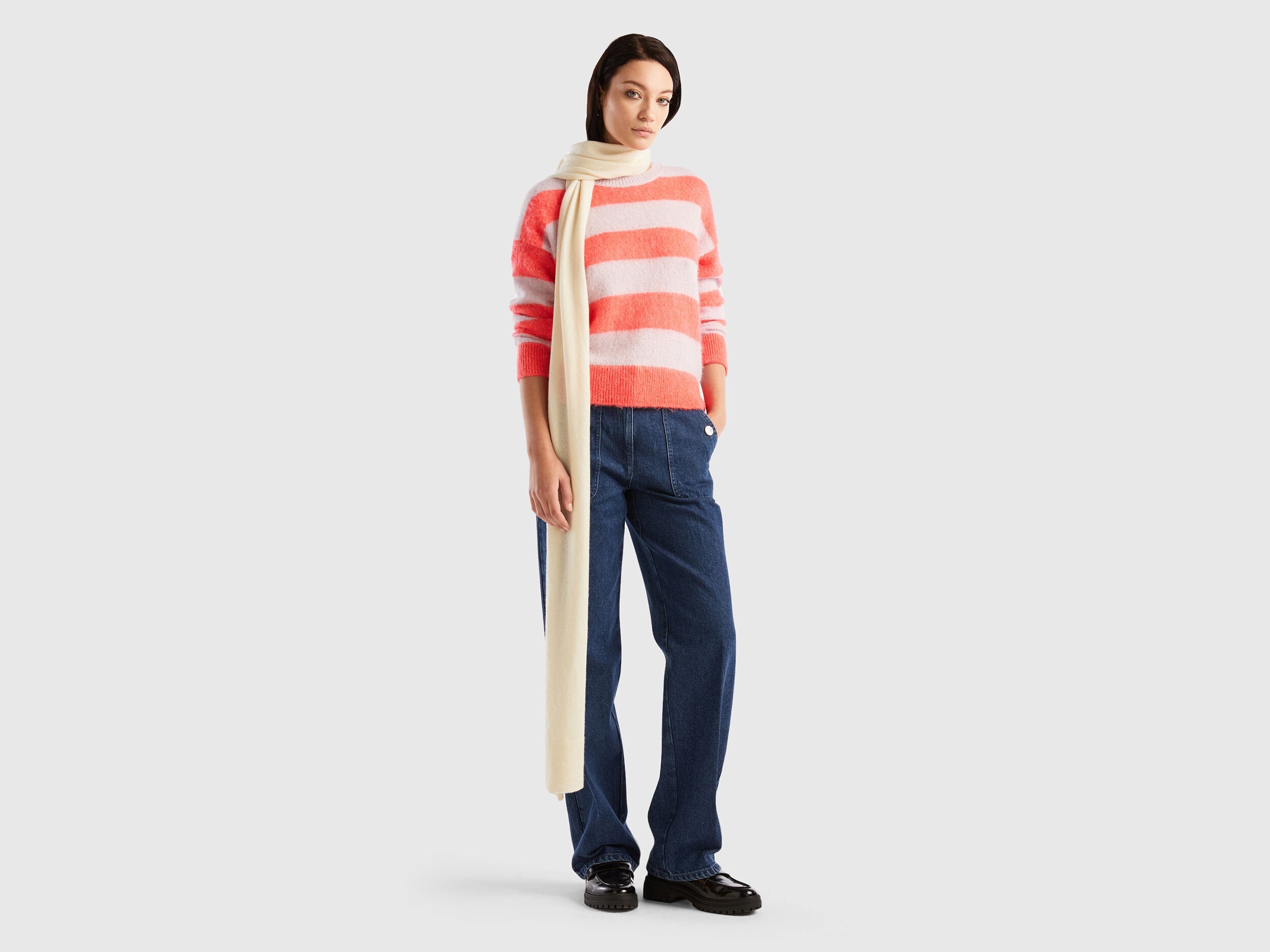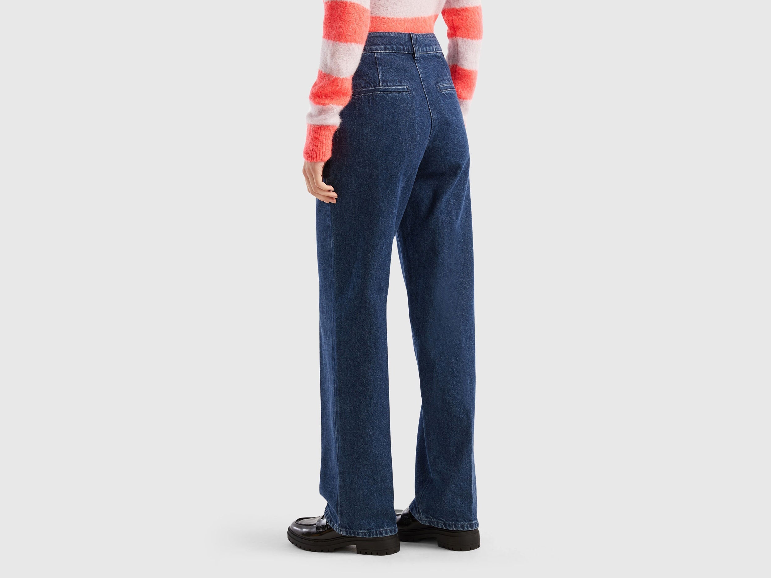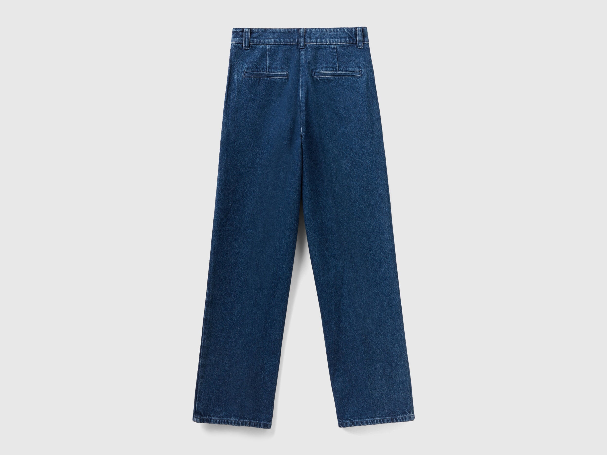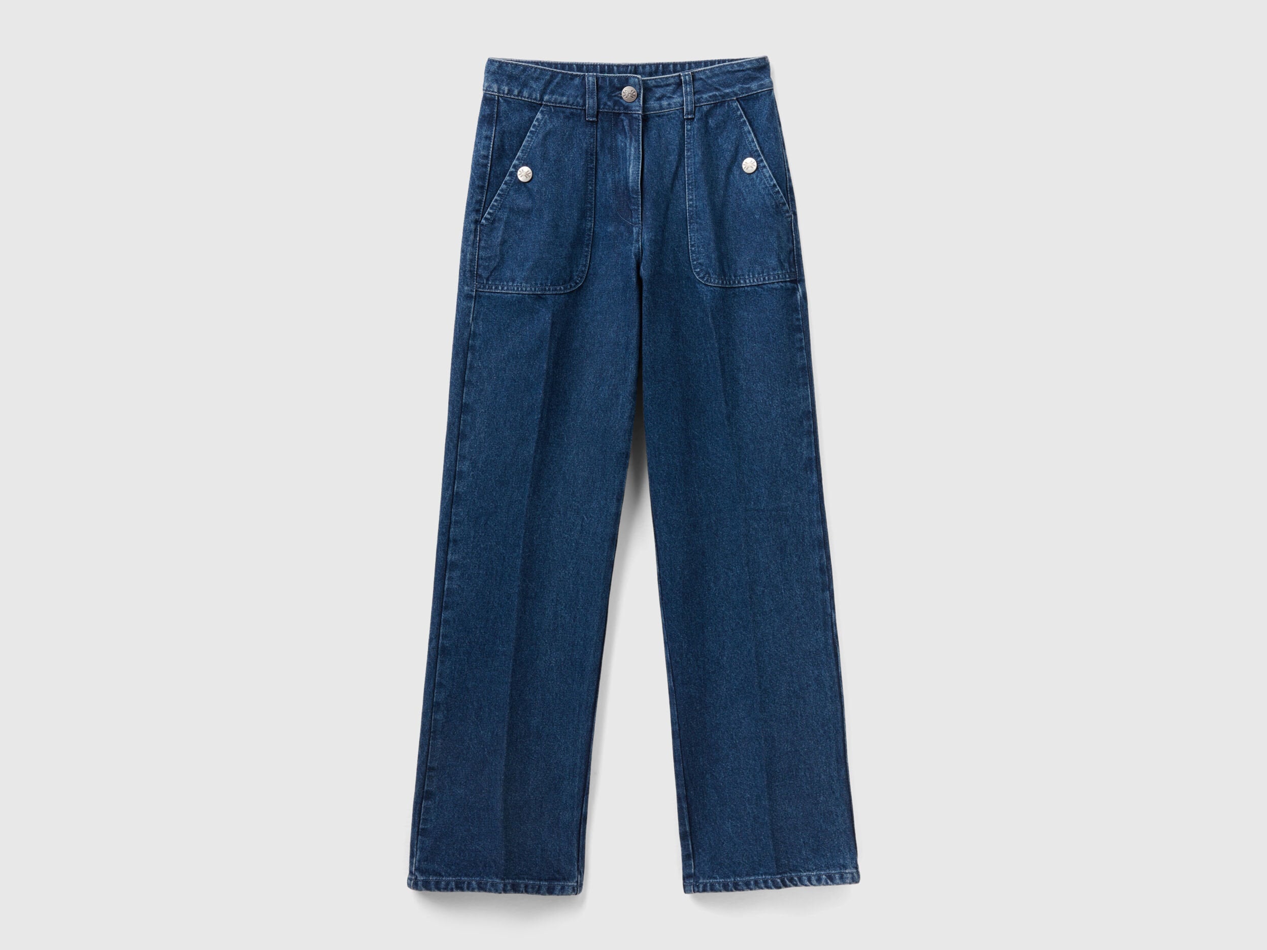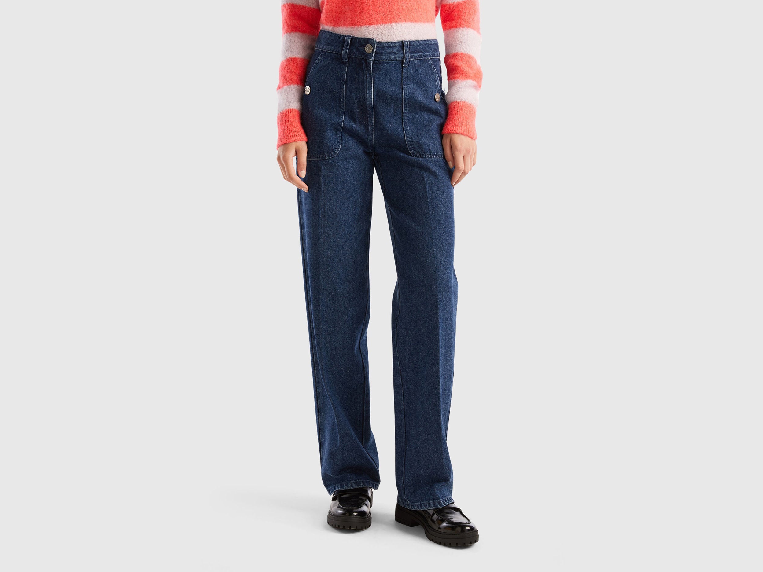 Long trousers in pure cotton denim with straight, relaxed legs. Practical opening with zip and button, large front pockets with button and welt pockets on the back. Versatile and contemporary.
