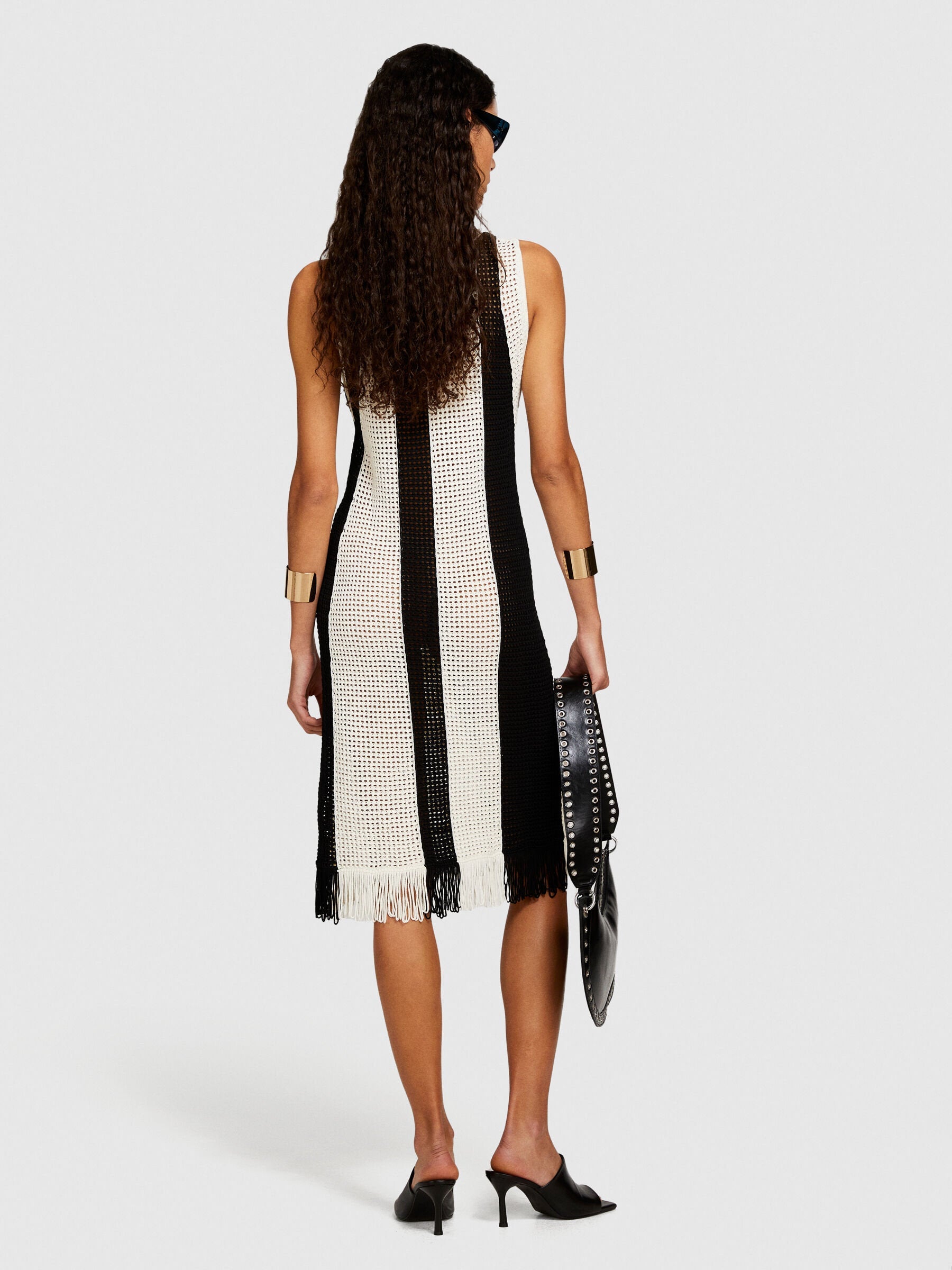 Viscose blend knit dress, with perforated two-tone stripes. Wide round neckline, wide tank shoulders and fringes at the bottom.