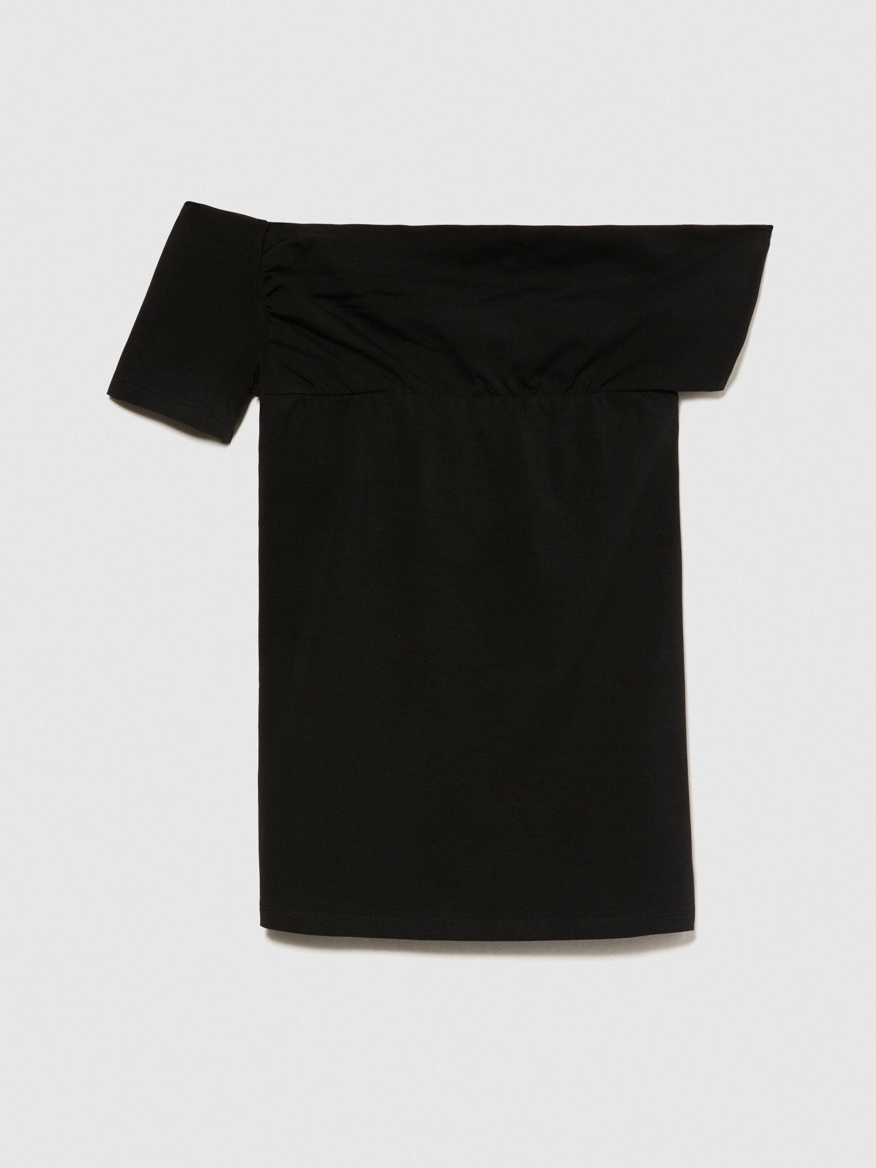 Slim fit top in stretch cotton jersey. Uneven standing neck with torchon motif, dropped shoulders and single short sleeves.