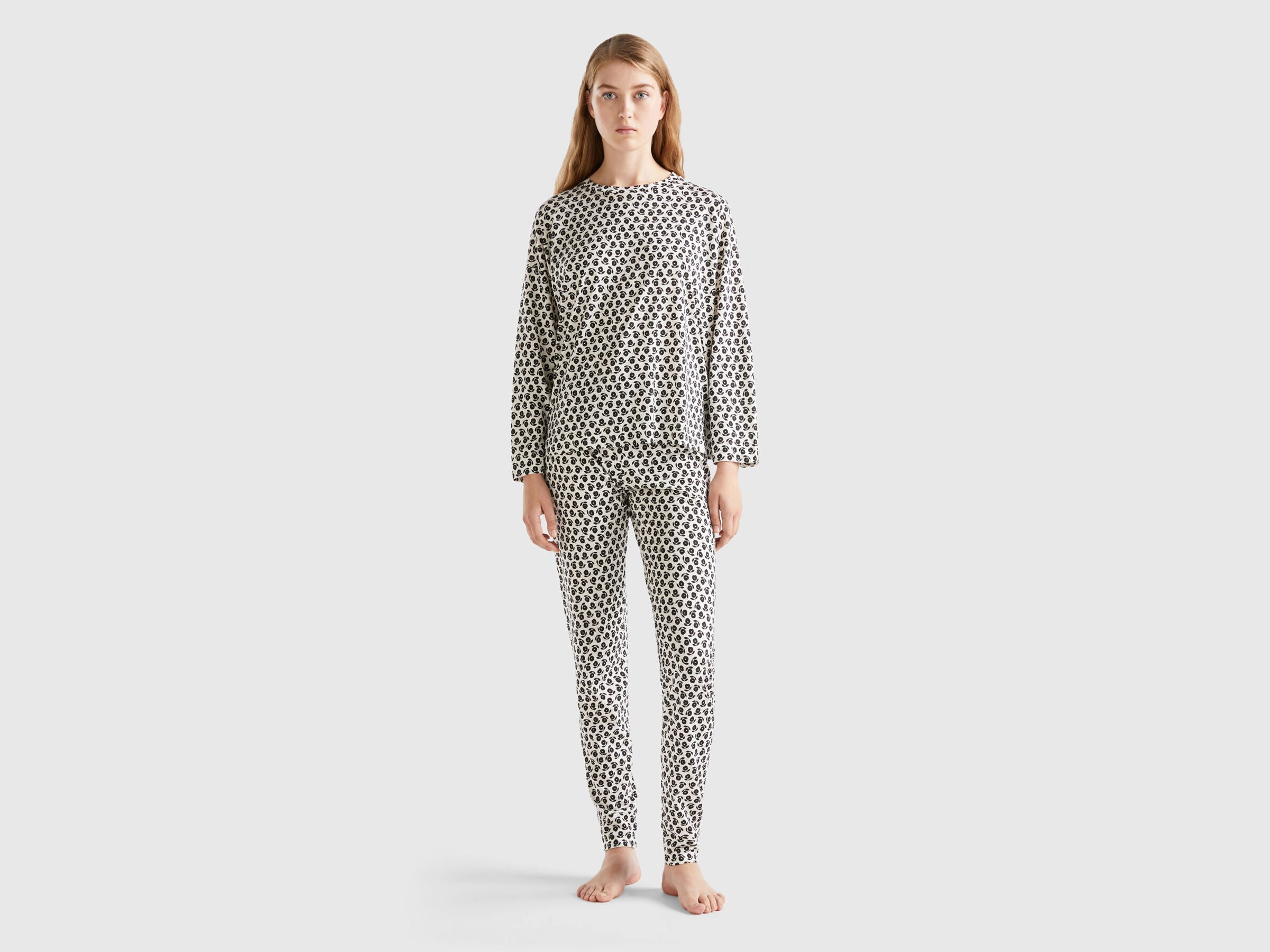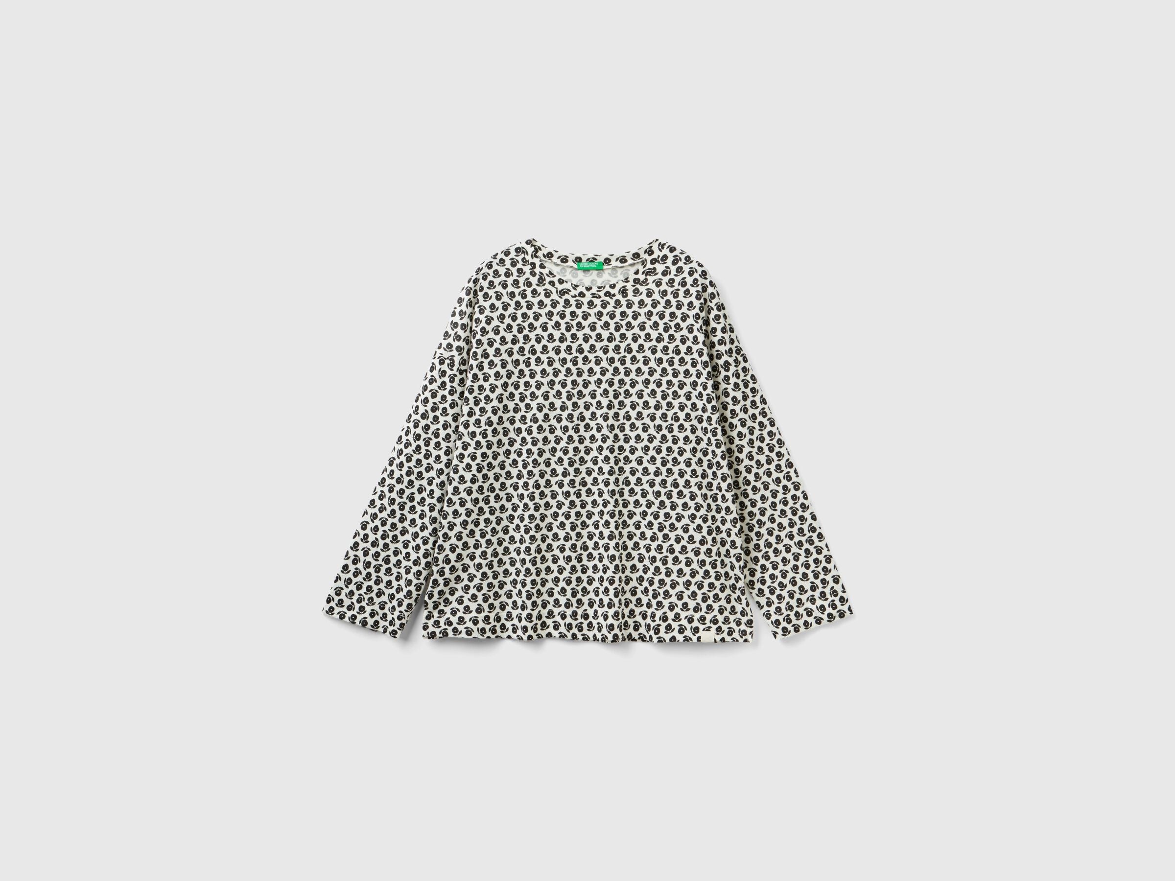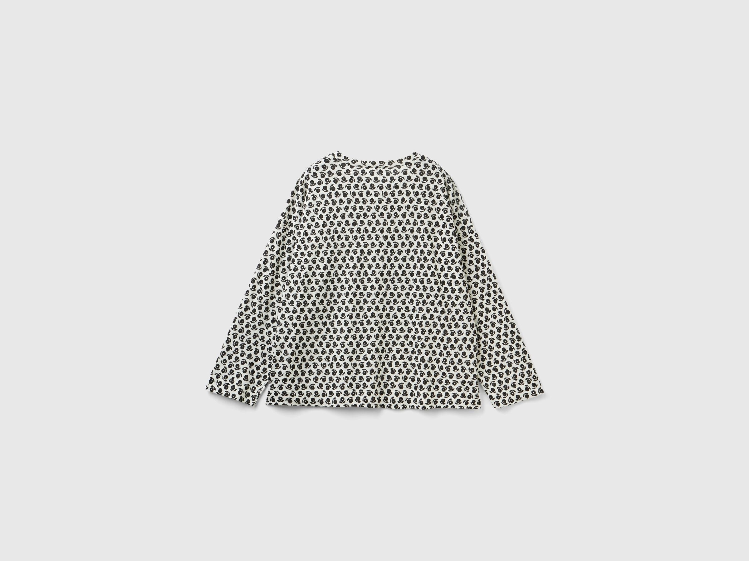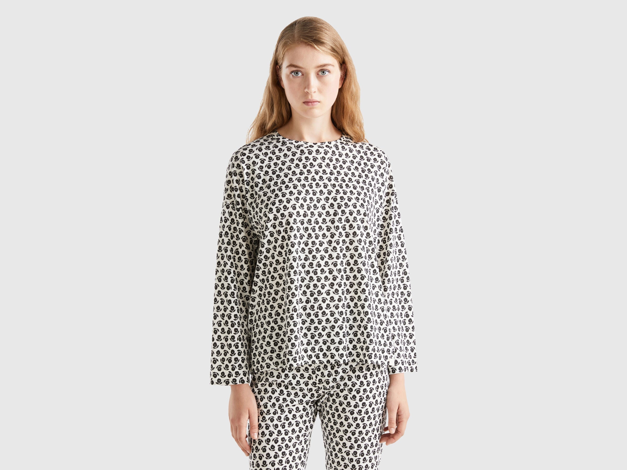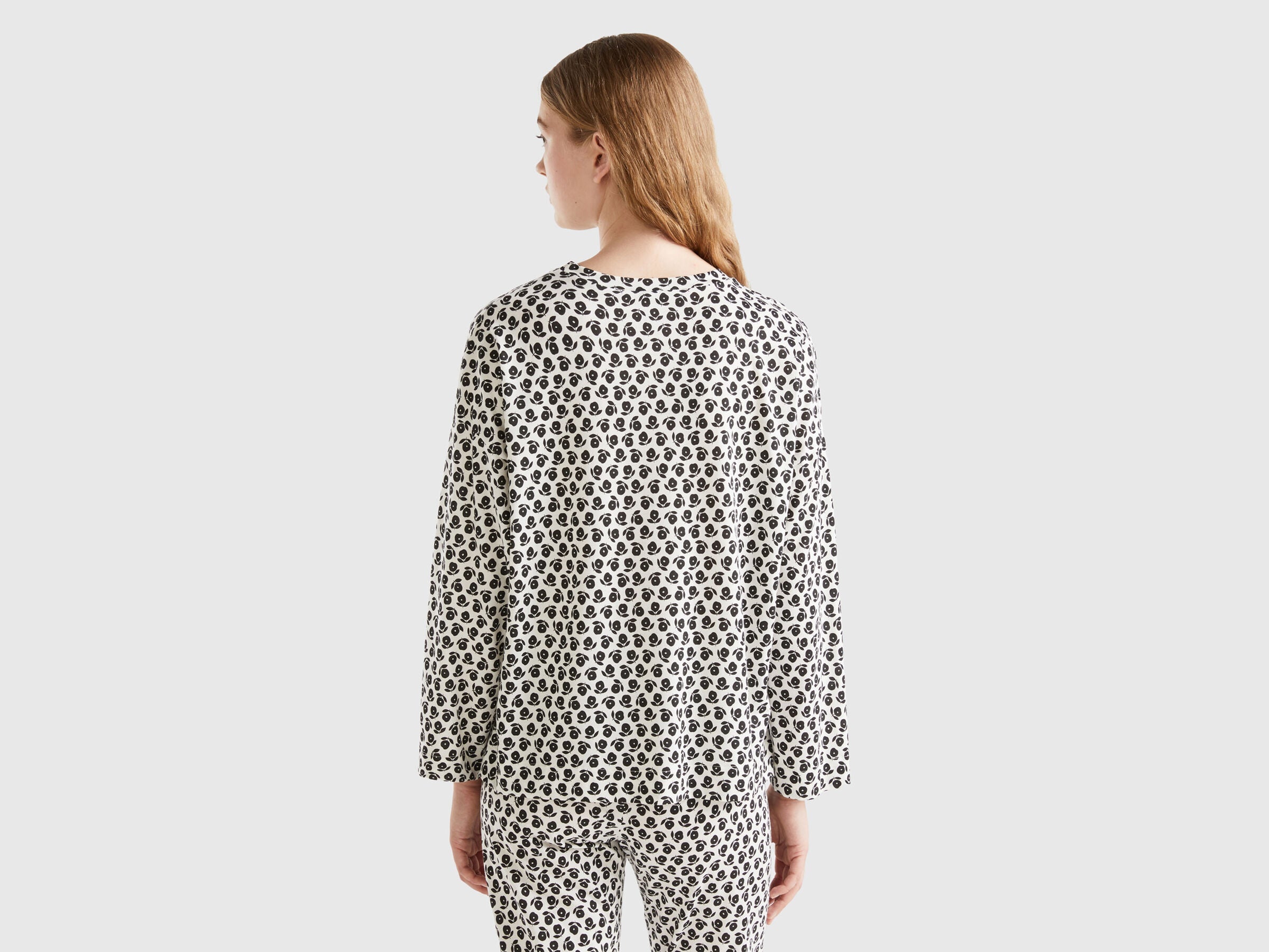 Round neck pyjama top in soft cotton and viscose blend fabric. Long sleeve, side slits on the bottom, black floral pattern on a white background all over the garment.