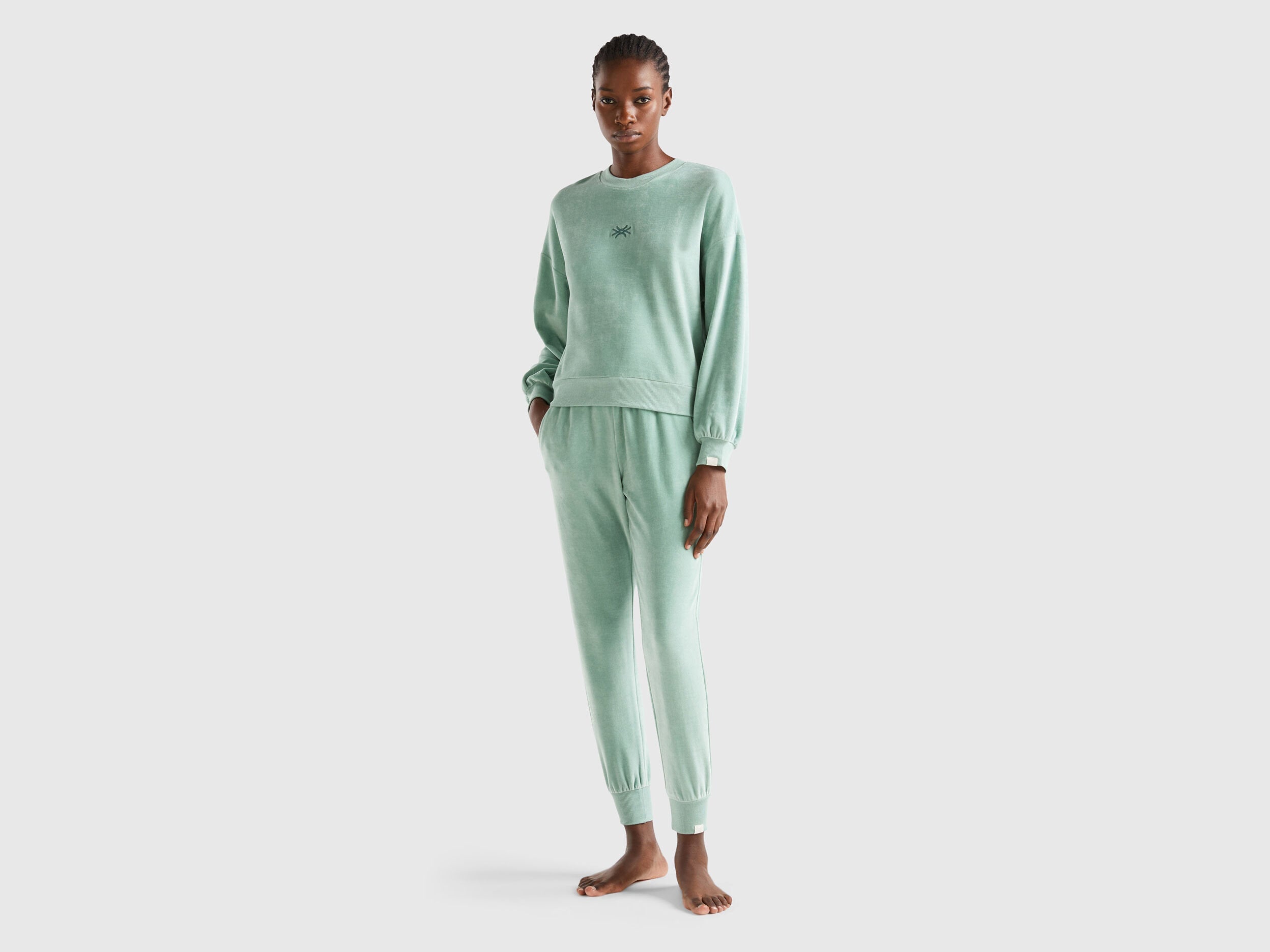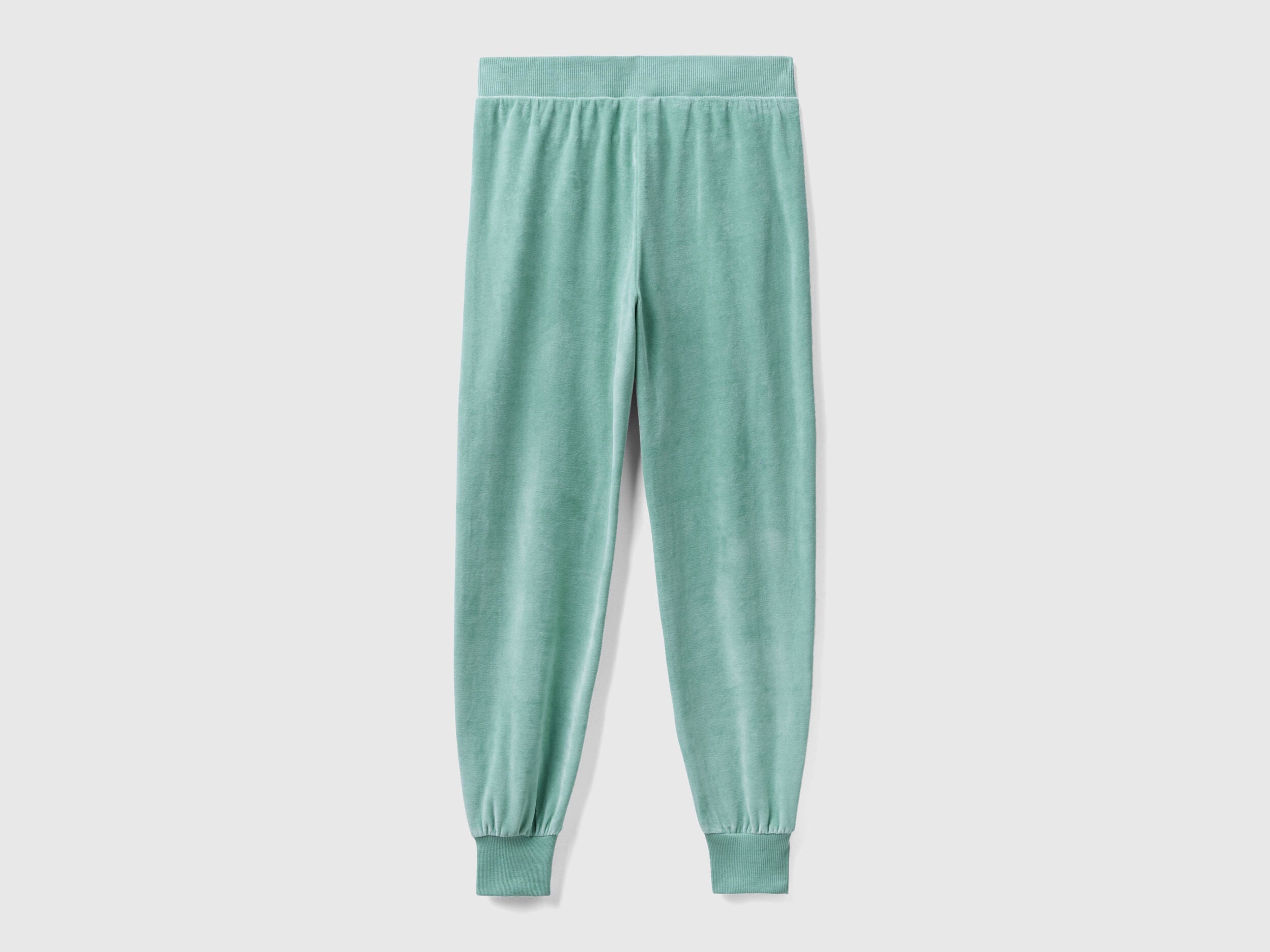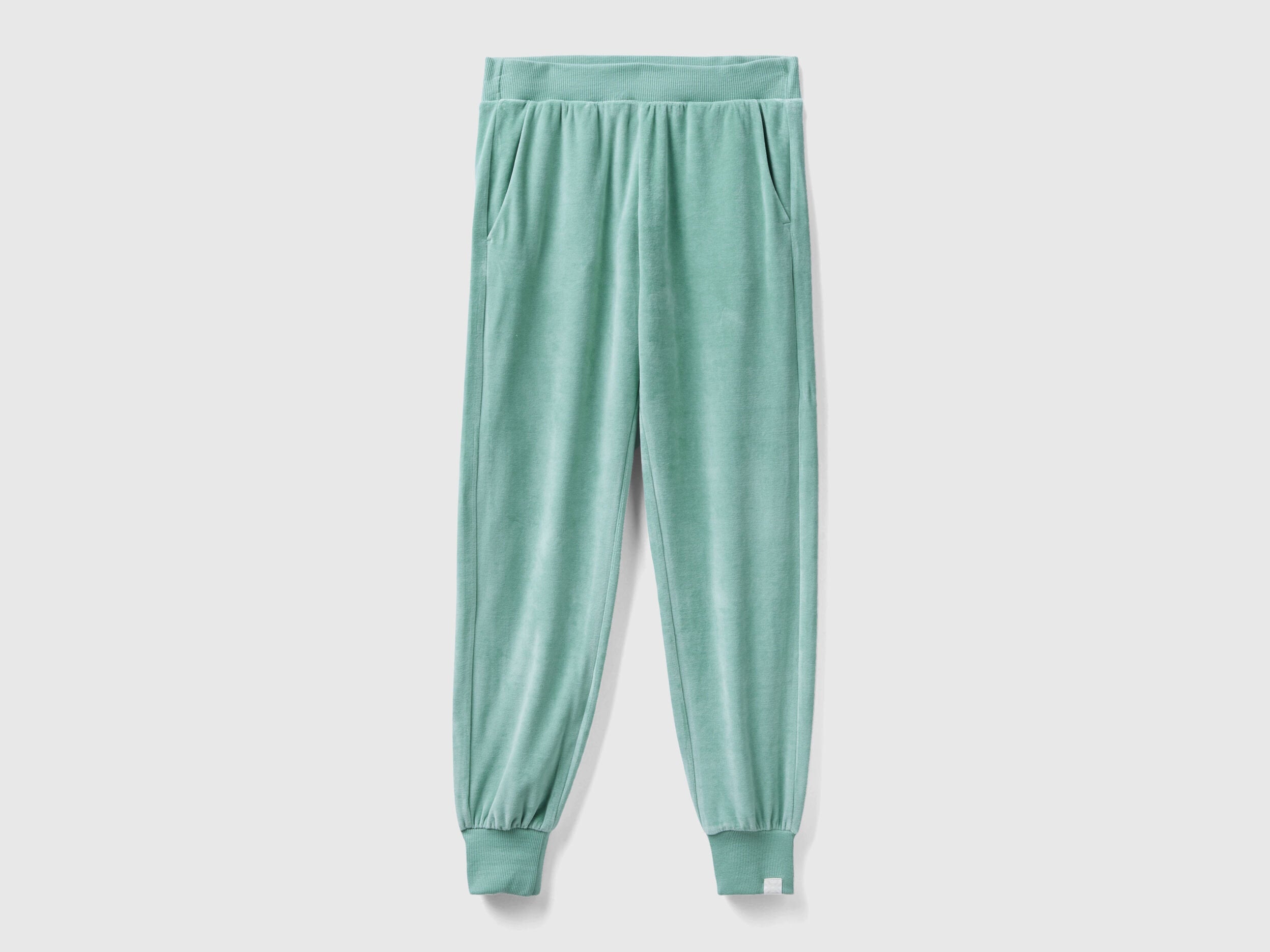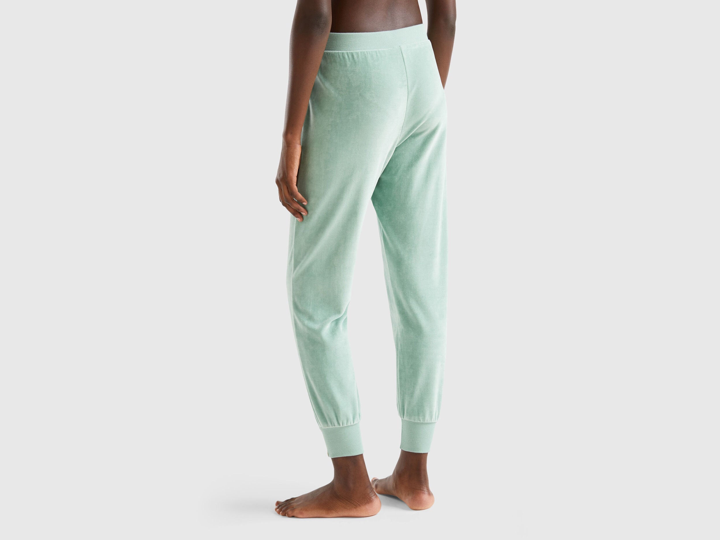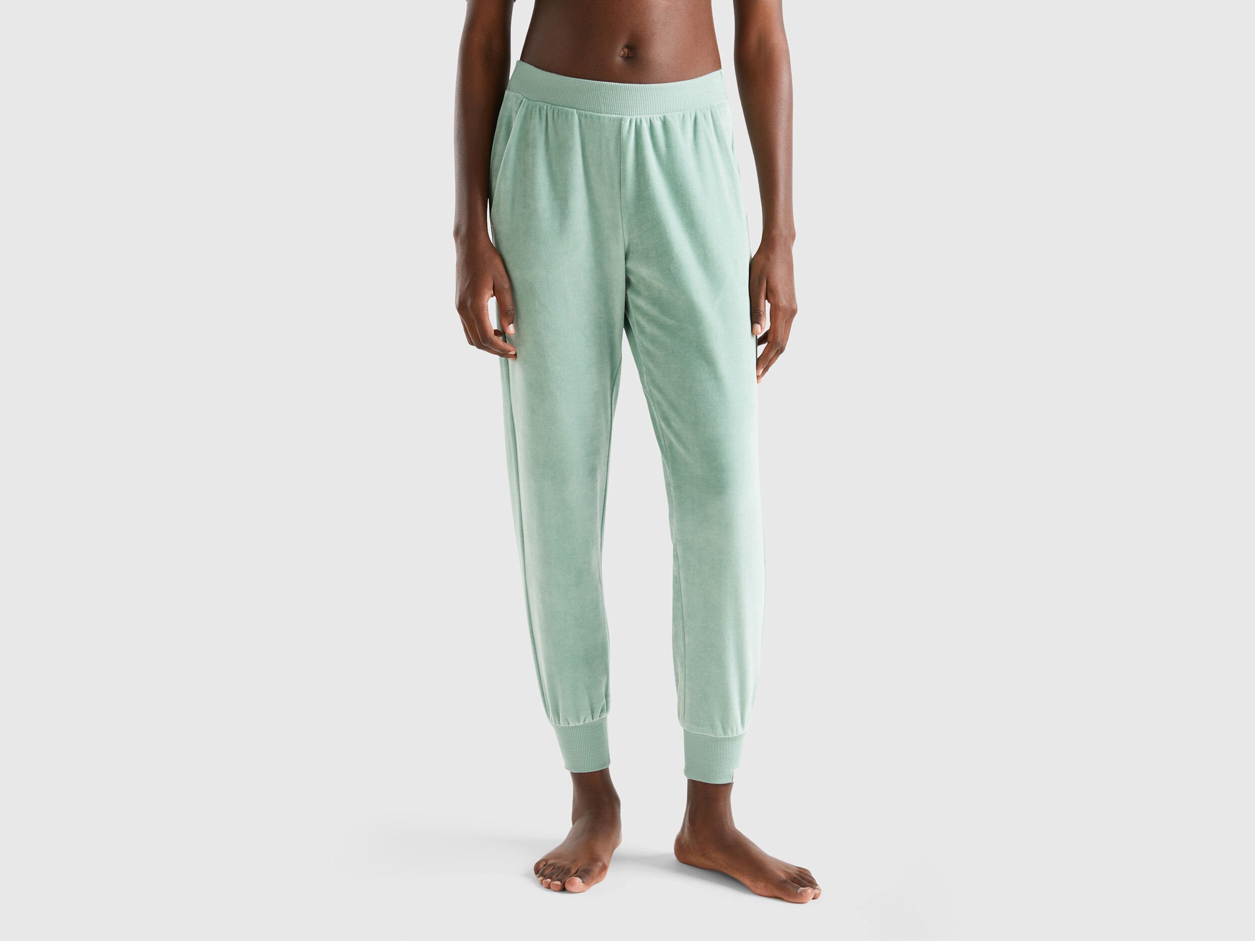 Long trousers in soft cotton blend chenille. Waist with inner elastic, practical front pockets and ankle guards at the bottom.