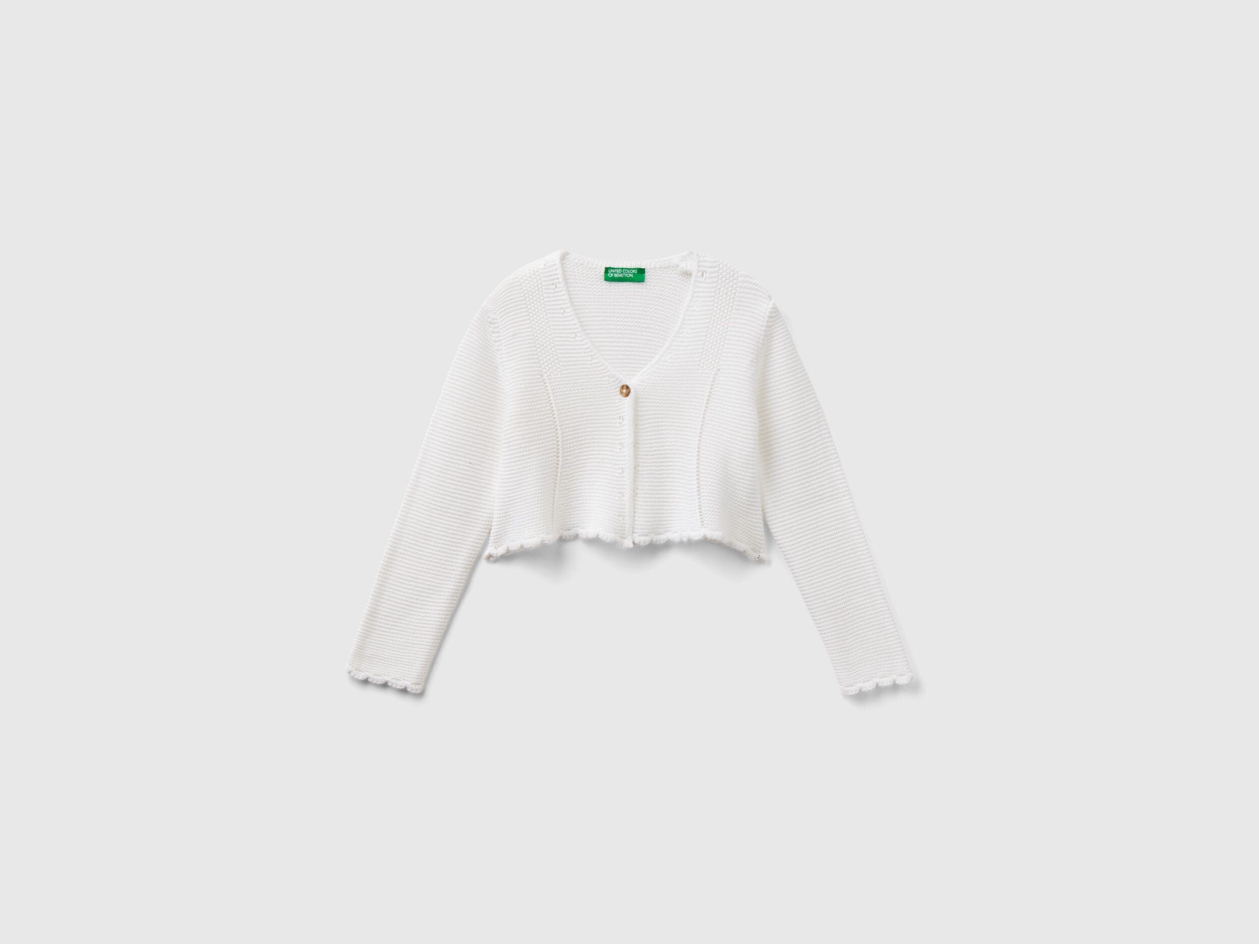 Soft cardigan in a light viscose and linen blend knit. Long sleeves, V-neck, one-button opening, wavy edges. A piece that's perfect for layering, with romantic and feminine vibes.
