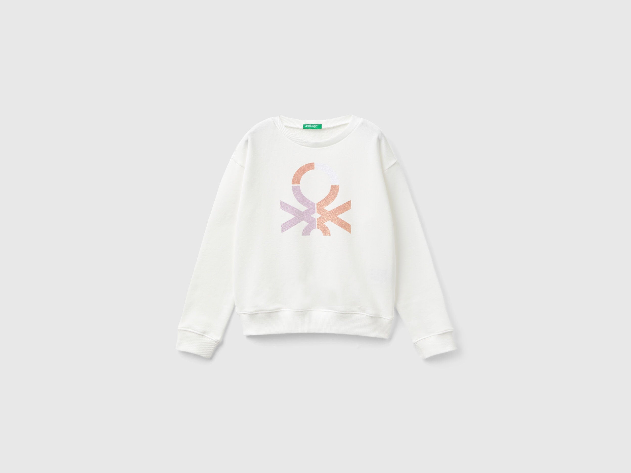 Crew neck long sleeve sweatshirt tracksuit in pure cotton with a firm yet light feel. Relaxed fit, glittery logo print on the front. Contemporary cut with slightly dropped shoulders.