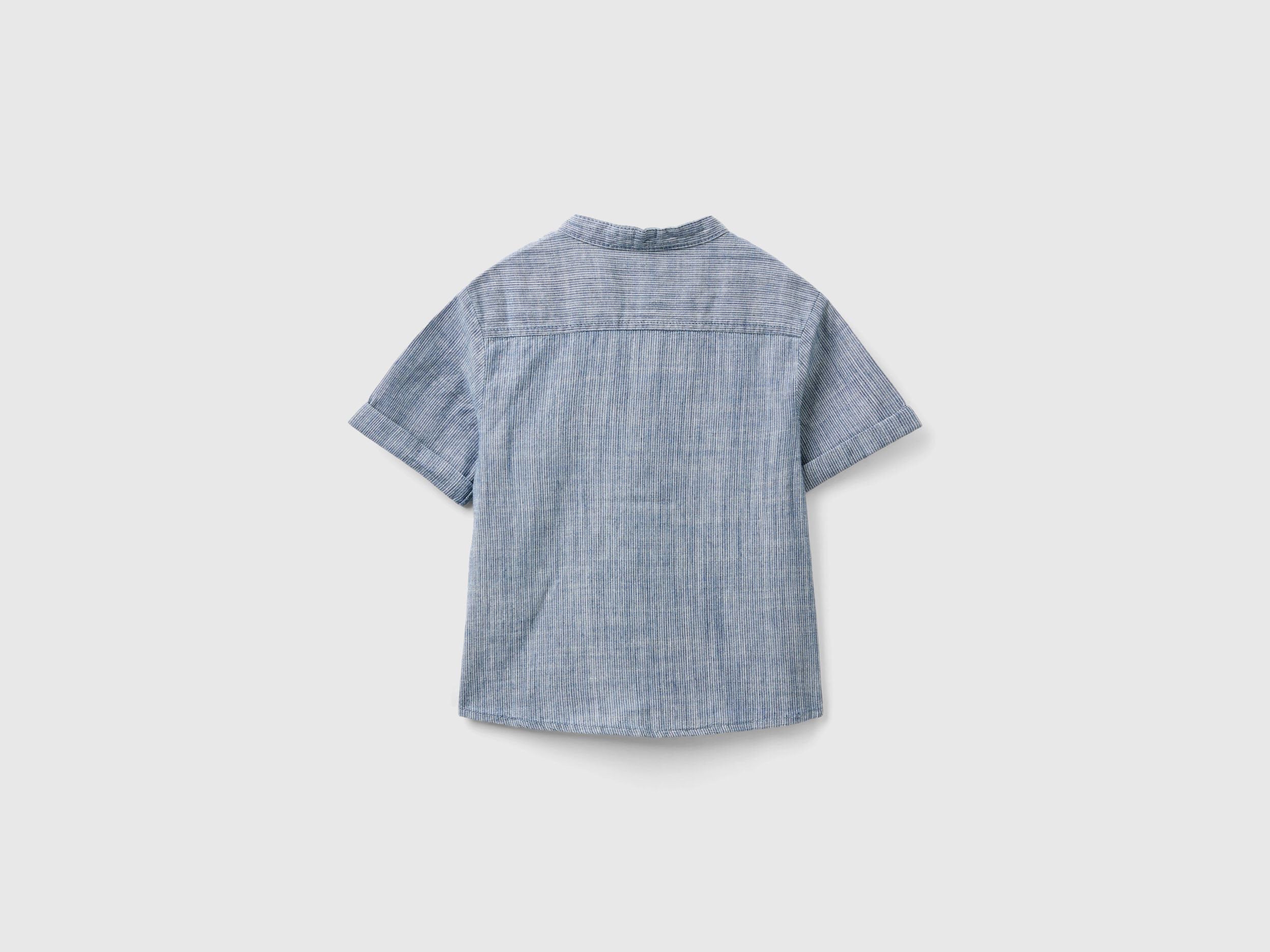 Short sleeve shirt in pure cotton chambray with thin stripes. Mandarin collar, front button opening and patch pocket at left breast. Lightweight and fresh, a must-have for the summer.