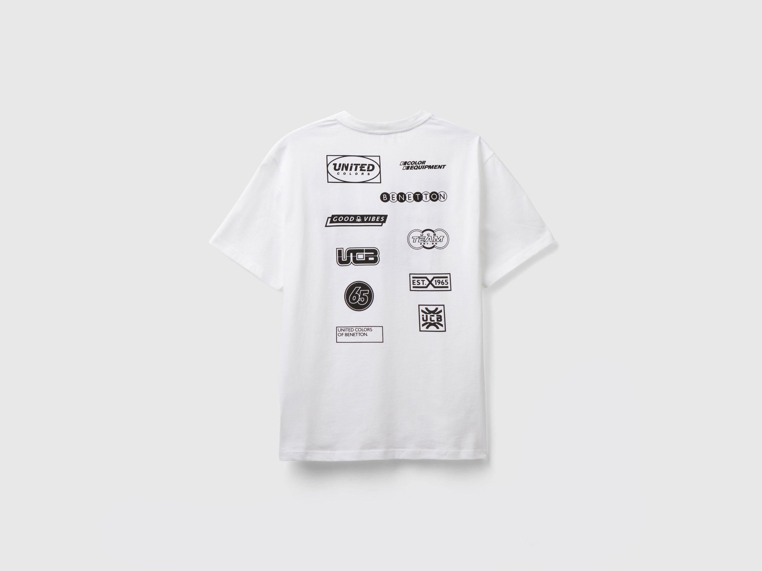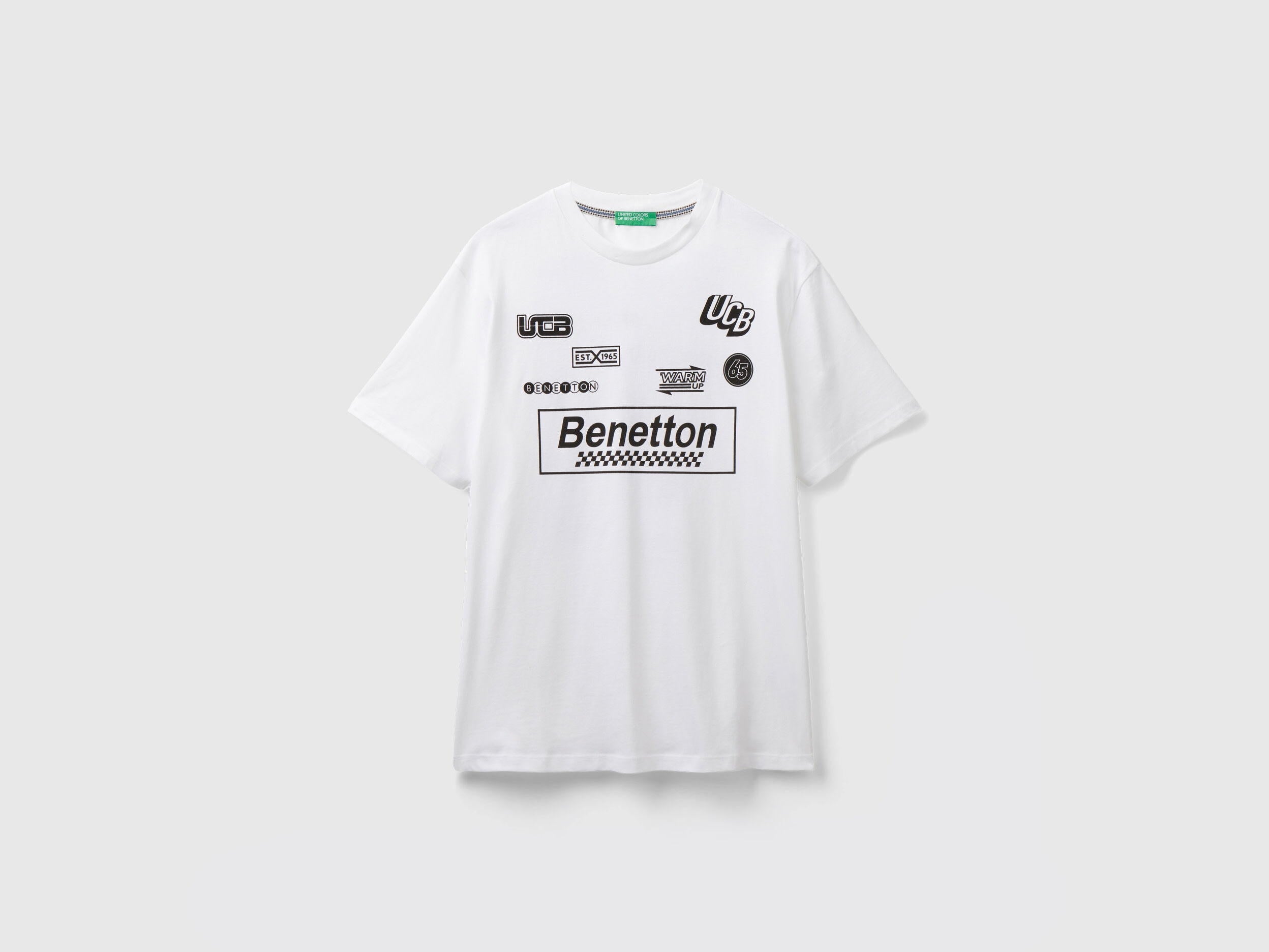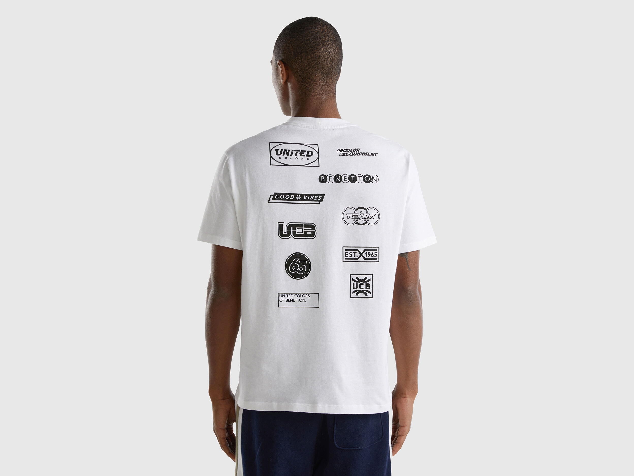 Short sleeve crew neck t-shirt in pure cotton jersey with a relaxed fit. Text prints with logos on the front and back. A vintage touch for a new cult piece of the men's casual wardrobe, in pure Benetton style.