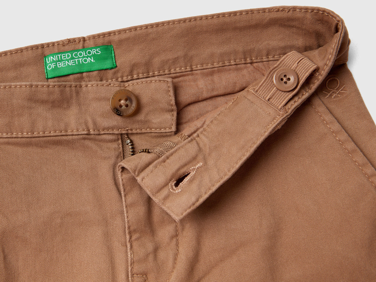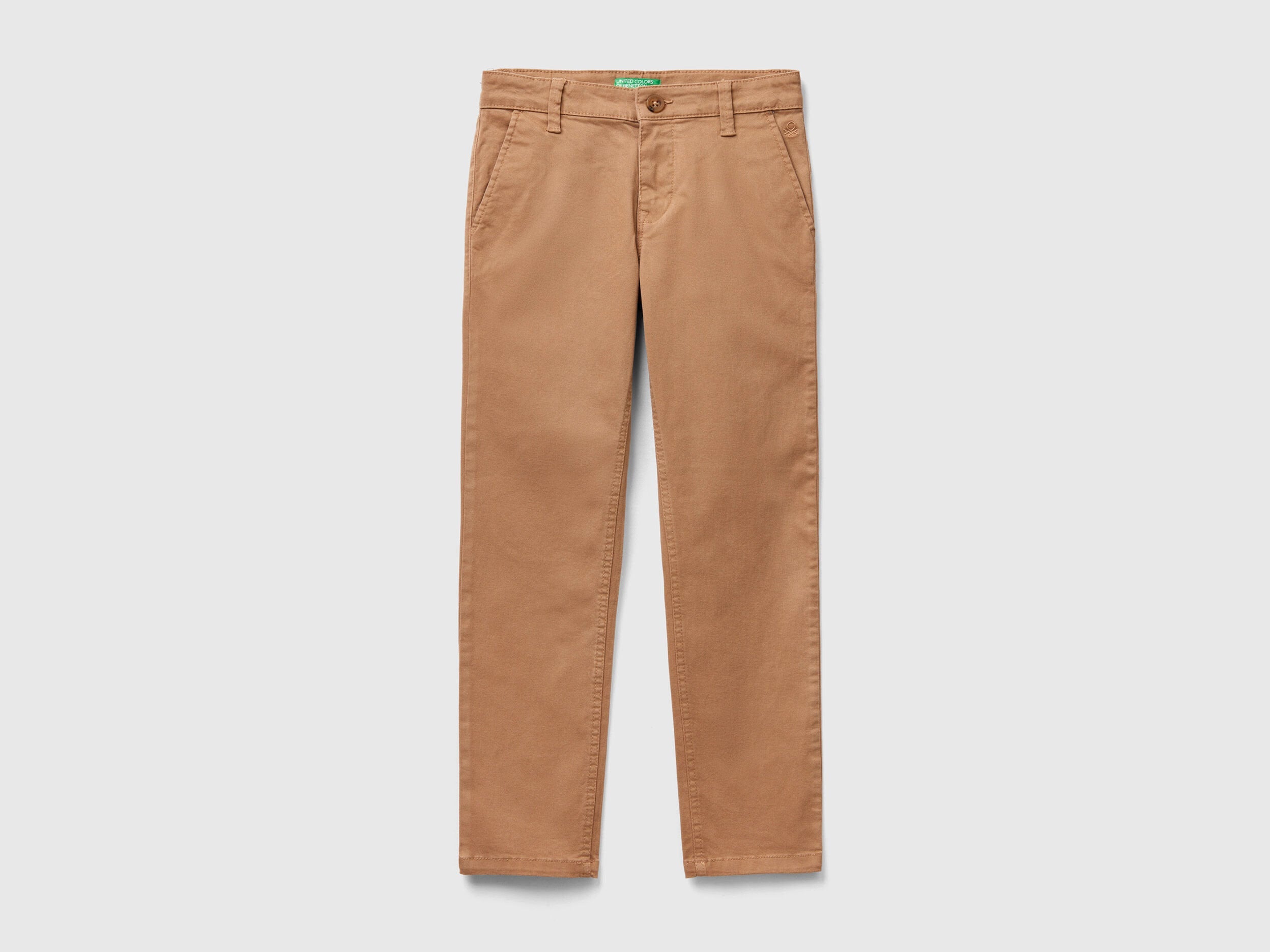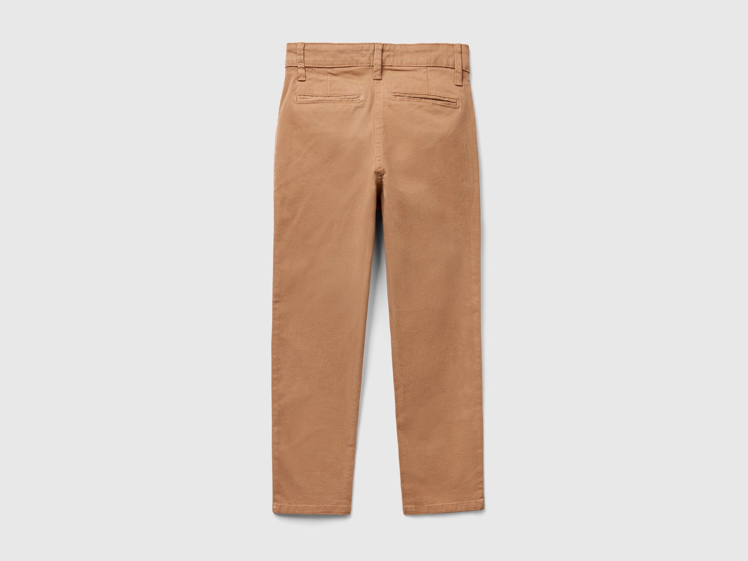 Long chinos in warm stretch cotton. Slim fit with regular waist. Opening with zip and button, front pockets. Welt pockets and small pleats on the back. Embroidered logo near the left pocket. A great alternative to classic denim.