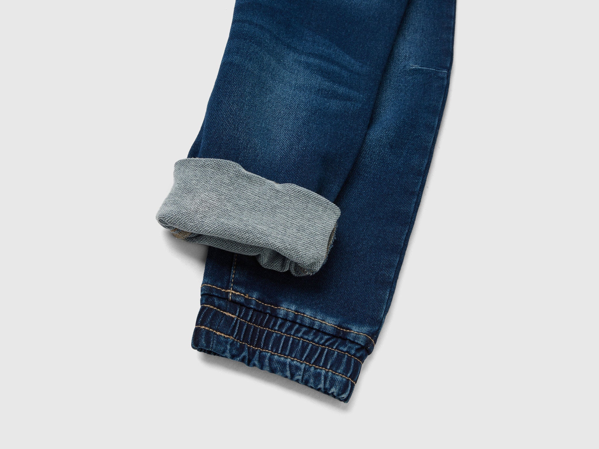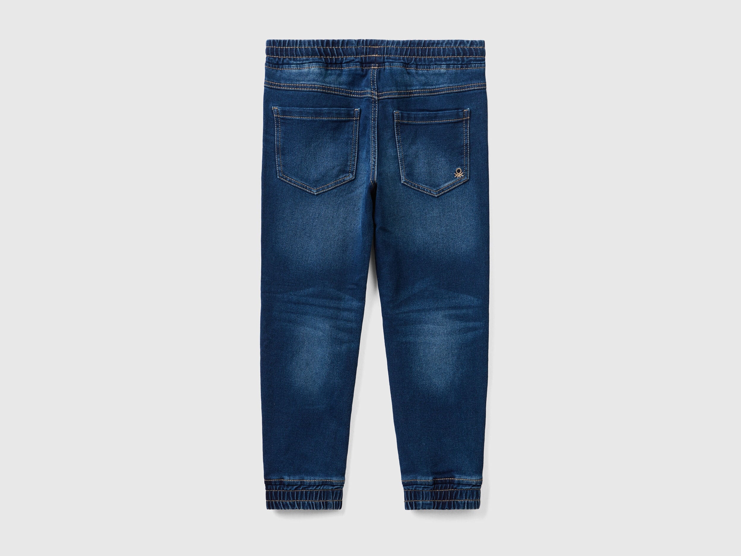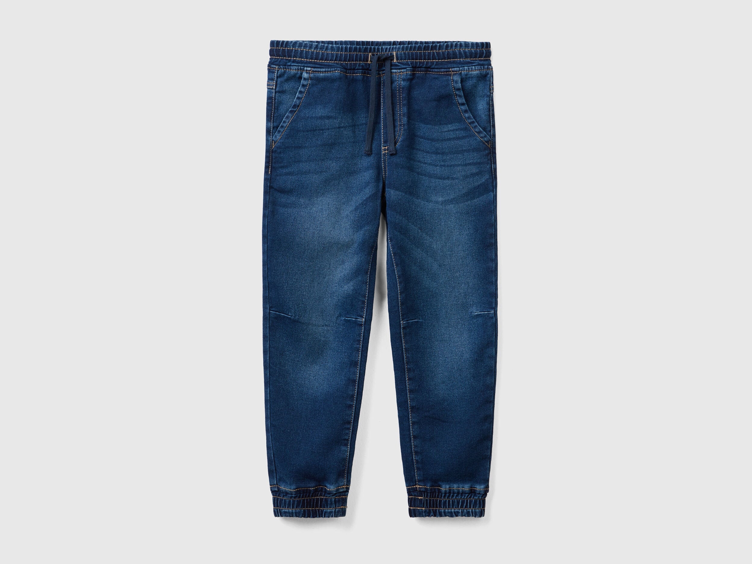 Long trousers in denim look stretch sweat cotton blend. Elastic and drawstring waist, mock flap and front pockets. Back with yoke and patch pocket with embroidered logo. Easy to wear with its inner elastic at waist and leg openings.