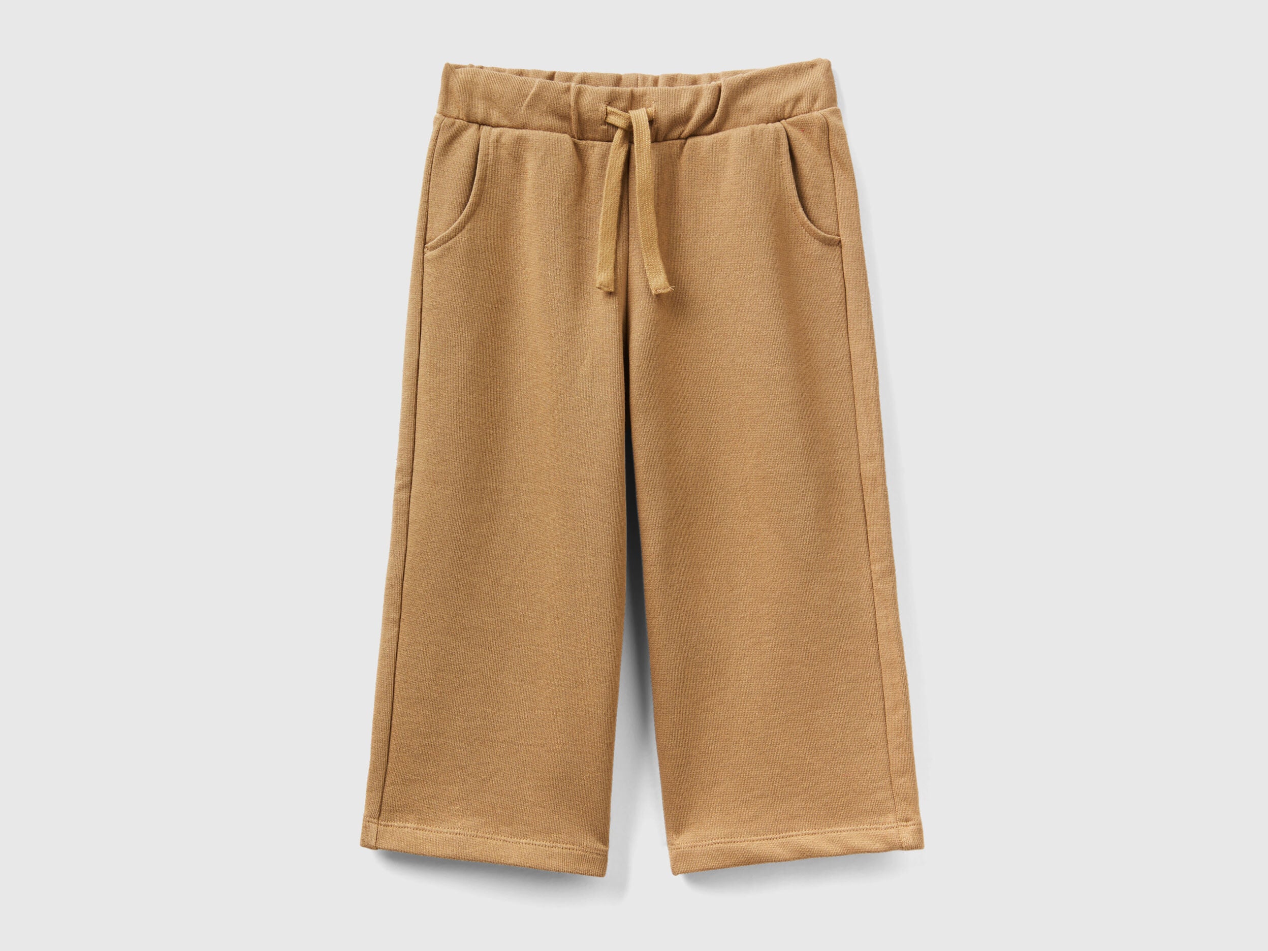 Sweatpants in pure cotton with consistent yet light texture. Palazzo cut with wide and soft slightly cropped leg. Regular waist with elastic, drawstring and front pockets. Comfy and versatile, perfect for school.