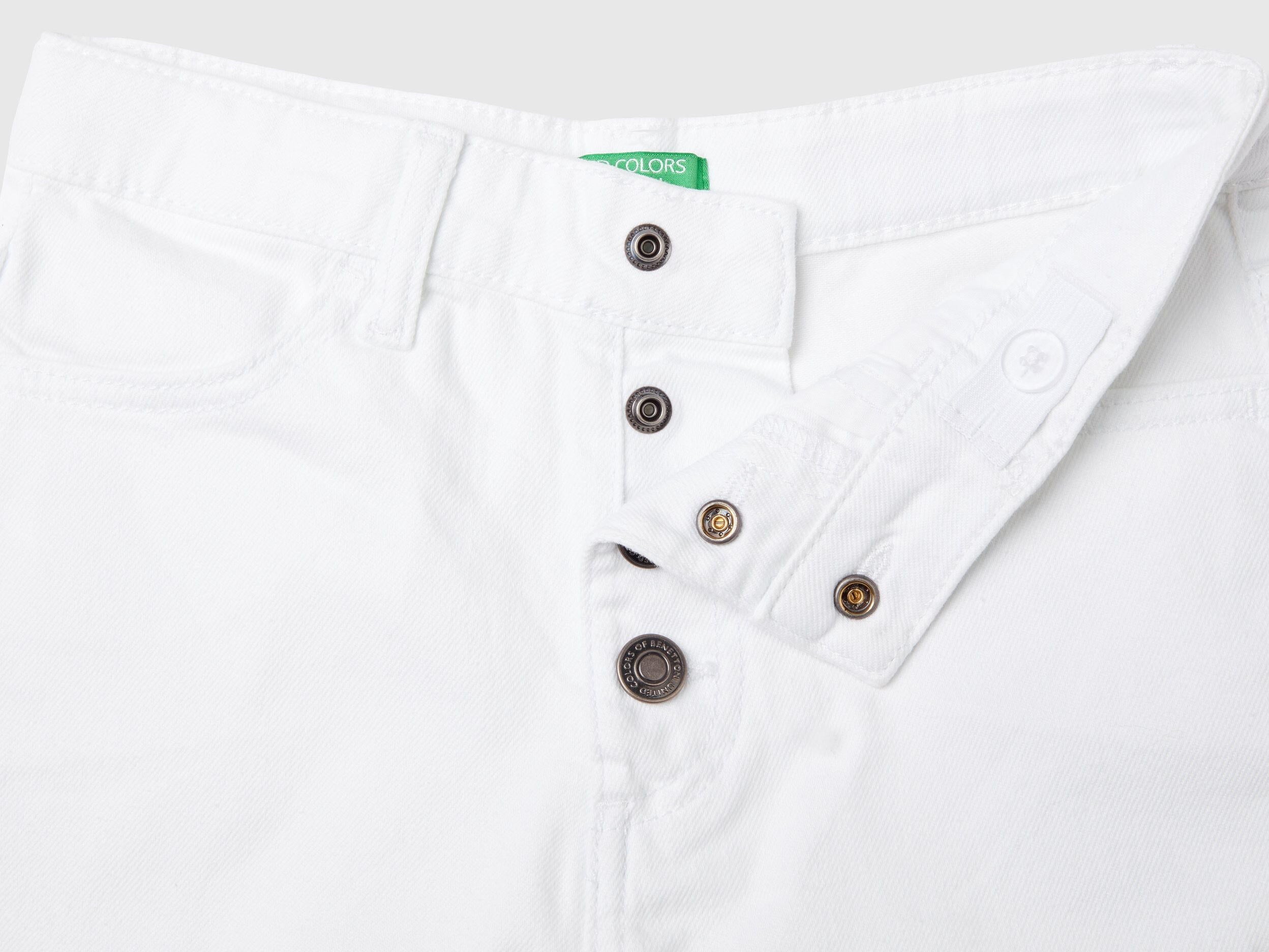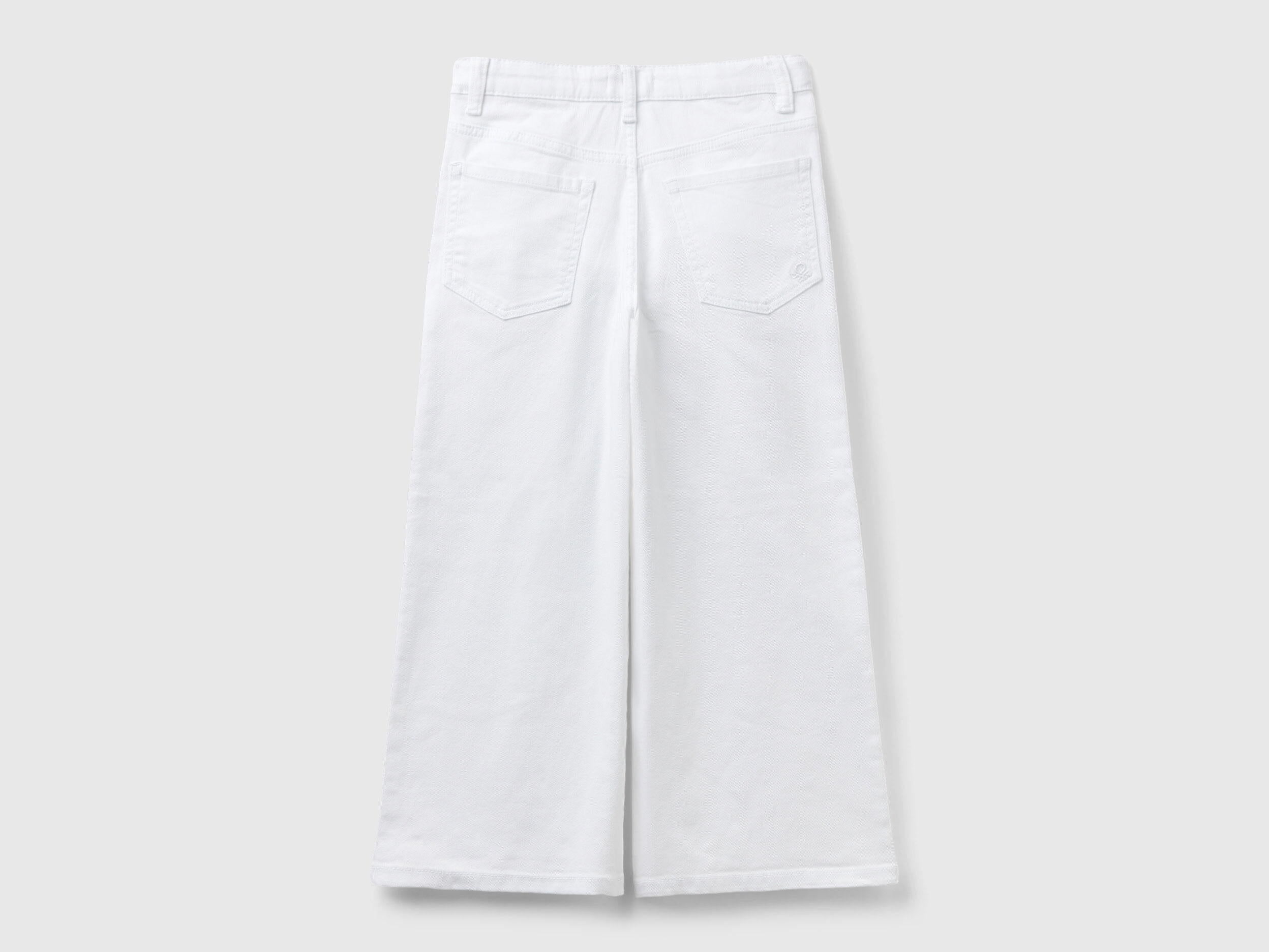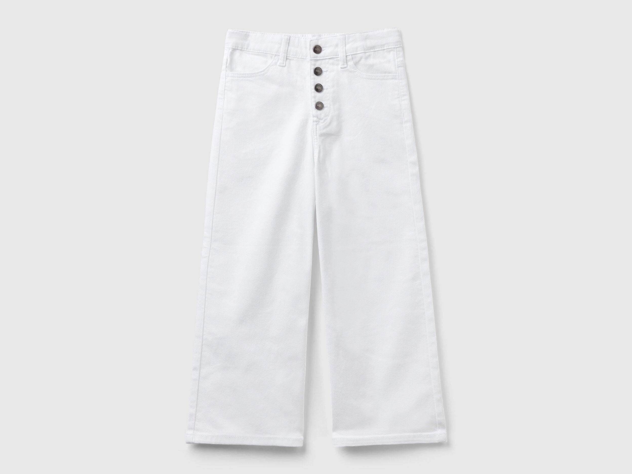 High-waisted four-pocket long trousers in stretch cotton. Wide and soft leg, button opening, adjustable internal elastic waist. Feminine and versatile.