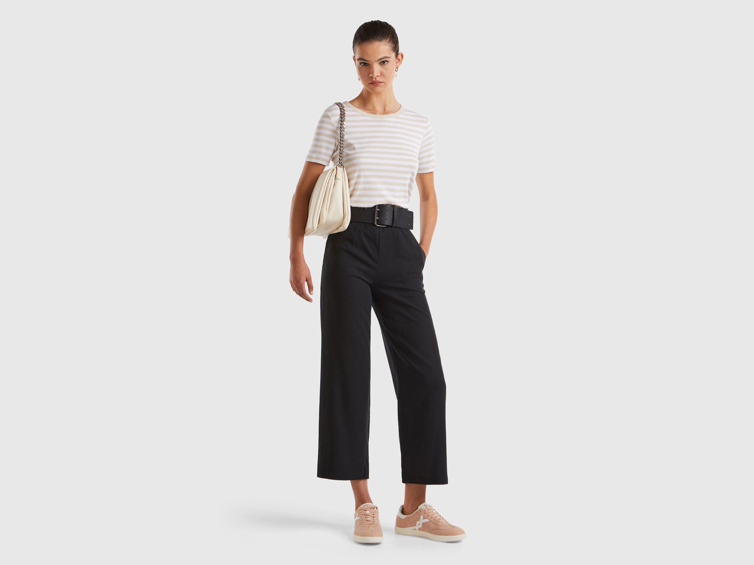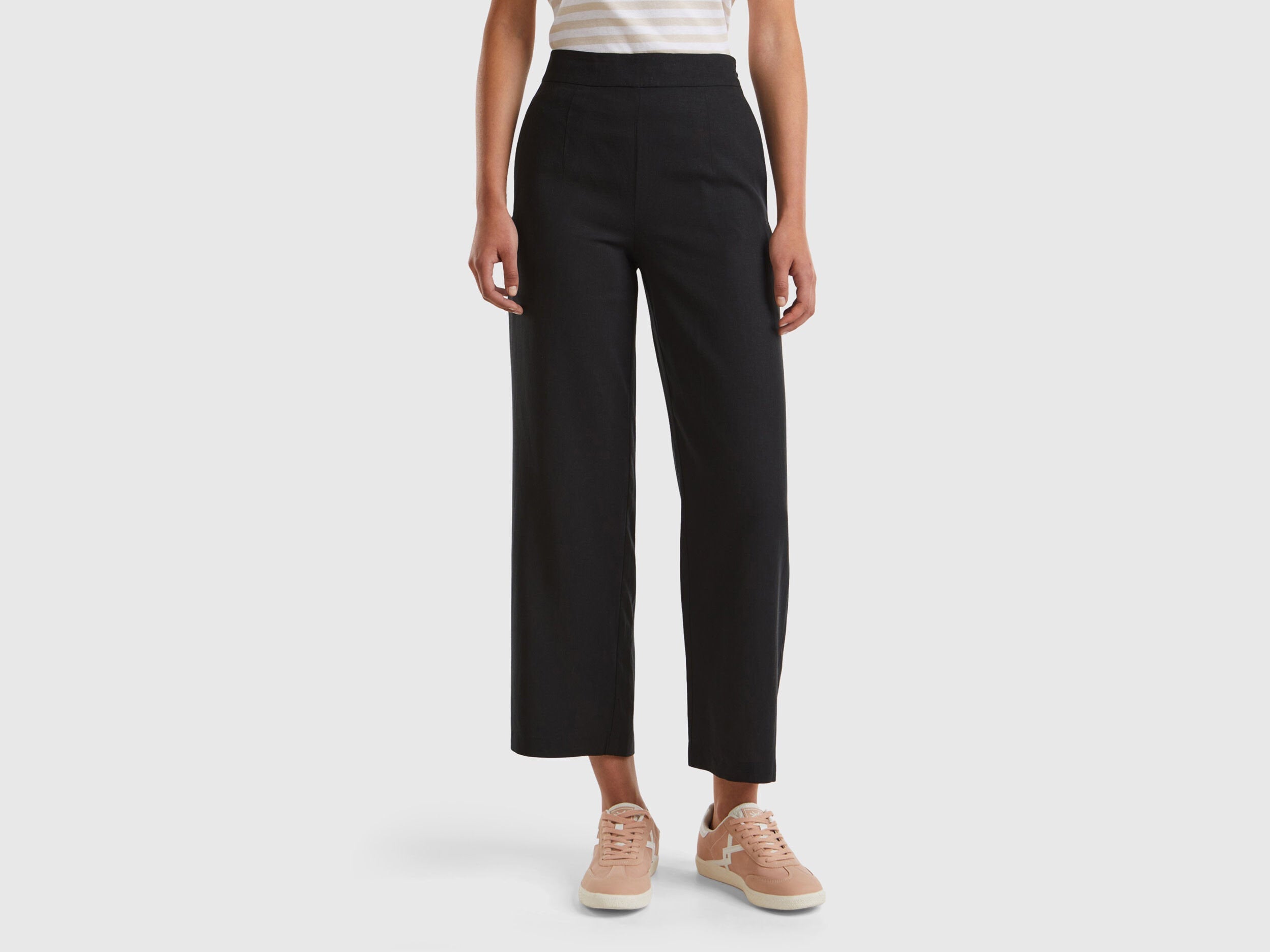 Long trousers with loose leg and pleats. Invisible zip opening on one side and pockets inserted on the sides. Made of linen and lyocell blend, produced using wood from certified forests and respecting the highest environmental standards.