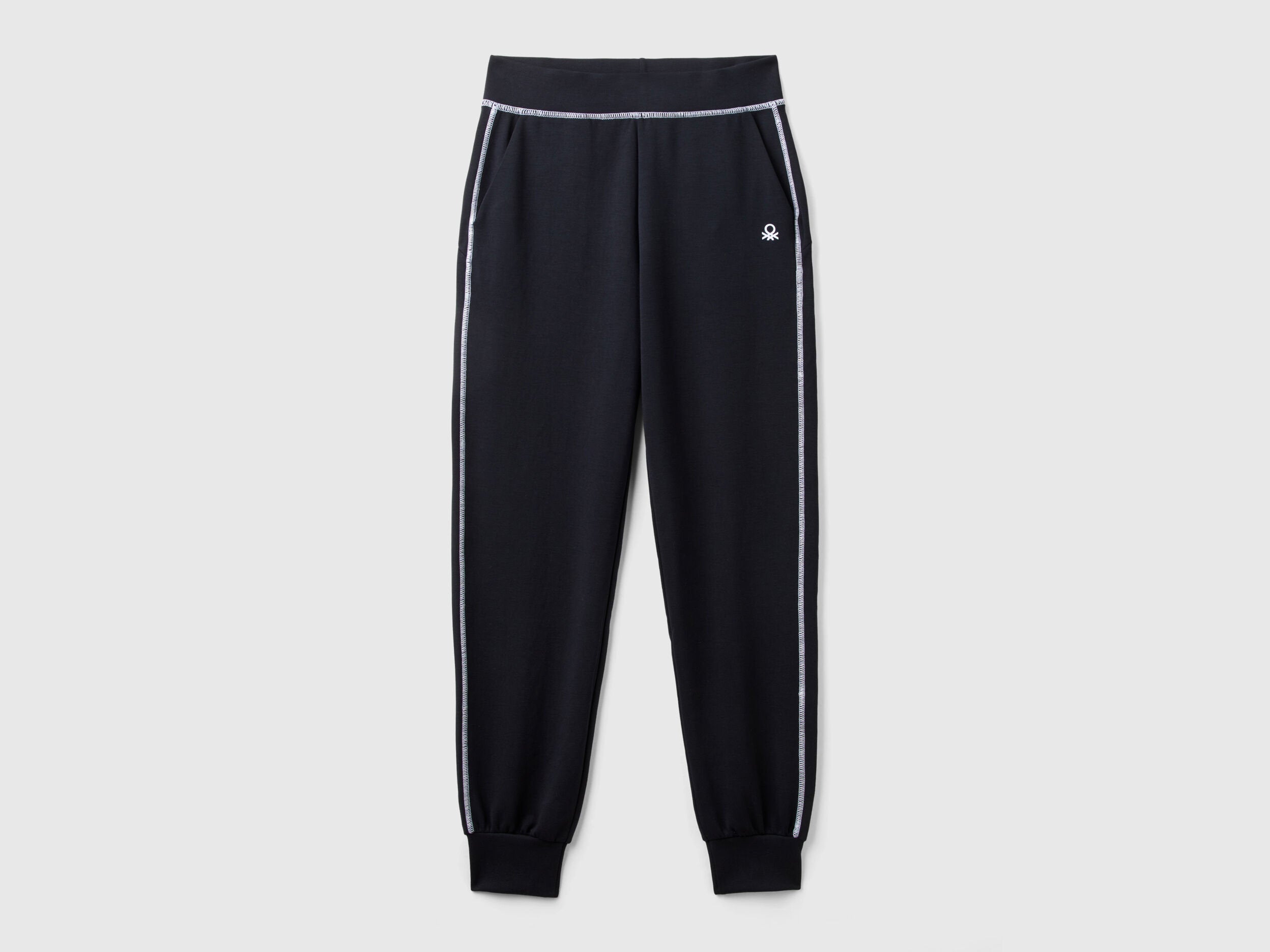 Long trousers in soft stretch viscose blend fabric. Inner elastic and drawstring waist, front pockets and printed logo on front. Relaxed fit and utmost practicality, ideal for sport and free time.