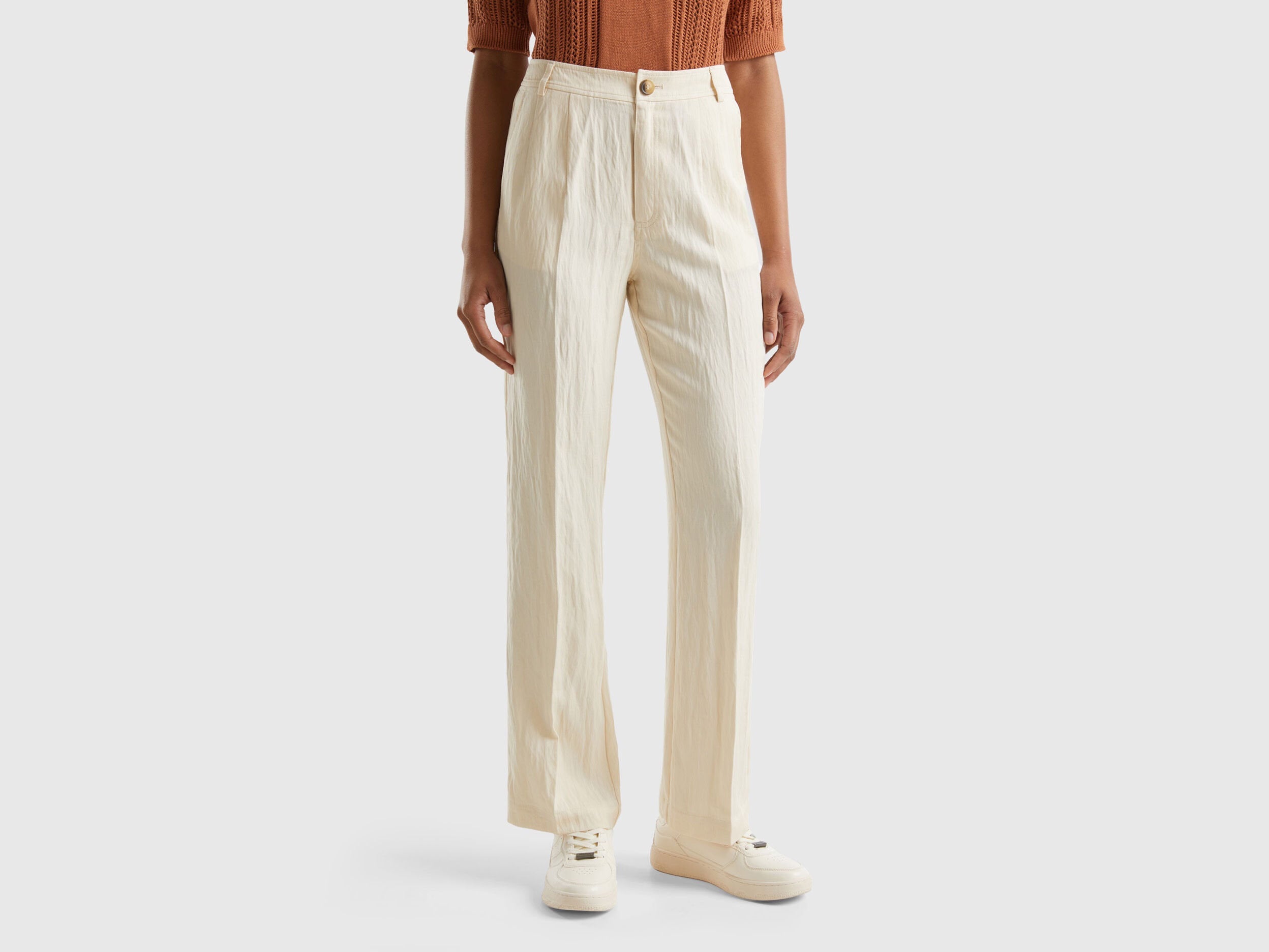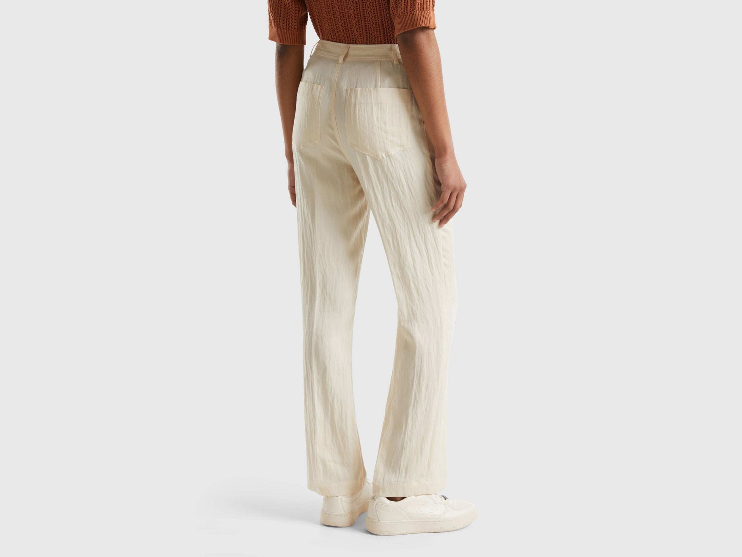 Long high-waisted trousers with zip and button opening. Classic cut with double darts and ironed central crease on the front. Front pockets and patch pockets on the back. Made from a sustainable lyocell and viscose blend, produced using wood from certified forests and respecting the highest environmental standards.