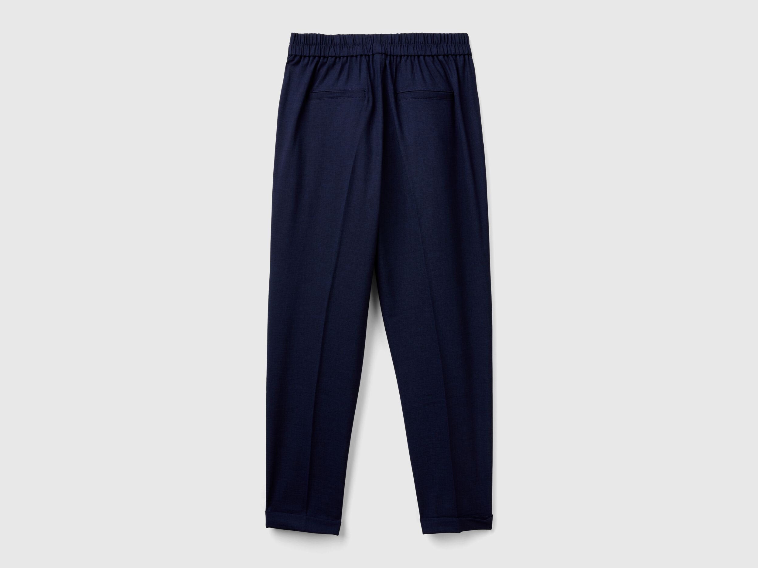 Long trousers in stretch viscose blend with relaxed leg and ironed central crease. Waist with inner elastic at back and on sides, front pockets and welt pockets at back. Fixed cuffed at leg bottoms. A casual garment suitable for both the office and leisure time.