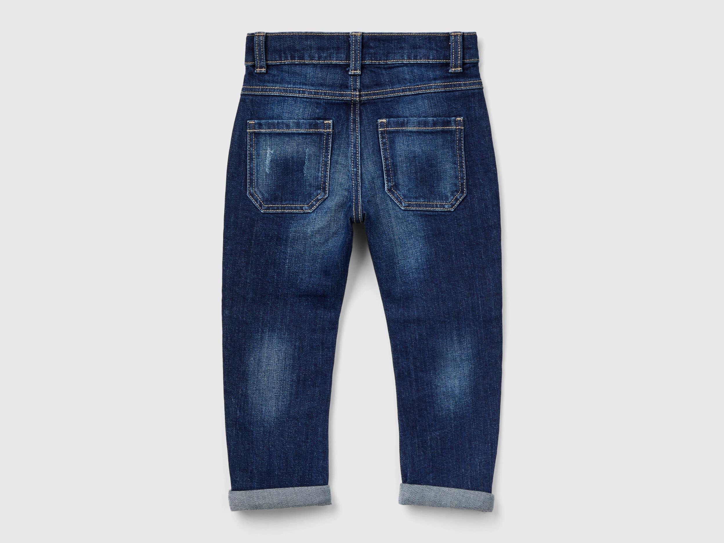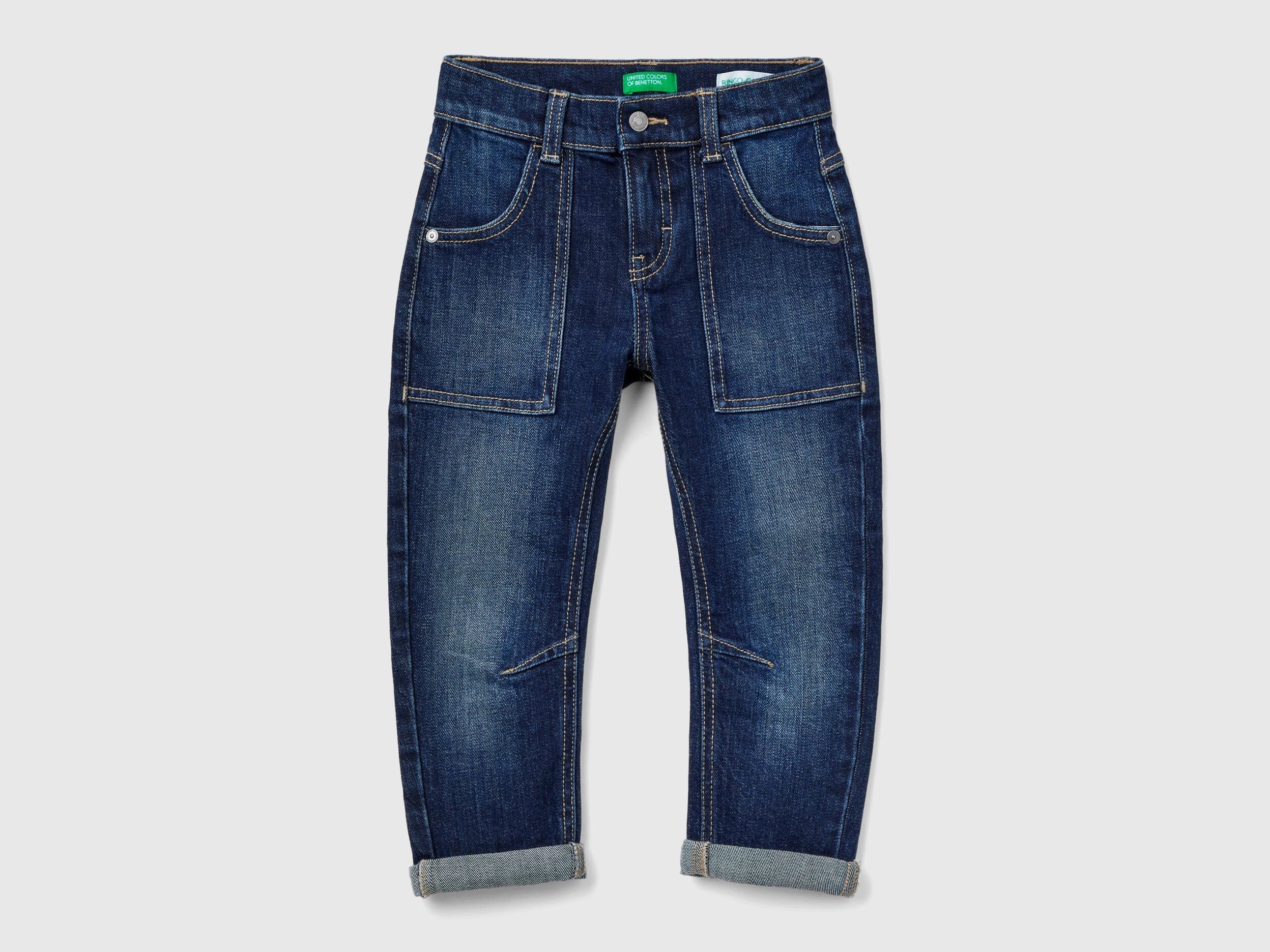 Long trousers in stretch worn look cotton denim. Convenient zip and button opening, adjustable inner elastic waist, wide workwear style pockets at front and back. Pleats at knee and permanent roll-up at bottom. For cool and contemporary combos.
