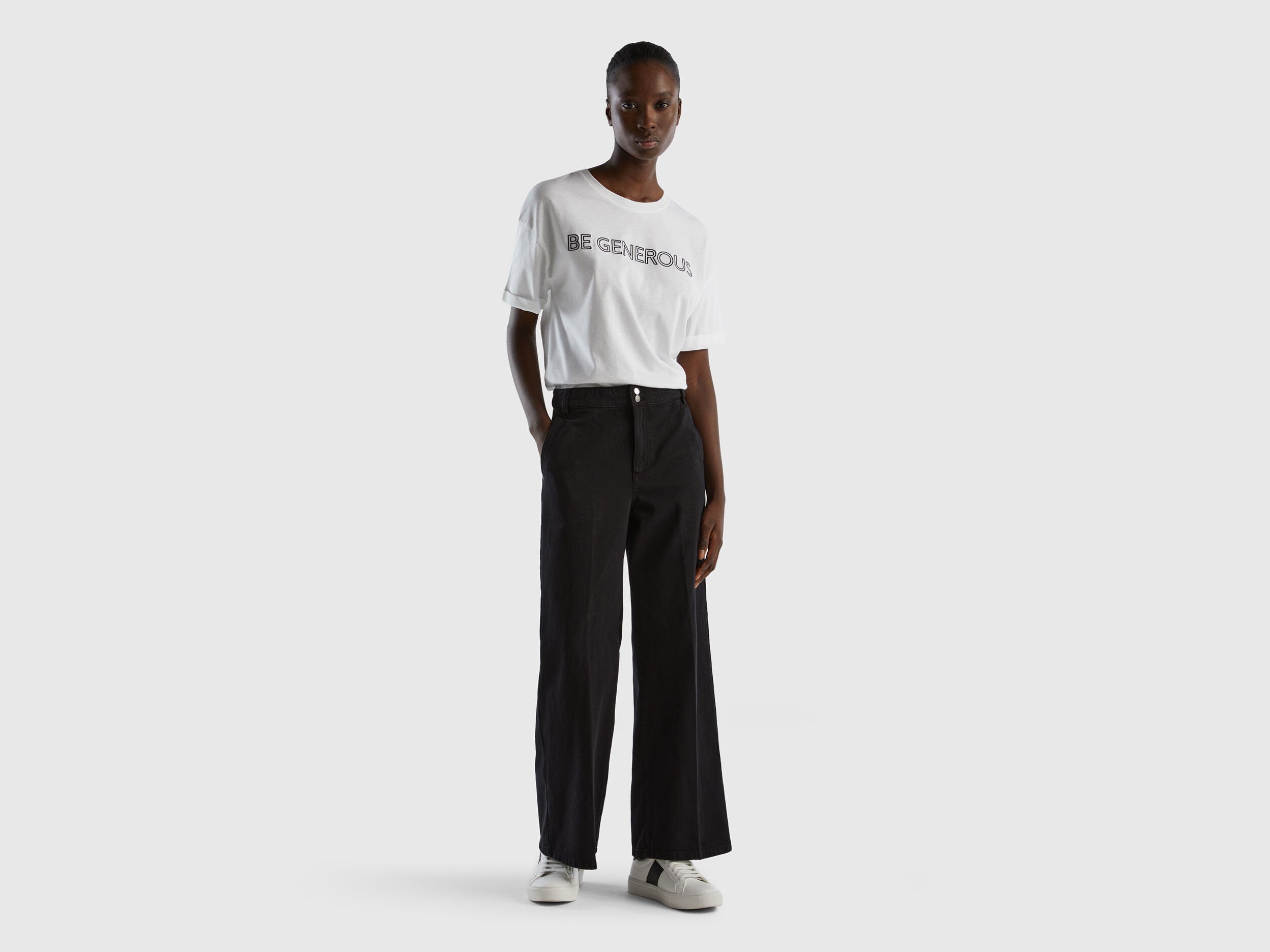 Long trousers in garment dyed pure cotton with wide legs. High waist with inner elastic on the back, zip and double button opening. Pockets inserted at the sides and small pockets on the back. Loose fit: we suggest going down one size from your usual one.