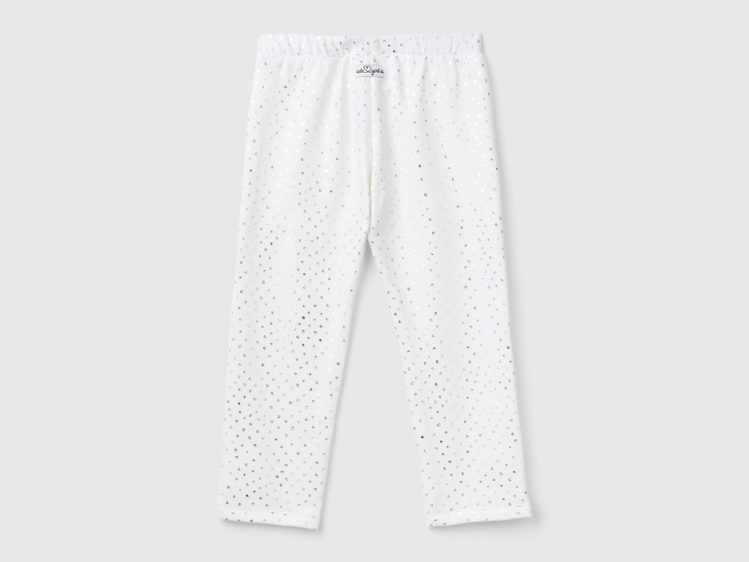 Leggings in stretch cotton blend. Waist with inner elastic and glossy print along the entire garment. Vibrant and super comfy.