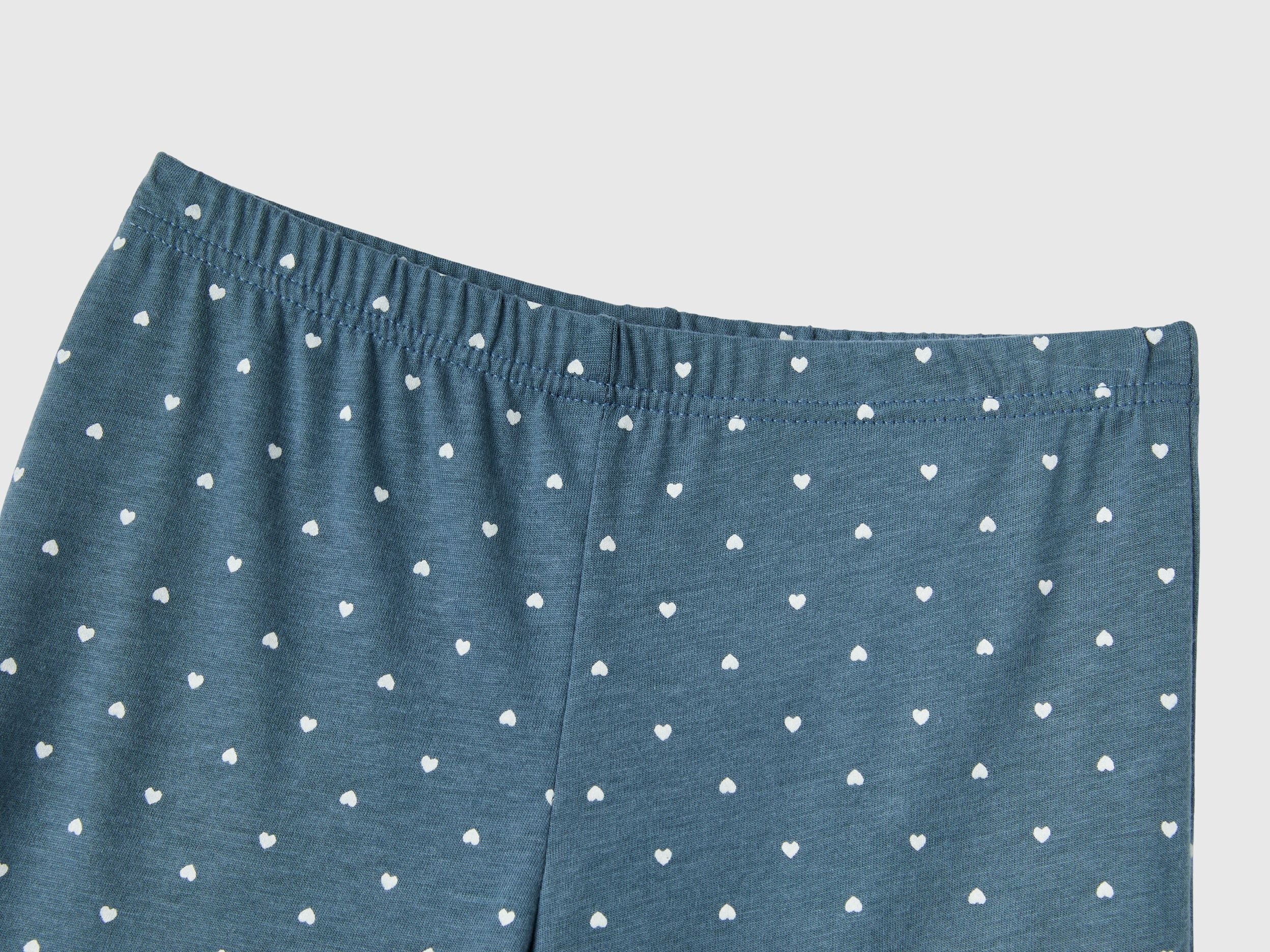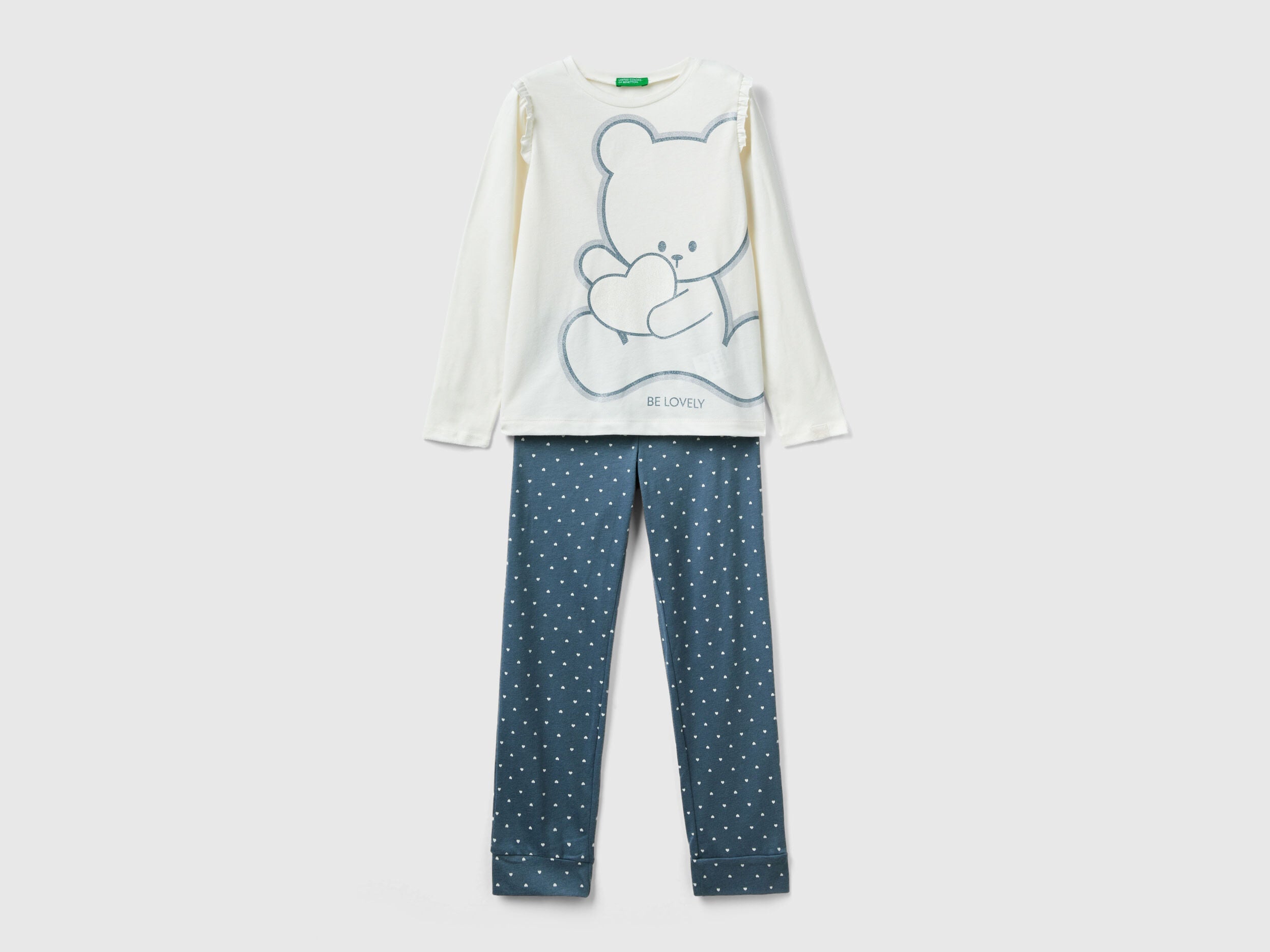 Pyjamas in warm cotton and viscose blend. Long sleeve crew neck top with rouches applied on the shoulder. Maxi glitter flower print on the front. Long bottoms with floral print allover the garment.