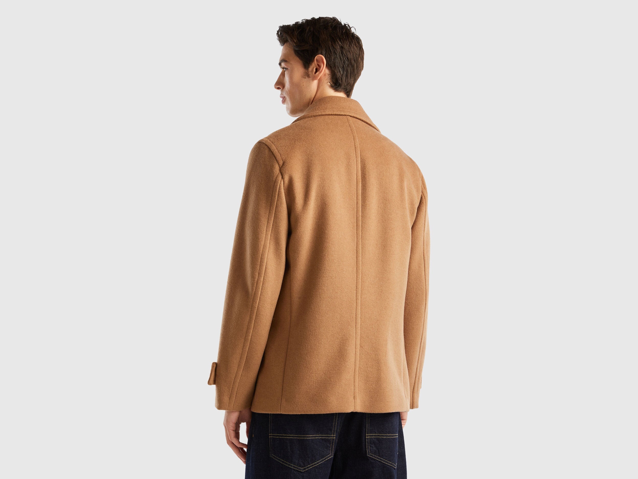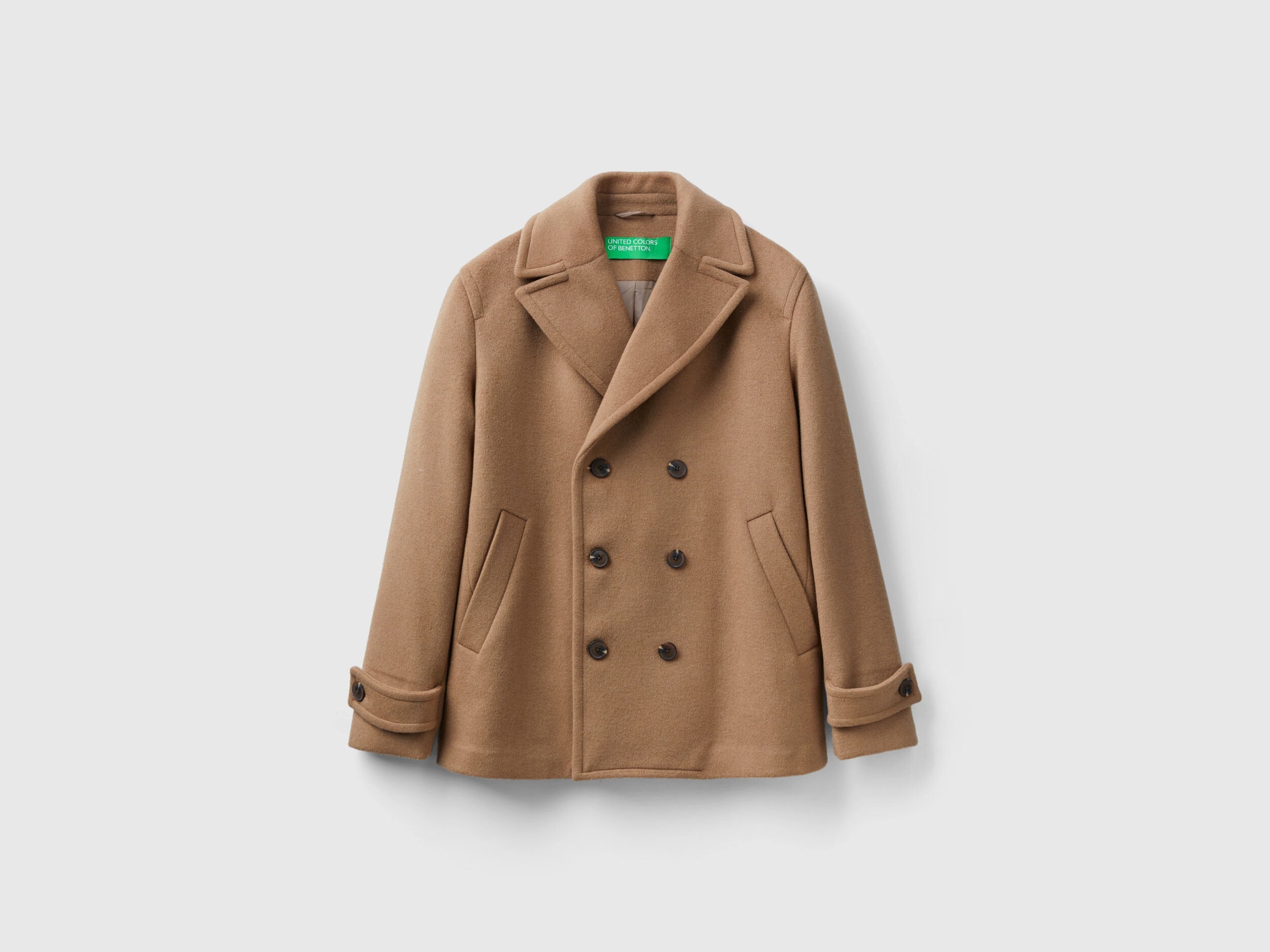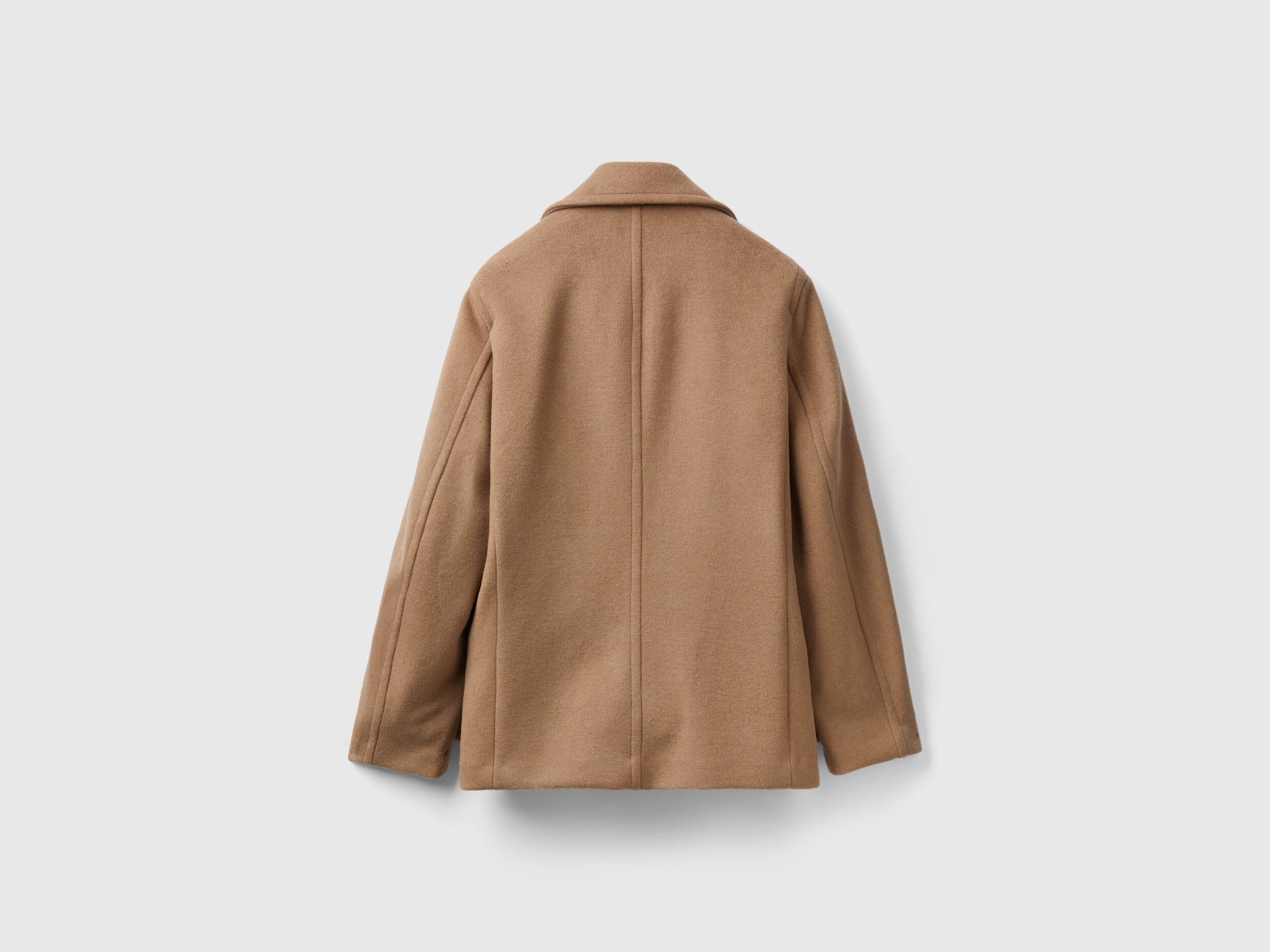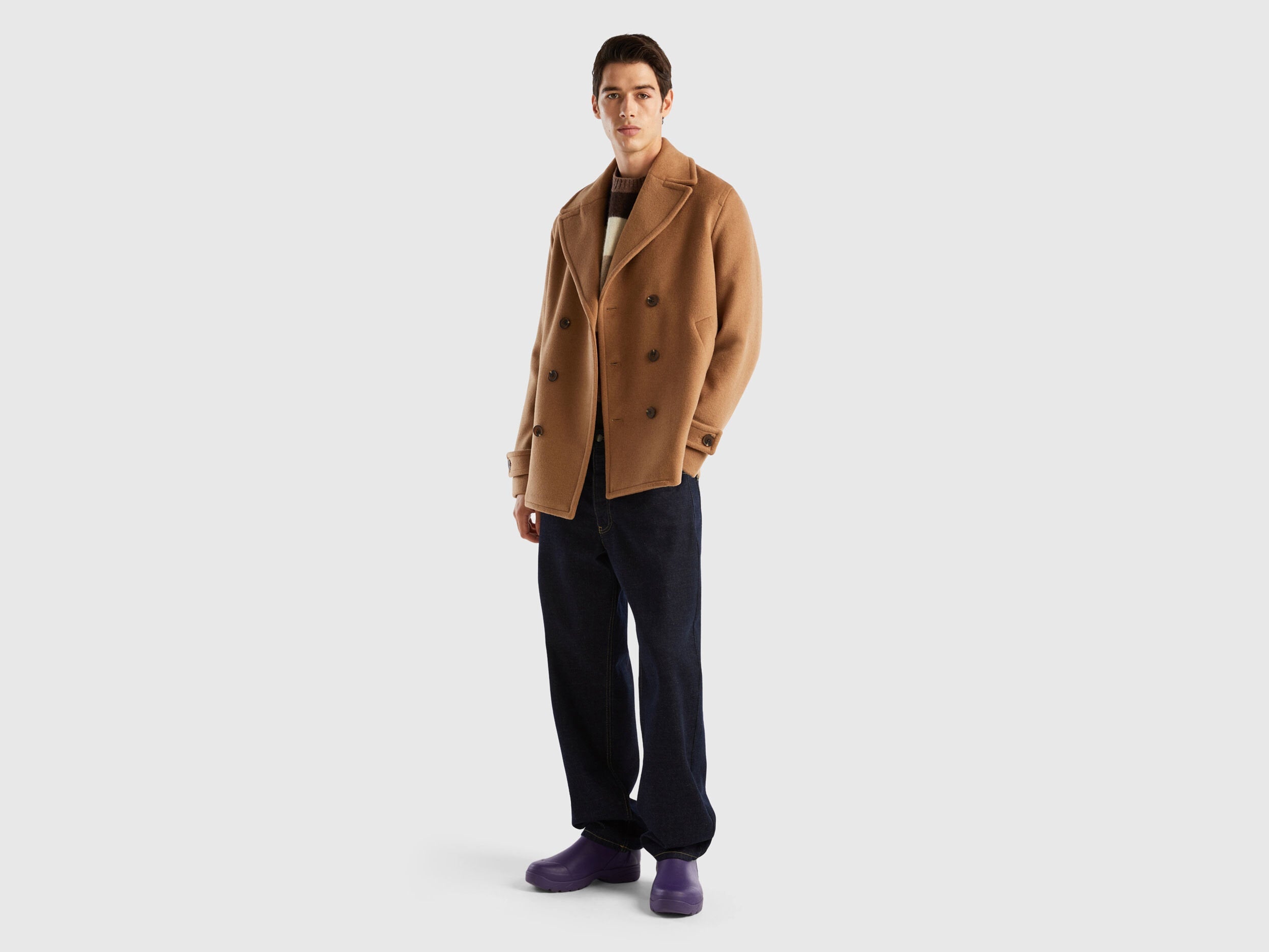 Double-breasted jacket in warm Sheltand wool and lyocell blend thread. Wide lapel collar, button opening and front pockets. Soft and relaxed fit, for an ultra comfortable garment.