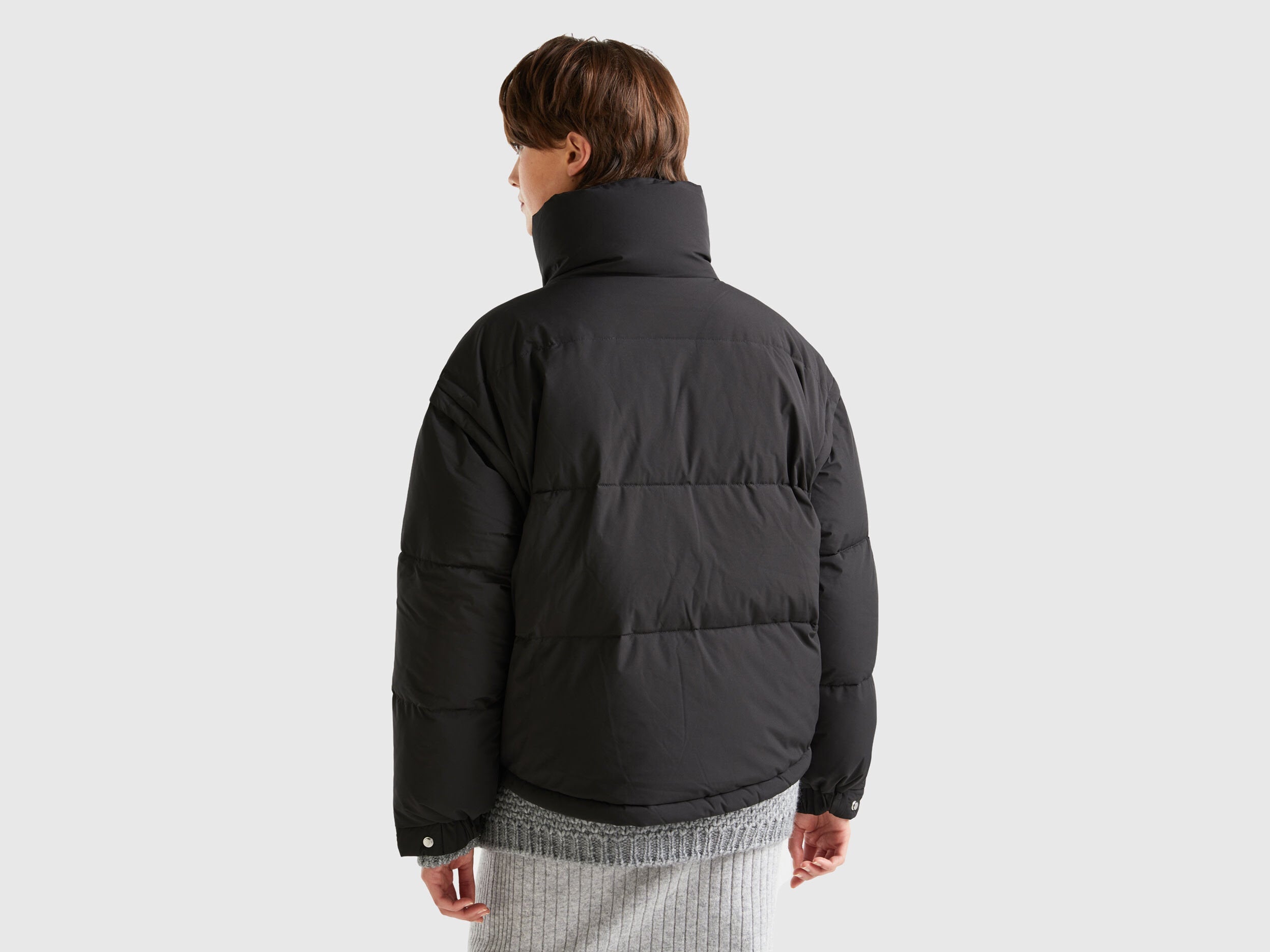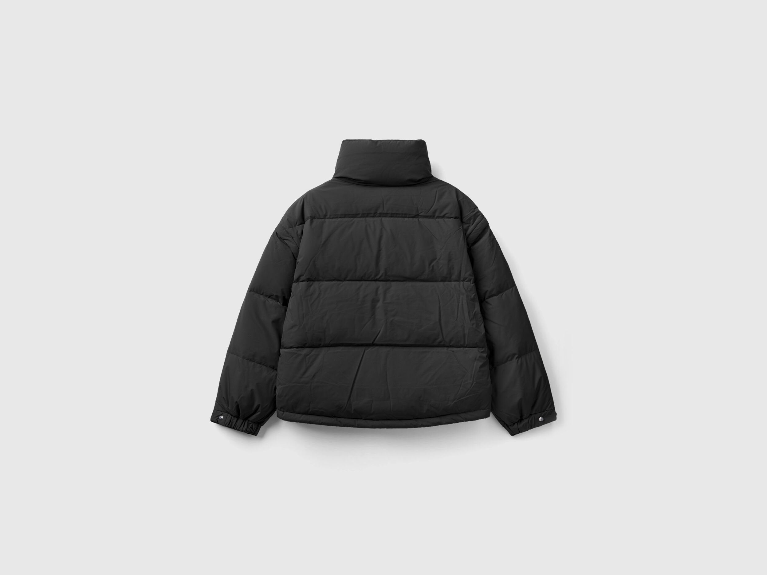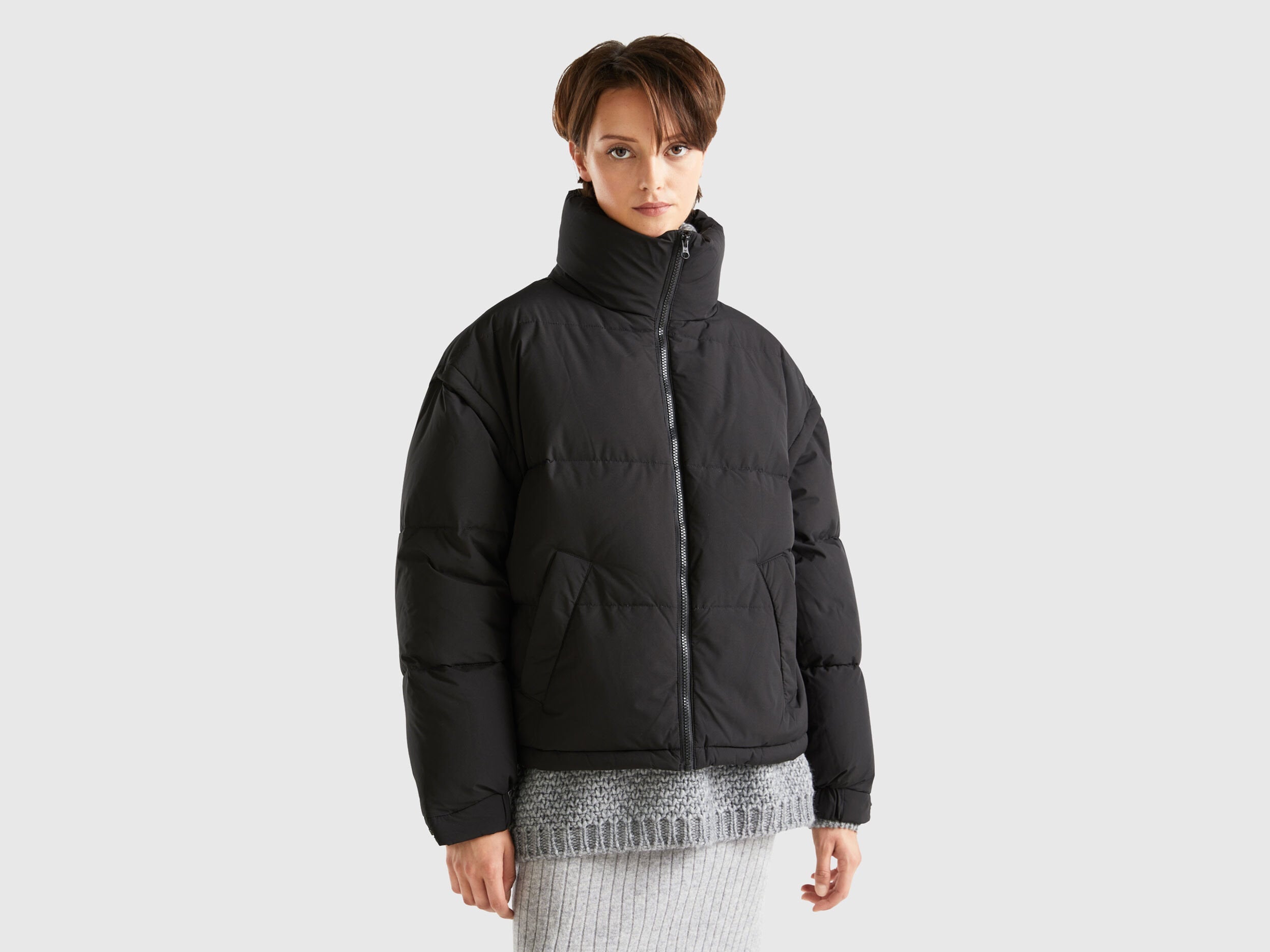 Short padded jacket in technical "Rain Defender" fabric, with duvet padding and genuine recycled down. Warm and cozy with high neck and closure with zip up to the chin. Hits at the waist, bottom with inner elastic drawstring and front pockets. Removable sleeves with visible zipper, to transform the piece into a maxi vest.