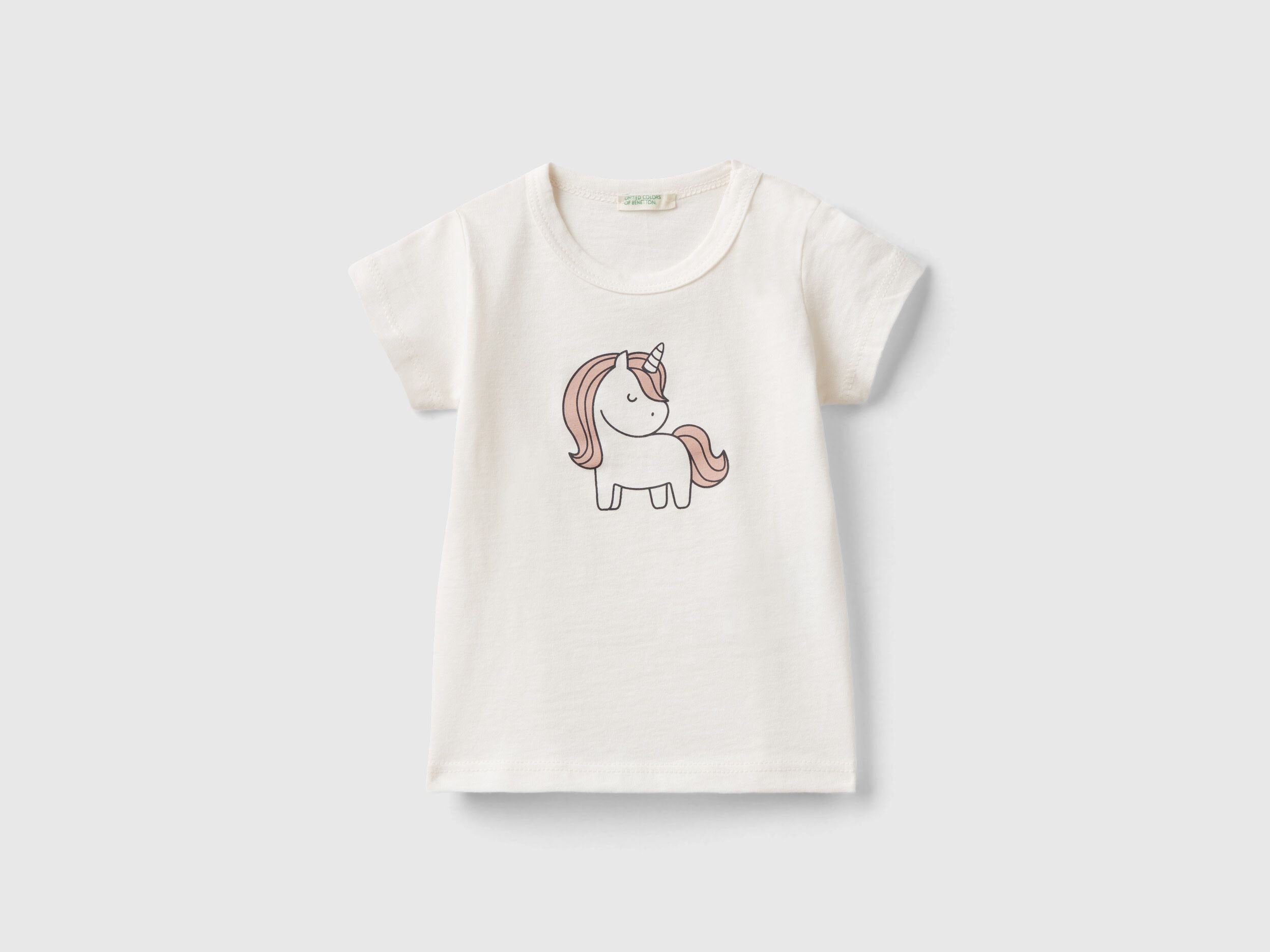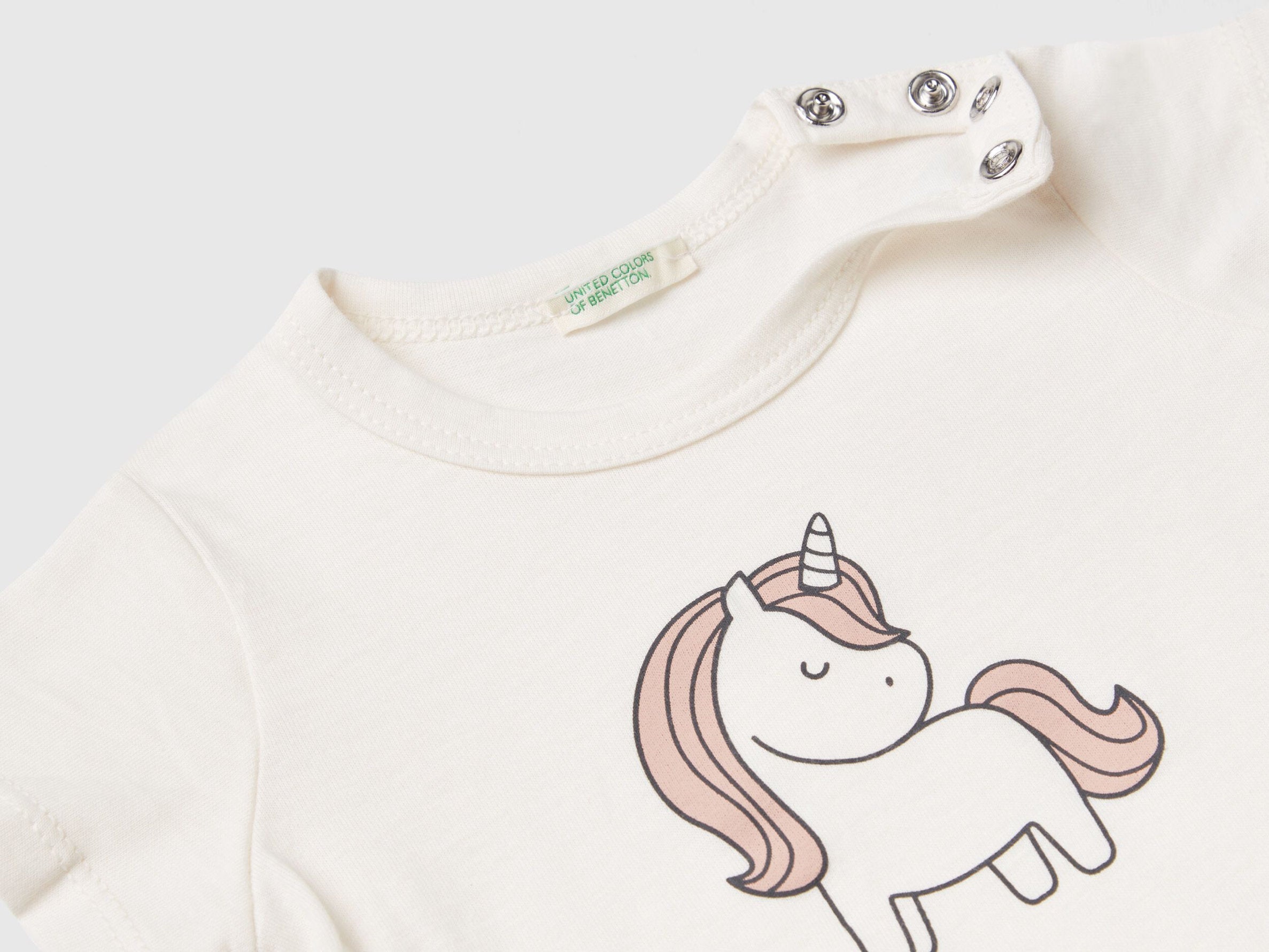 Crew neck short sleeve t-shirt in pure organic cotton. Cute unicorn print at breast, hidden opening with snap buttons on the left shoulder. Cute, soft and pleasant to wear.