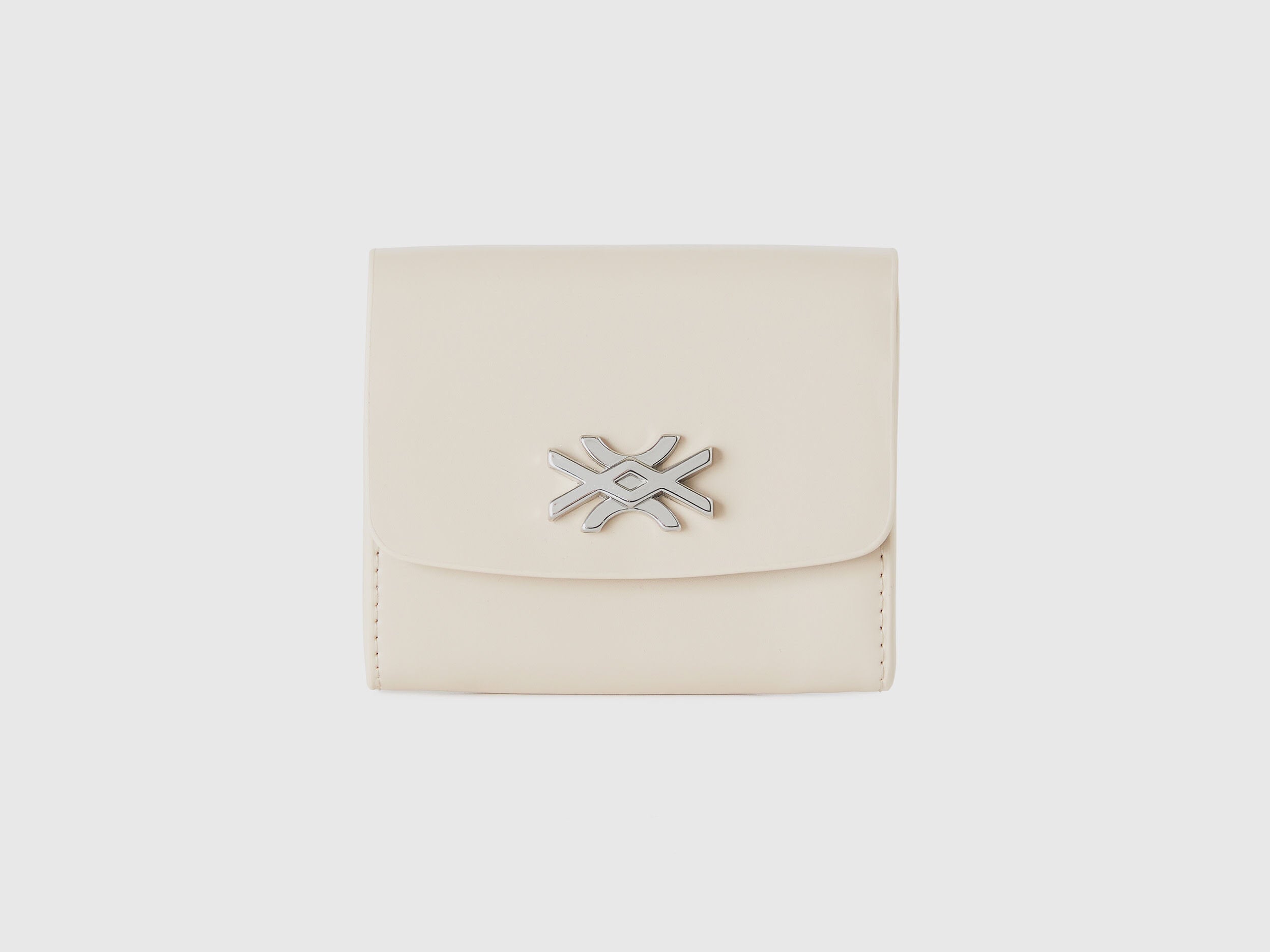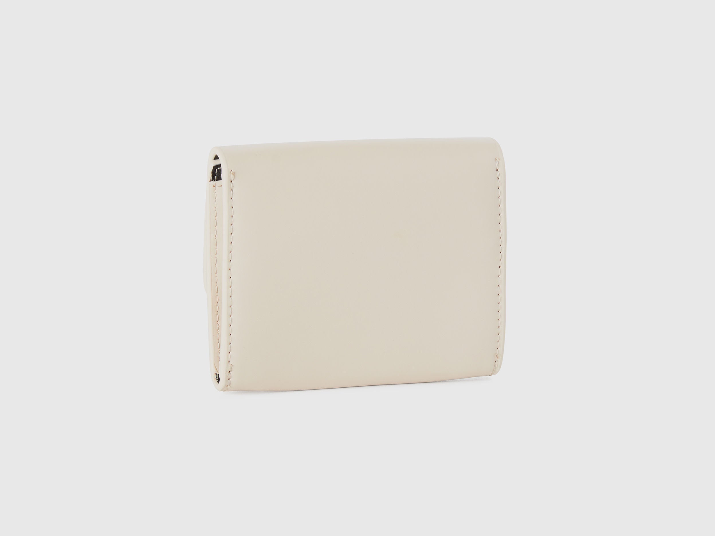 Wallet in smooth imitation leather. Front flap and hidden opening with snap button. Metal logo on the front. Compact, trendy and functional.